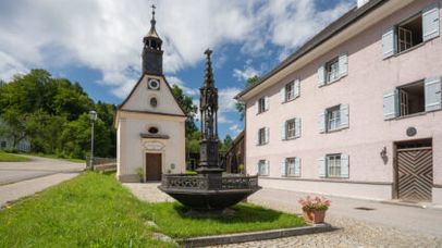 Wer zum Kneippbecken in Anger möchte, fährt erst einmal durch das „schönste Dorf Bayerns“. So hat die Gemeinde zumindest König Ludwig I genannt, weil er den Dorfplatz und die hohe Säule mit Marienfigur und Jesuskind in der Mitte besonders prächtig fand. Das schöne Panorama der Berchtesgadener Berge wird sein übriges getan haben. Zurück zum Kneippen: Das Wasserbecken liegt in einem lauschigen, schattigen Eck, zu zwei Seiten eingesäumt durch Hecken und den Waldrand. Die schmale Straße vom Dorfplatz zum Höglwörther See führt direkt vorbei. Fahren dürfen hier nur Anwohner, weshalb mehr Radl, als motorisierte Fahrzeuge unterwegs sind. Im Hintergrund liegt das Untersberg-Massiv majestätisch zwischen dem Salzburger und Berchtesgadener Land. Drüben liegen die Wiesen und Felder der idyllischen Rupertiwinkel-Bauernhöfe.