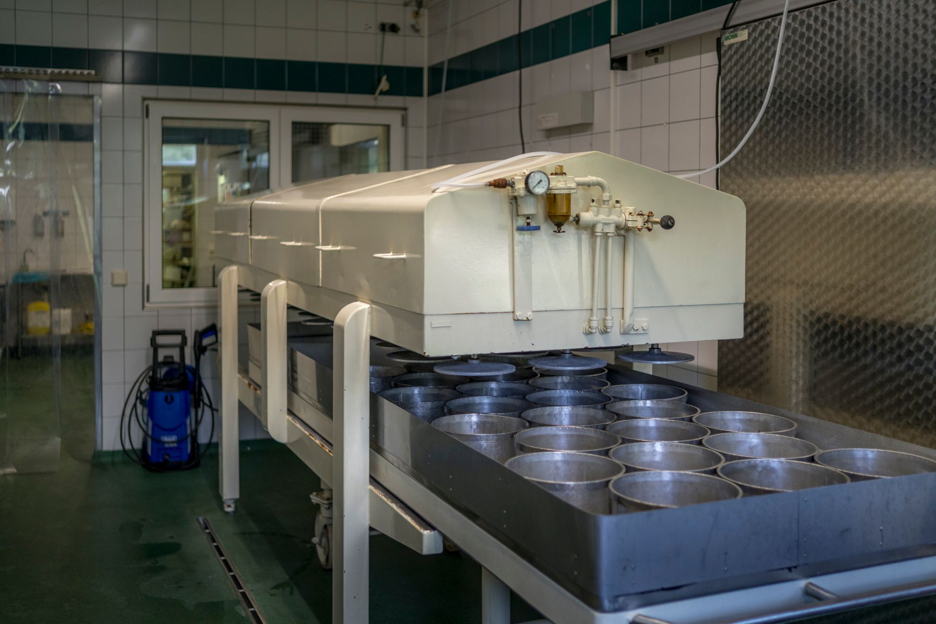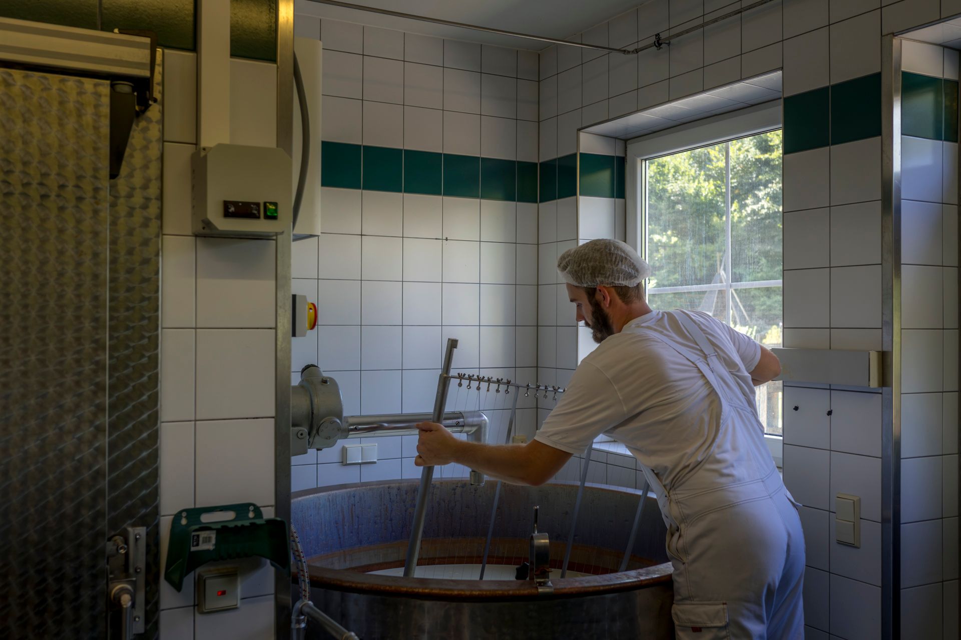 Mithilfe der „Dicken Berta“, einer rund 70 Jahre alten Käsepresse aus Holland, nimmt der von der Molke getrennte Käsebruch dann seine Form an, bevor er ins Salzbad und anschließend in den Reifekeller wandert.