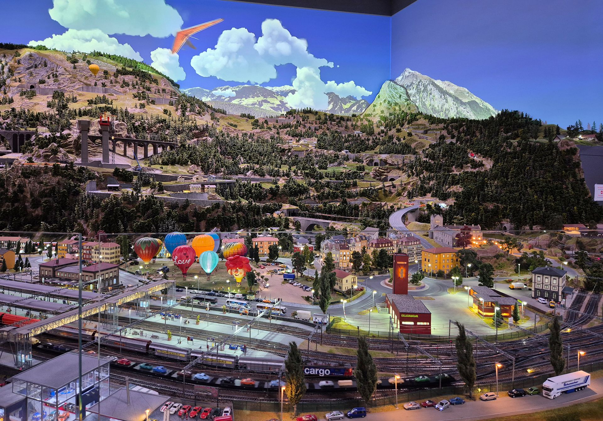 Auf der riesigen Fläche bereisen wir Landschaften von Norddeutschland bis nach Bayern und Österreich. 200 Züge sind auf 2,7 Kilometer Gleis rastlos unterwegs, 540 Weichen, 176 Signale und 80.000 Bäume wurden verbaut. Stundenlang könnten wir Neues in den grandiosen Landschaften entdecken: Bogenförmige Eisenbahnbrücken, steile Wasserfälle, die Märchenlandschaft mit Rapunzel, Schlümpfe am Alpenbach oder die morgendliche Müllabfuhr. Wir fühlen uns wie Beobachter einer Parallelwelt im Mini-Format. Einer heilen Welt. Einer Traumwelt.