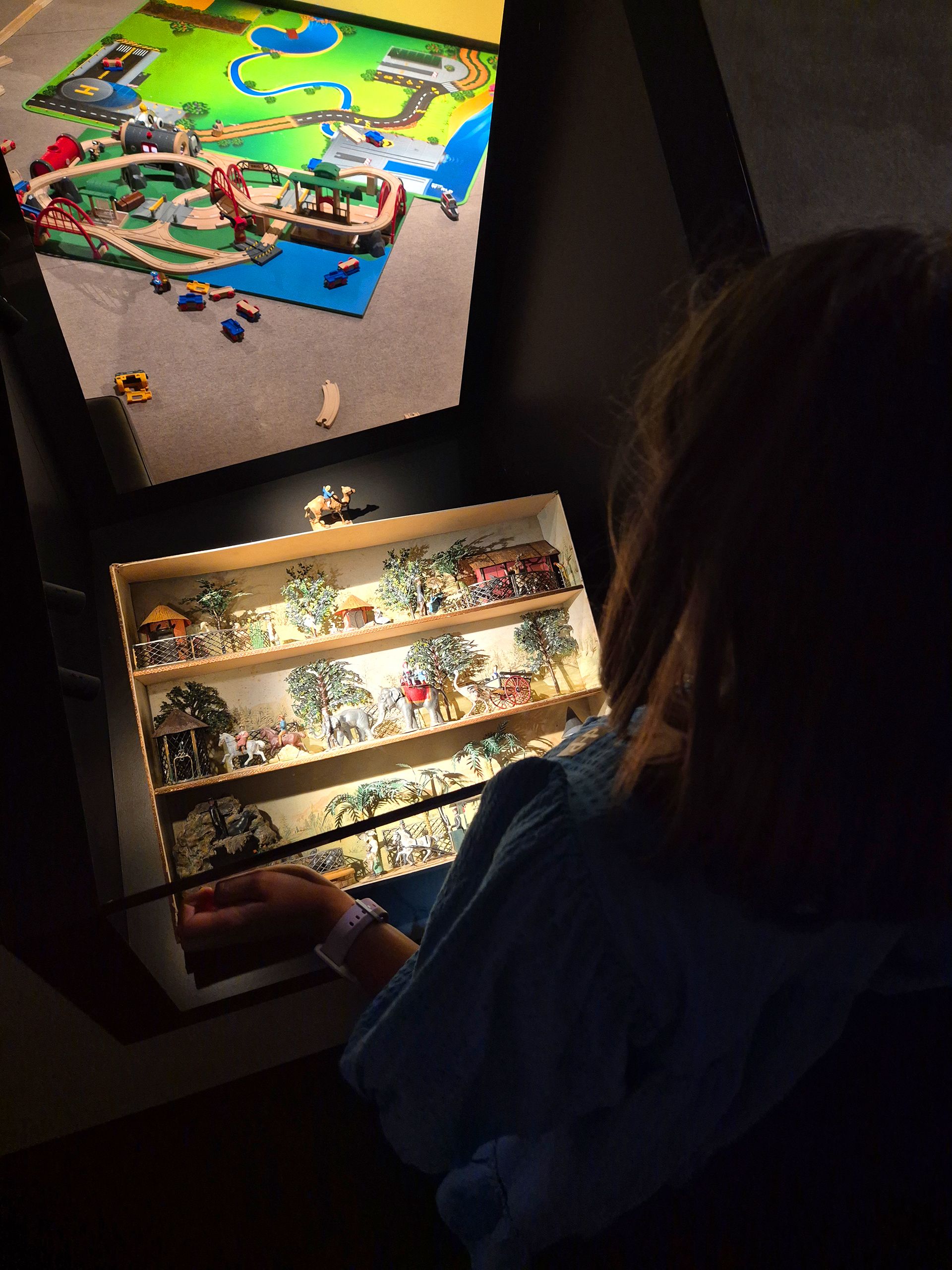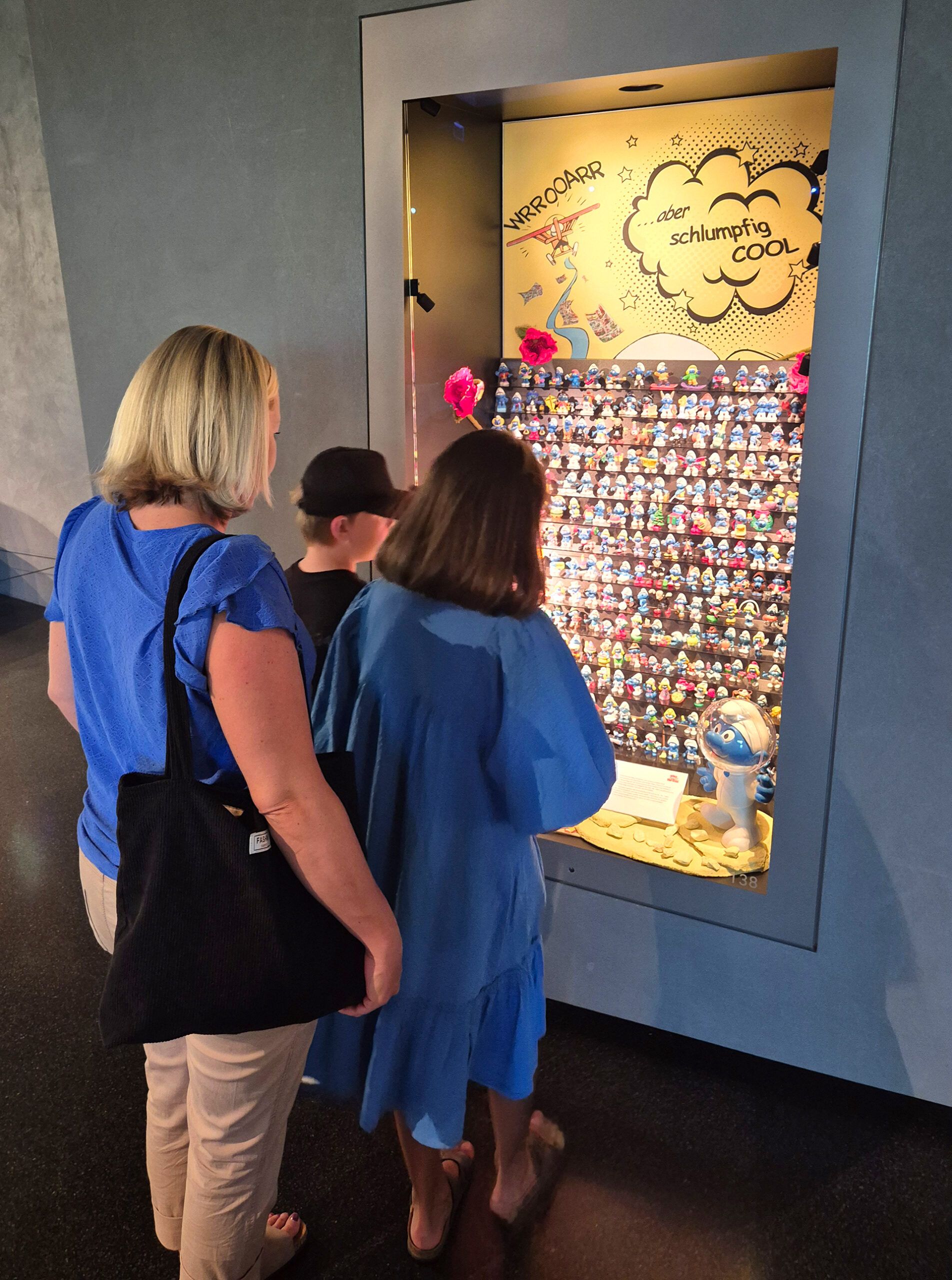 Im Obergeschoss kommen wir aus dem Staunen nicht heraus. Die historischen Blechspielzeuge sind perfekt erhalten – manche lassen sich mit heutigen Playmobil-Packungen vergleichen, andere entlocken uns ein Schmunzeln über altmodische Darstellungen. Ein überlebensgroßer Meister Petz lädt in eine künstliche Höhle ein, eine U-Boot-Fassade mit Filmprojektionen in den großen Bullaugen entführt uns in die Tiefsee, und eine Schlumpf-Sammlung winkt hinter der Scheibe.