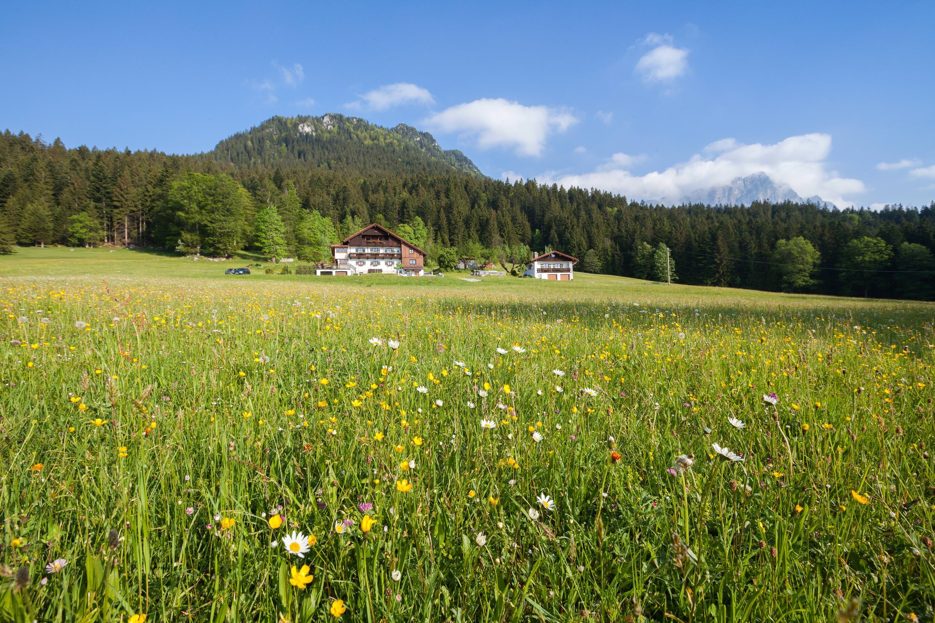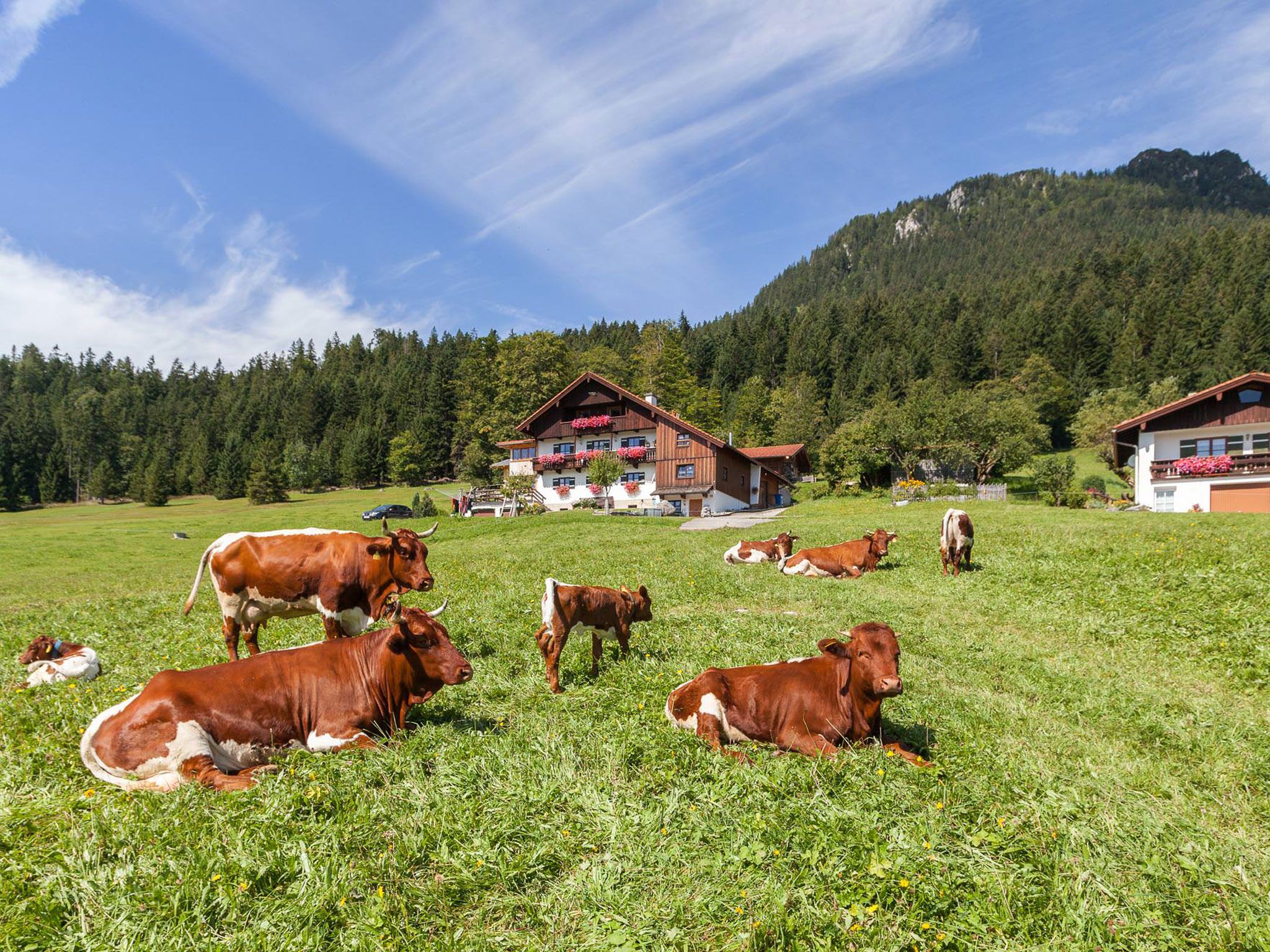 Our small vacation cottage is situated in a quiet and sunny secluded location, surrounded by the Berchtesgaden mountains. It has been lovingly furnished in country style with wooden floors and ceilings as well as a tiled stove and very good small equipment. The cottage consists of two bedrooms, living room, kitchen, bathroom and separate toilet, hallway, storage room, a balcony and a terrace with garden furniture and deck chairs. The cottage tempts to a romantic vacation for two or a relaxing family vacation. Your children can play and romp undisturbed in the great outdoors. Our small farm with mother cow husbandry entices your children to marvel and watch or to lend a hand themselves. Our house also invites the active vacationer. Directly in front of it hikes, mountain and climbing tours (new via ferrata) lead to an eventful vacation day. Our three restaurants in Maria Gern can be easily reached by an evening walk or by one of your hikes or mountain tours. For information about hikes, mountain and climbing tours we are of course at your disposal.