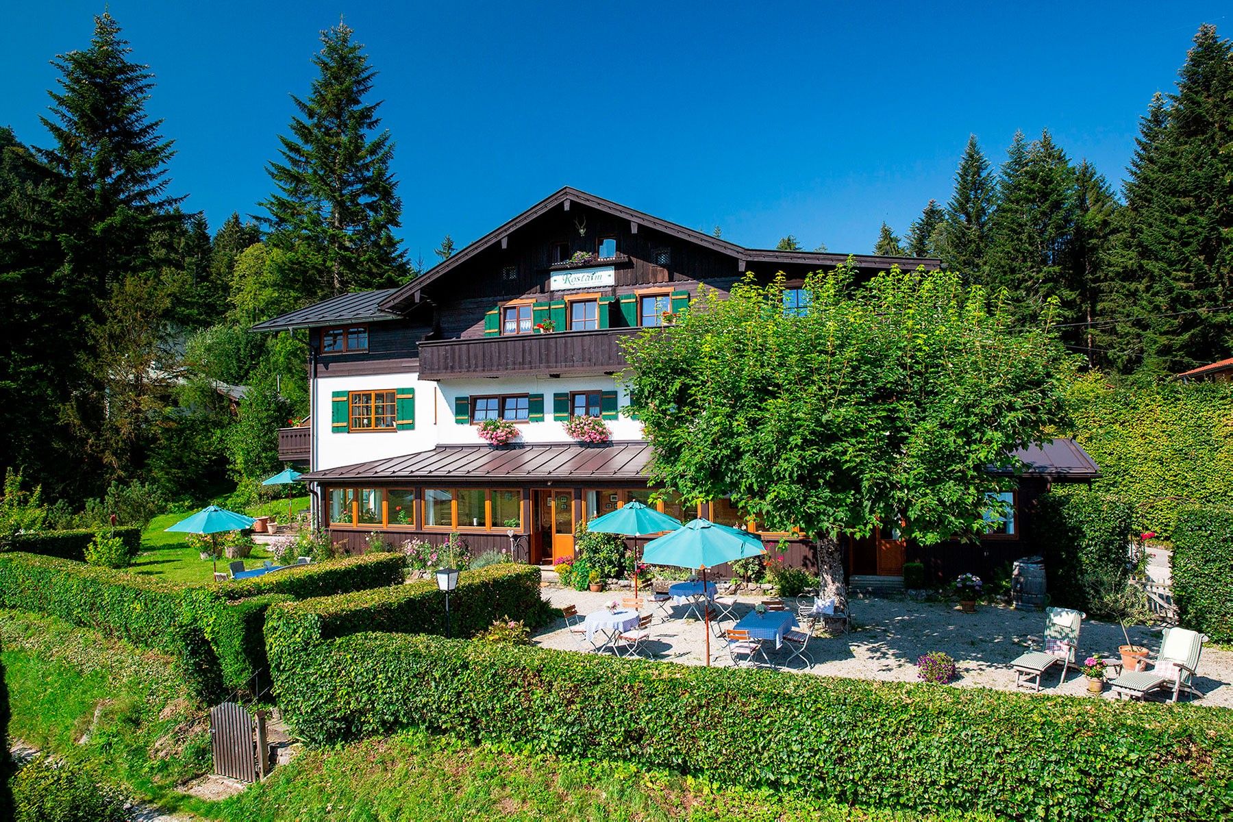 Do you long for a relaxing vacation in the greenery? With a magnificent mountain view and many leisure opportunities? Then you are right with us in the Rostalm! Experience our unique location far away from noise and hustle and bustle. The Rostalm is located 1.2 km from the marketplace and allows you to stay in a quiet location. And yet you can reach the picturesque town center of Berchtesgaden within just a few minutes. Hospitality and hospitability are our top priorities - and have been for more than 100 years. The Rostalm has lovingly furnished rooms and vacation apartments with magnificent panoramic views. Our idyllic Rostalm guarantees you a vacation full of relaxation, peace and cordiality in the midst of the beautiful Berchtesgaden alpine landscape. We look forward to welcoming you as guests in our house.