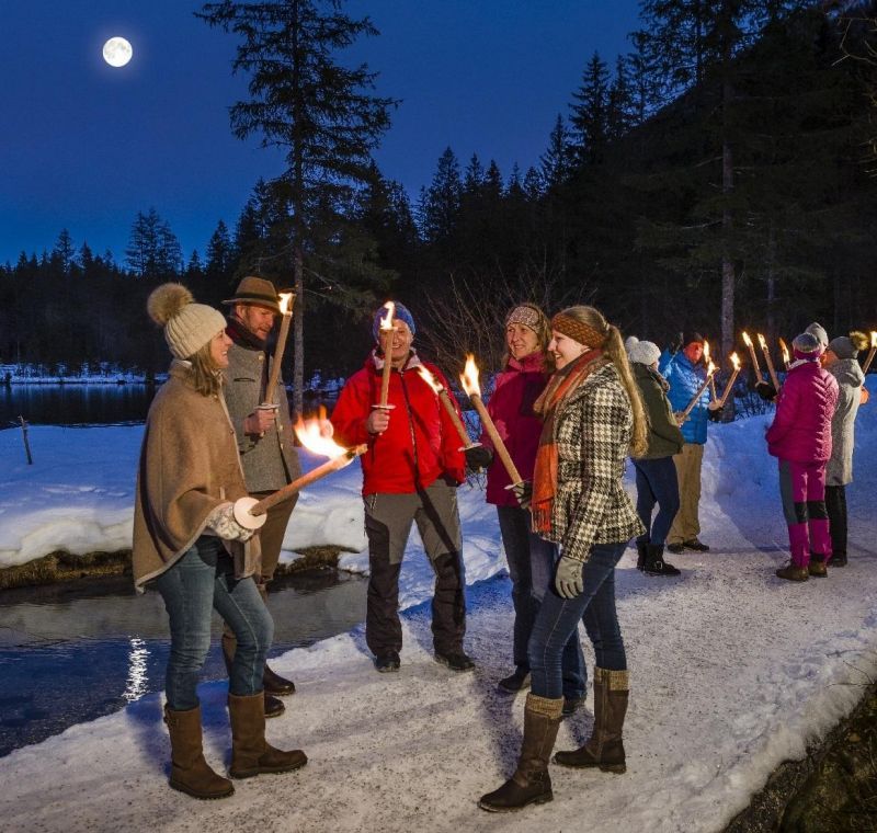 Mit Fackelschein wandern Sie besonders eindrucksvoll durch die abendliche Winterlandschaft um den Hintersee beim Bergsteigerdorf Ramsau.