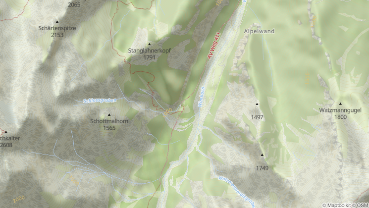 Von der Wimbachbrücke führt der AV-Weg 641 relativ flach zum Wimbachschloss. Am Anfang des Weges liegt die Wimbachklamm, eine beeindruckende Schlucht, die man über Stege und Brücken durchqueren kann. Weiter führt der Weg dann zur Wimbachgrieshütte und noch weiter hochalpin in die Berchtesgadener Berge.