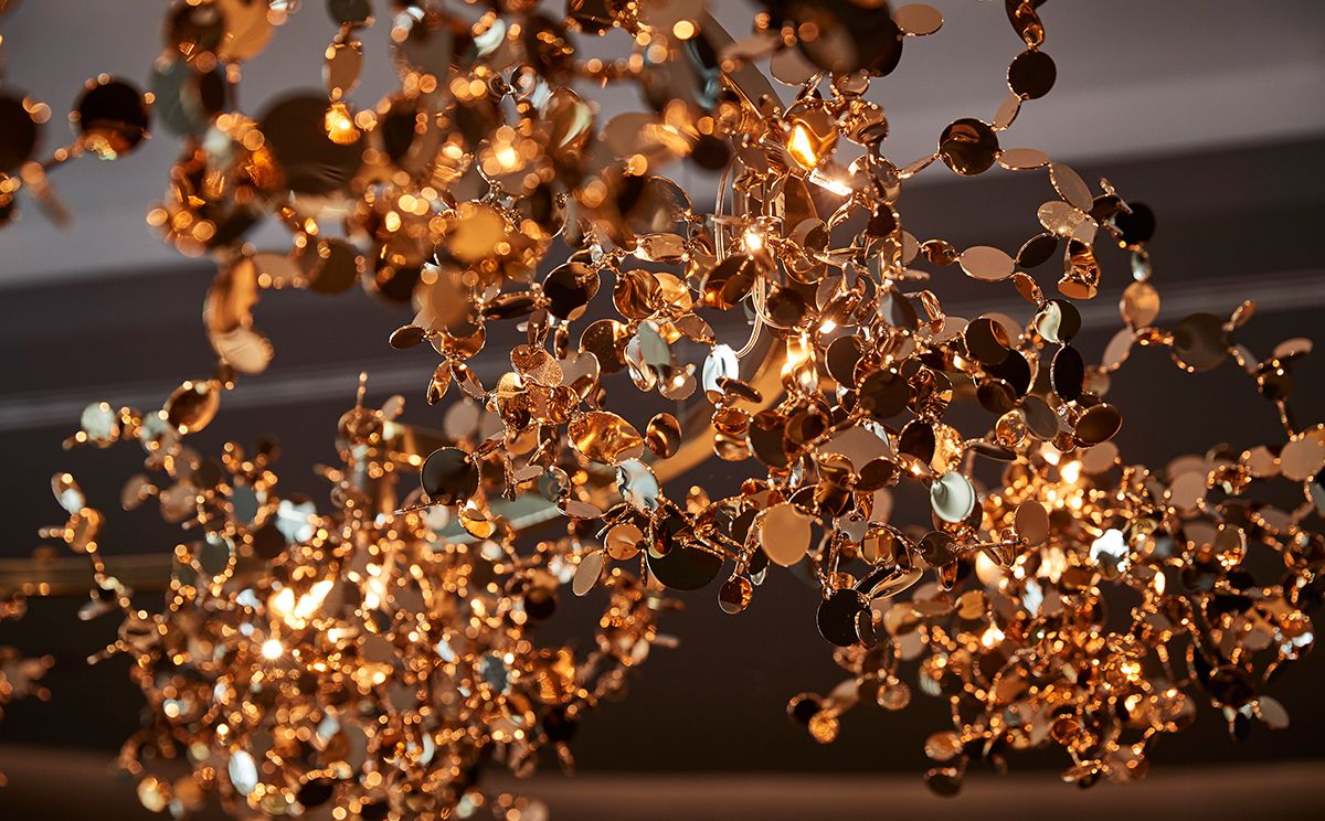Für das neue zeitlose Design zeichnet der Architekt Klaus Sporer verantwortlich, der sich in schmeichelnder Zurückhaltung übt und die Kreationen von Ulrich Heimann und dessen Gäste in den Vordergrund stellt. Durch die graubasierte Farbgestaltung, natürlichen Materialien und das raffinierte Lichtkonzept bietet das Restaurant einen eleganten Rahmen für die Präsentation der Speisen und lässt Raum für die optimale Darstellung der beteiligten Personen. Auf üppige Dekorationselemente wurde verzichtet, stattdessen setzen vor dem grauen Hintergrund alle noch so zarten Farbnuancen in den servierten Gerichten besondere Akzente. Das Zentrum des neugestalteten Restaurants ist der Lüster, den ein goldenes Gesteck umrankt. Das Konzept besticht durch ein ruhiges, schlichtes Design und bietet beim Blick in den runden Raum dennoch allerhand zu entdecken. Die Oberflächen der verwendeten Materialien reichen von rau über matt bis hin zu glatt und hochglänzend und auch die Wände wurden durch eine spezielle Technik lebendig gestaltet: In den Putz wurde ein pulveriges Kupferpigment eingestreut, das je nach Beleuchtung mit unterschiedlichen Färbungen antwortet und eine warme Wohlfühlatmosphäre schafft.