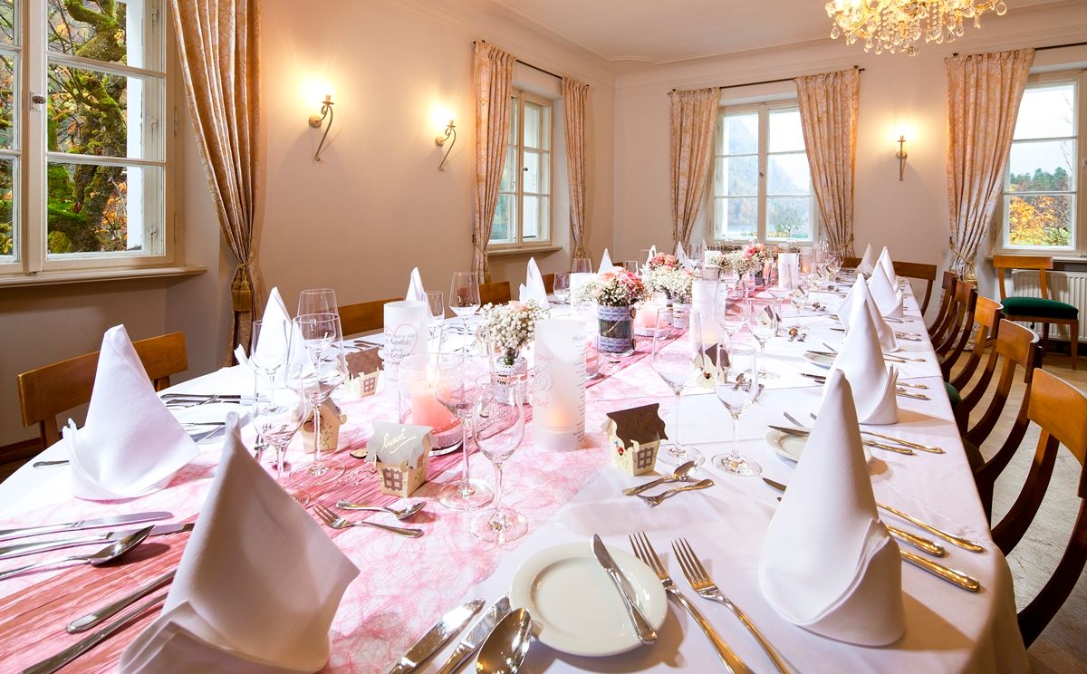 Im ersten Stock bieten die beiden großen Säle mit ihren alten Bildern und majestätischen Trophäen einen großartigen Rahmen für Feiern jeder Art. Es stehen Ihnen dort bis zu 250 Sitzplätze zur Verfügung: Der "Kleine Festsaal" bietet bis zu 80 Sitzplätze, der "Große Festsaal" bis zu 150 Sitzplätze. Und für die schönste Entscheidung im Leben, Ihre Hochzeit, bieten wir Ihnen unser "Königszimmer" an.
