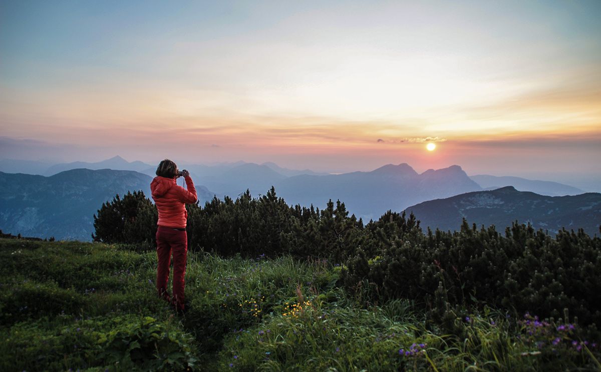 Erleben Sie bei einer Übernachtung auf dem Störhaus einen stimmungsvollen Sonnenuntergang mit Blick auf den Berchtesgadener Hochthron und weit in den Chiemgau.