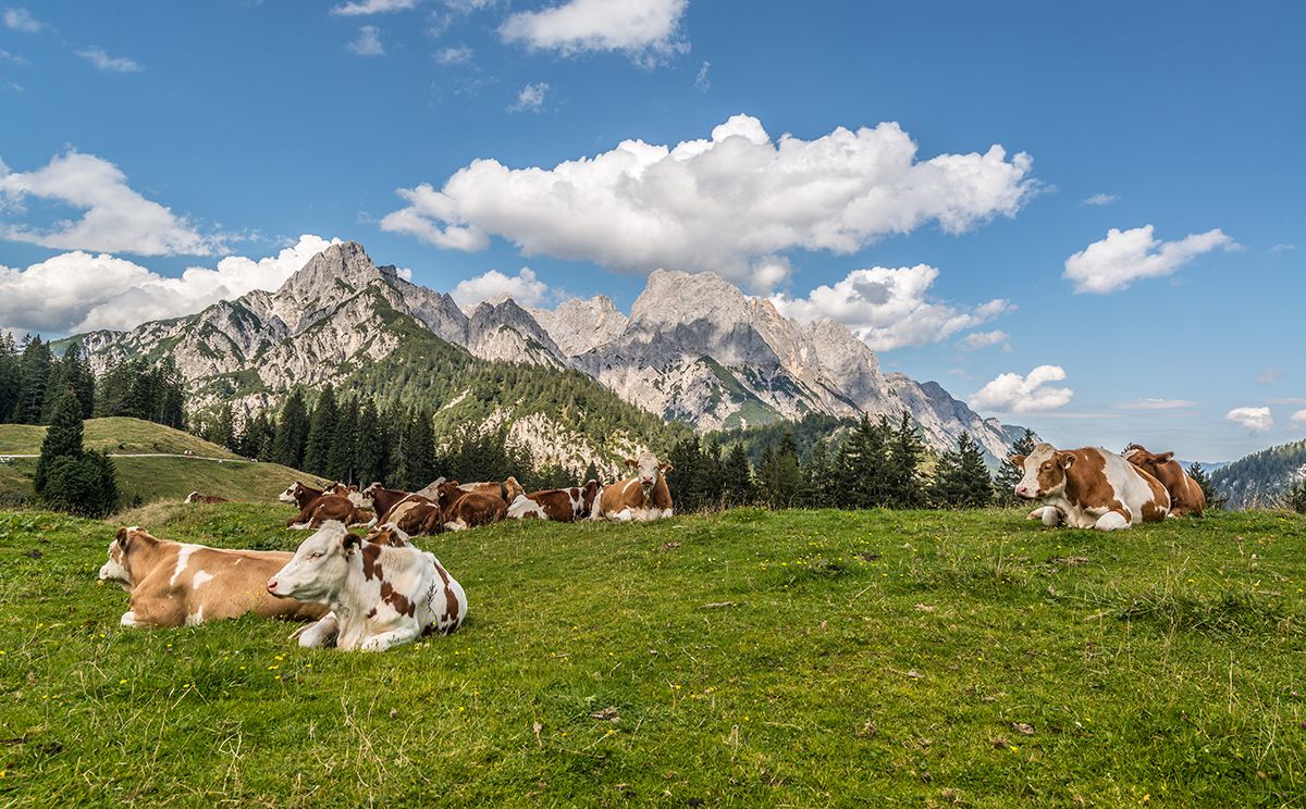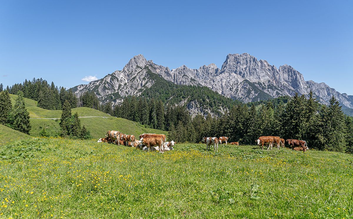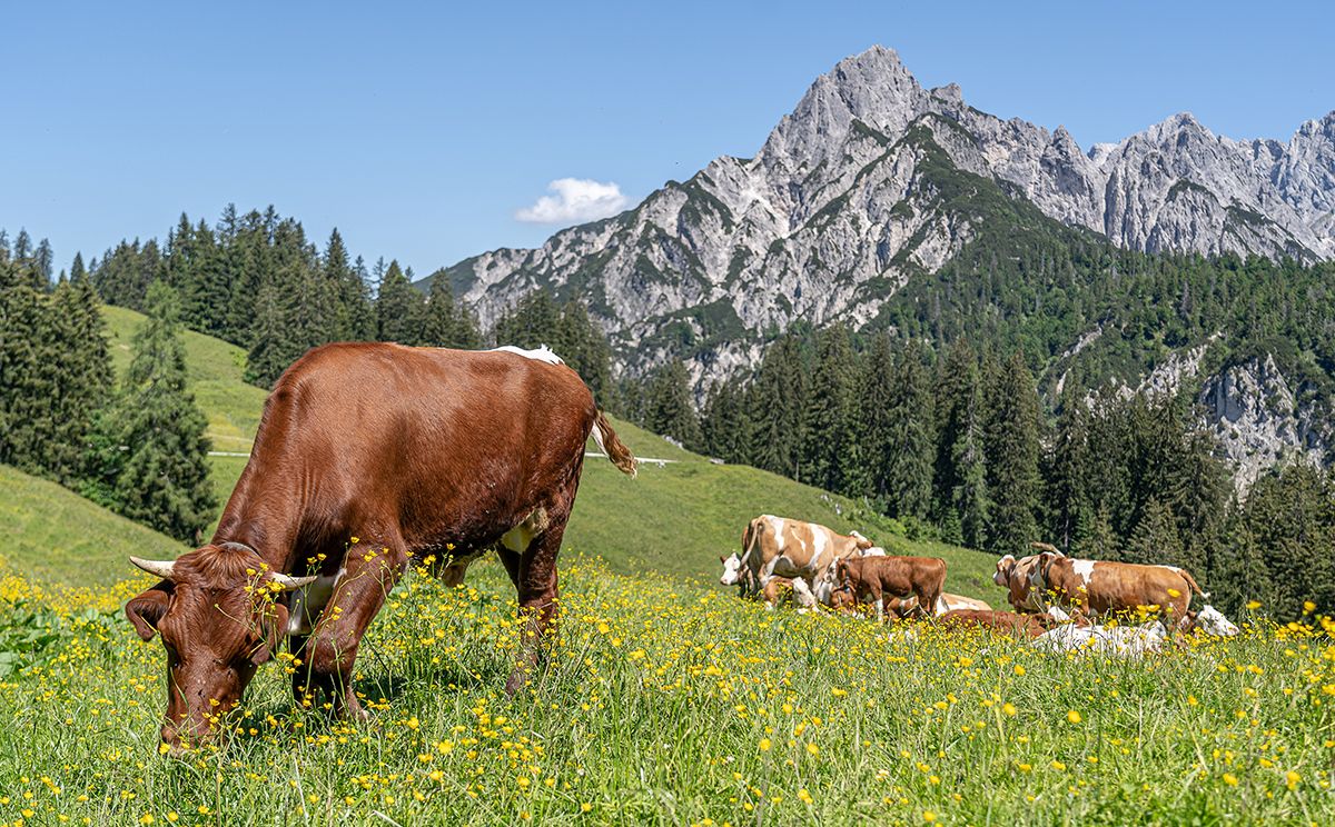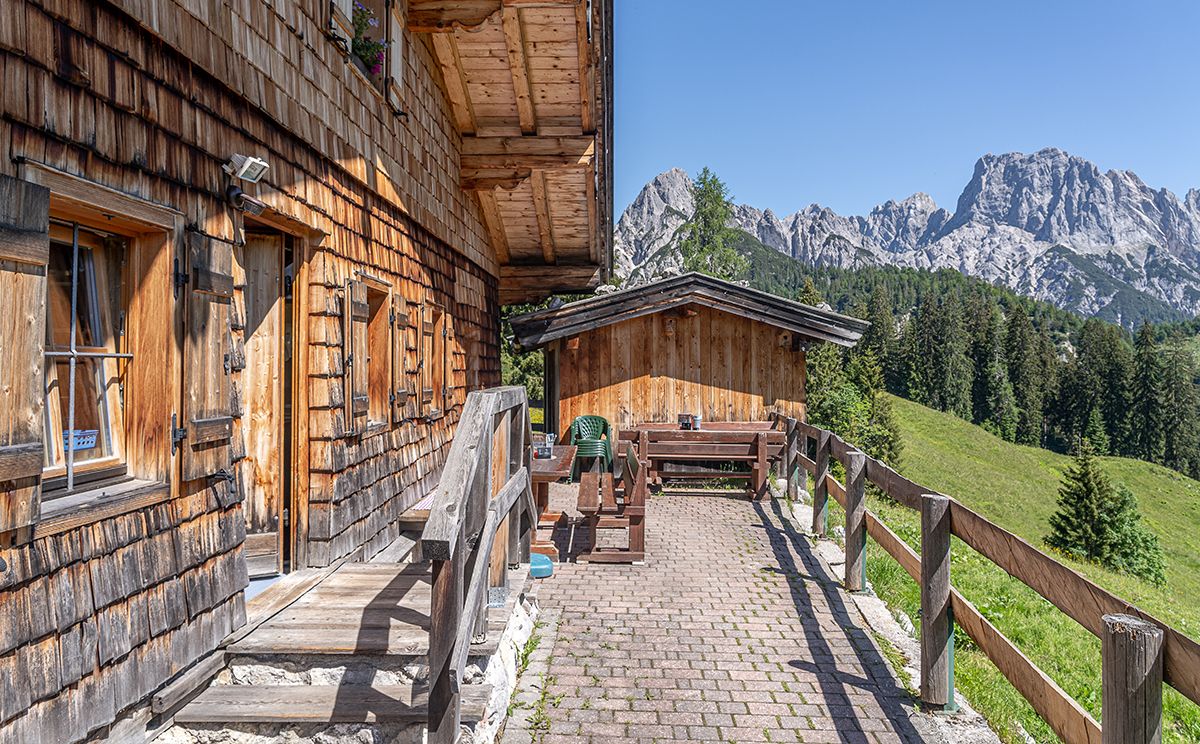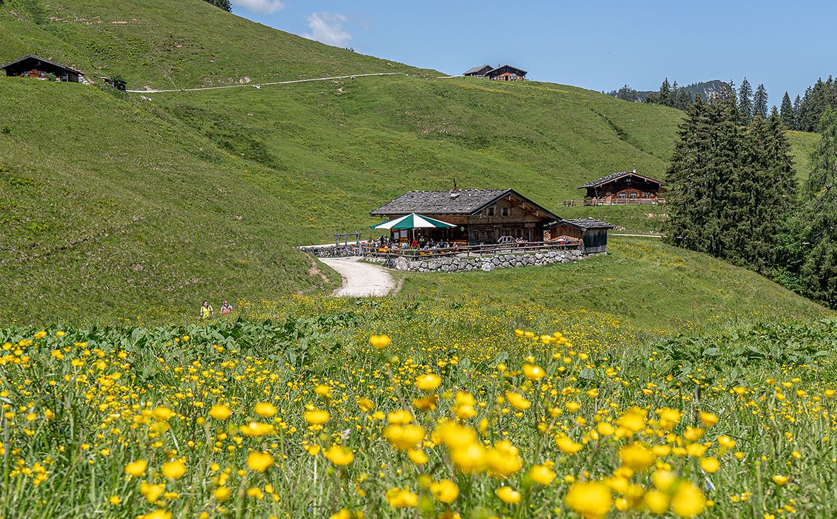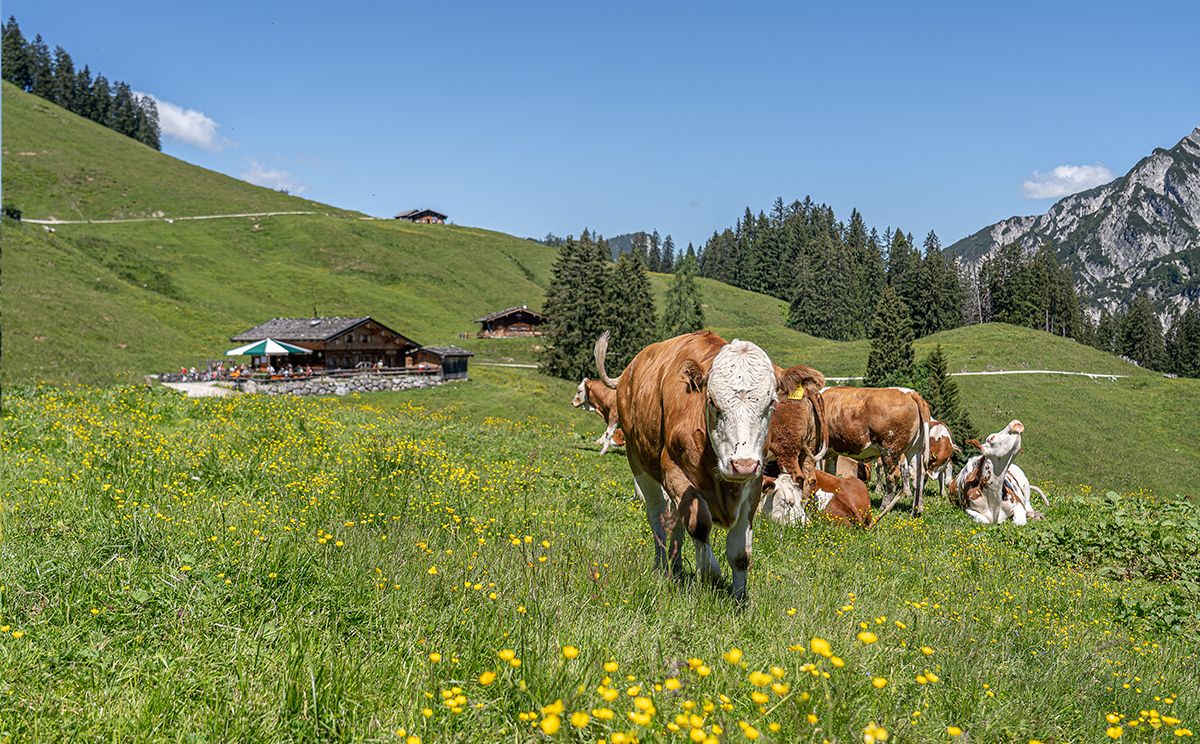 Die österreichische Jausenstation auf der Litzlalm liegt unweit des Hirschbichls vor dem großartigen Panorama der markanten Reiter Alm. Ideales Ziel einer Mountainbike-Tour durch das Klausbachtal.