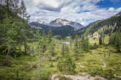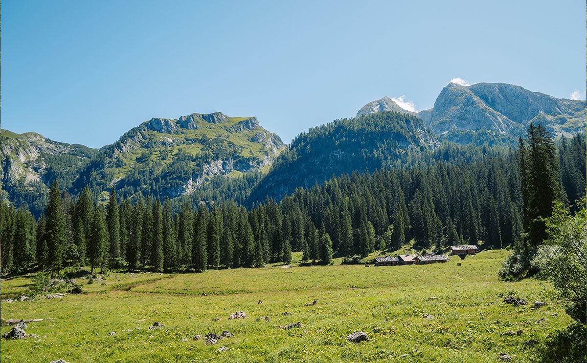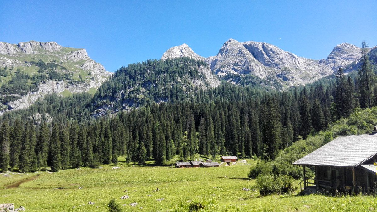 Die Wasseralm liegt in in einem paradiesischem Kessel oberhalb des Obersees zwischen den Teufelshörnern und dem Funtenseetauern. Die kleine Unterkunftshütte im Übergang vom Hagengebirge zum Steinernen Meer ist ein wichtiger Stützpunkt auf der Großn Reibn-Hüttentour.