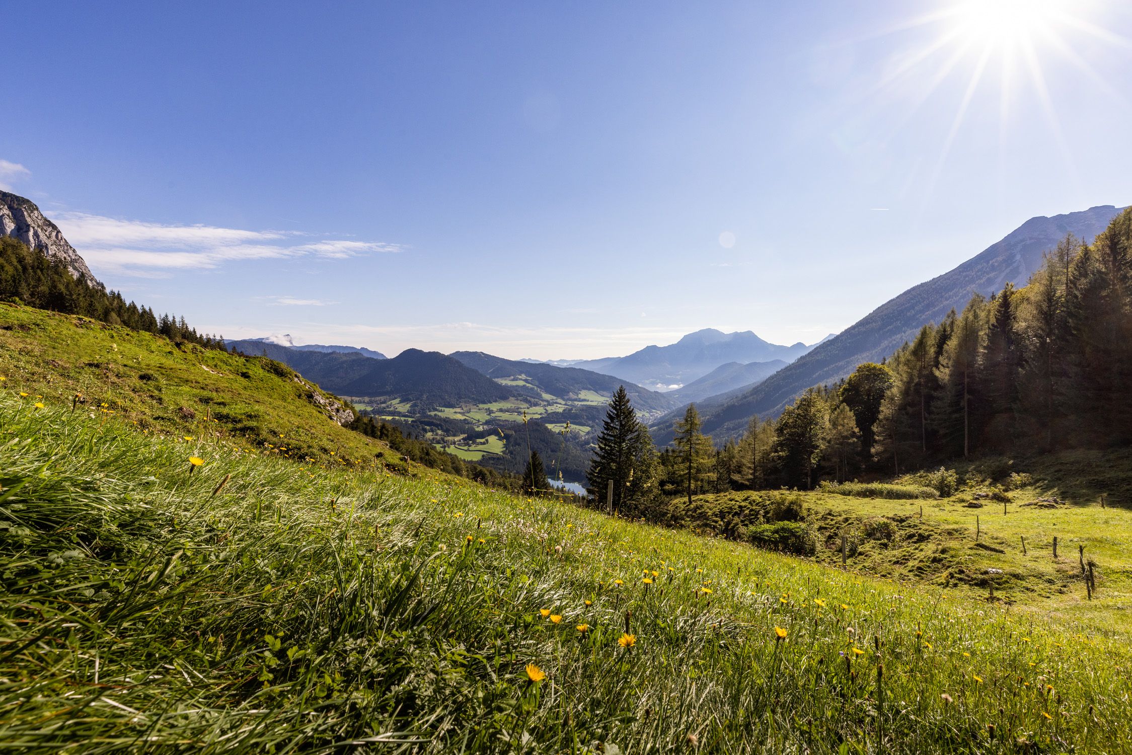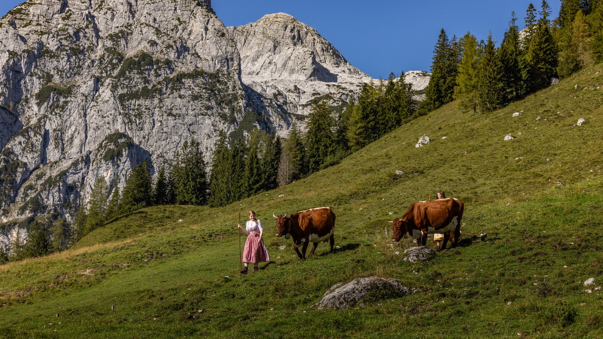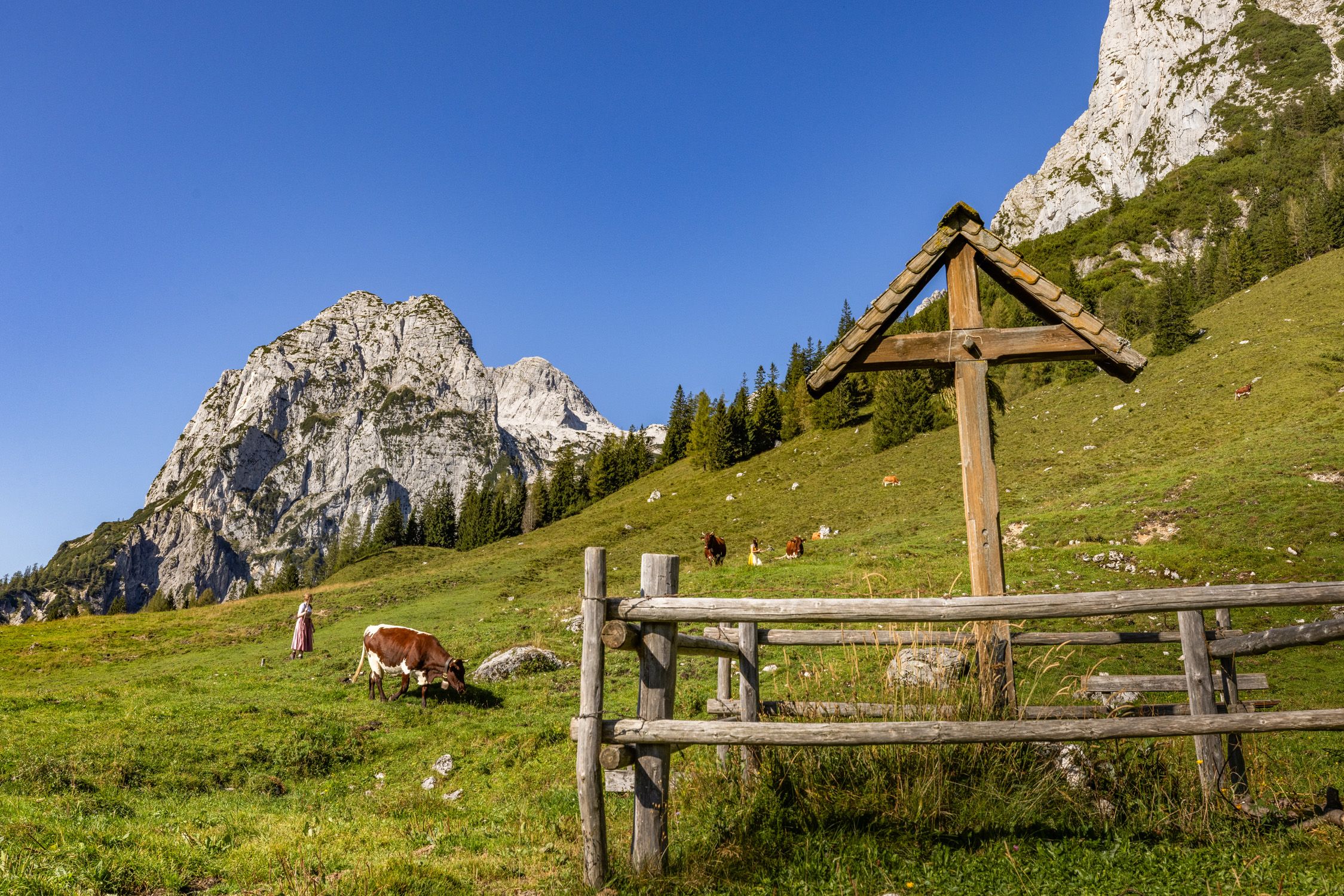 Im Klausbachtal im Nationalpark Berchtesgaden liegt die Halsalm. Durch ihre Lage oberhalb des Hintersees hat man von der Alm einen wunderbaren Blick auf den See und das Ramsauer Tal.