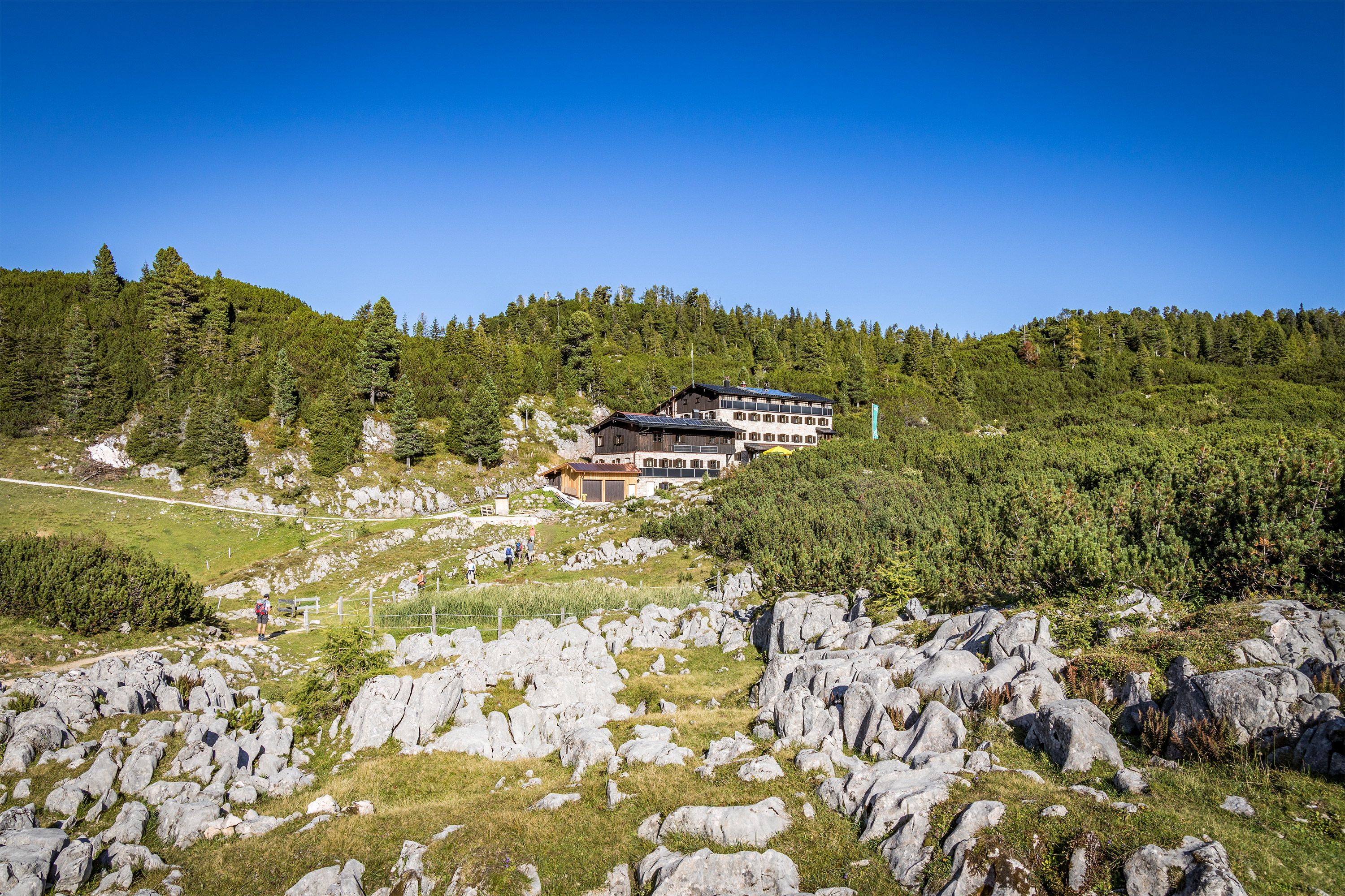 Die Neue Traunsteiner Hütte liegt auf dem wildromantischen Plateau der Reiter Alm und ist das Drehkreuz des vielseitigen Wege- und Tourennetzes im Reiter-Alm-Massiv. Laufend saniert, gilt die Hütte als Vorzeigeobjekt des Deutschen Alpenvereins.