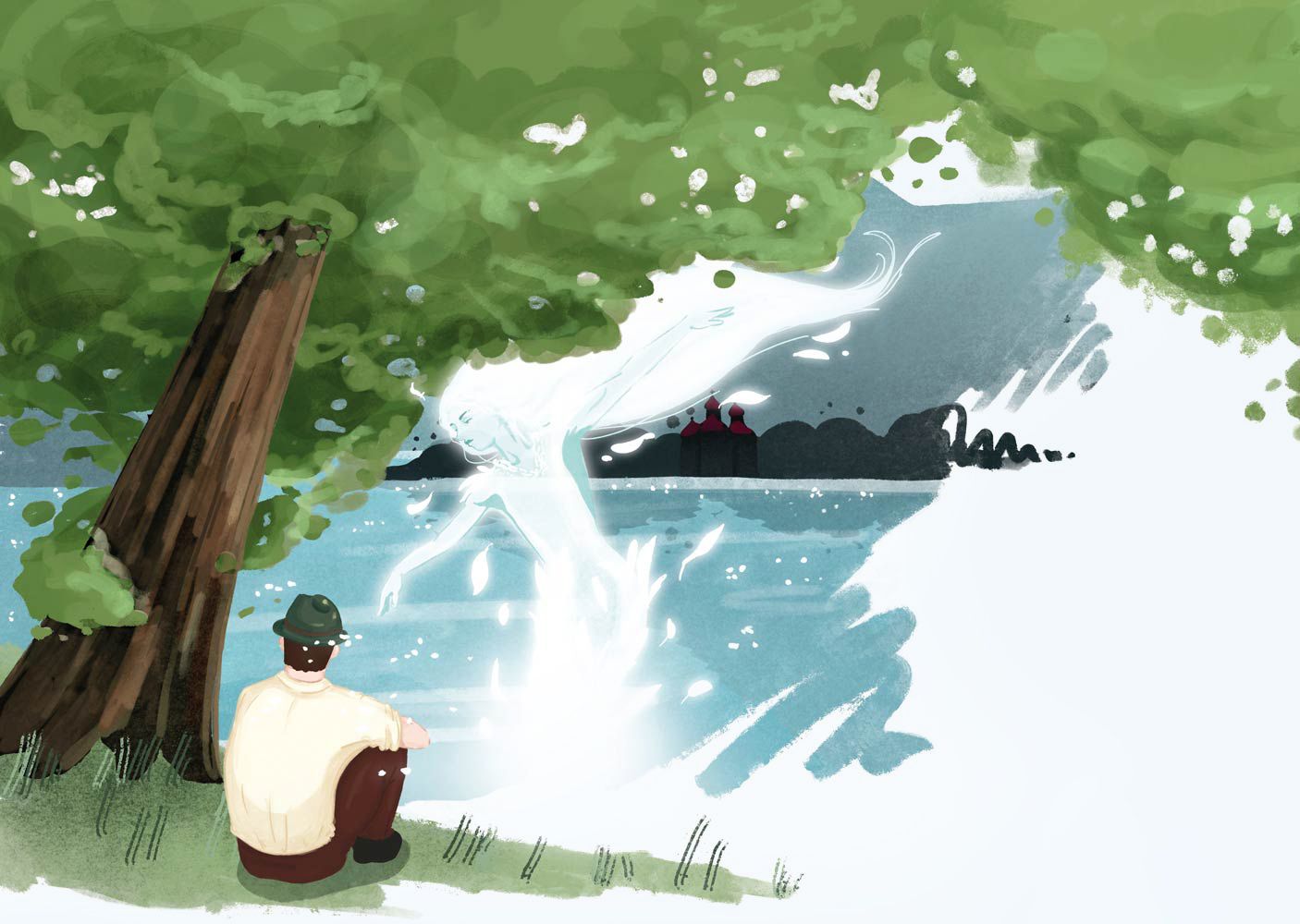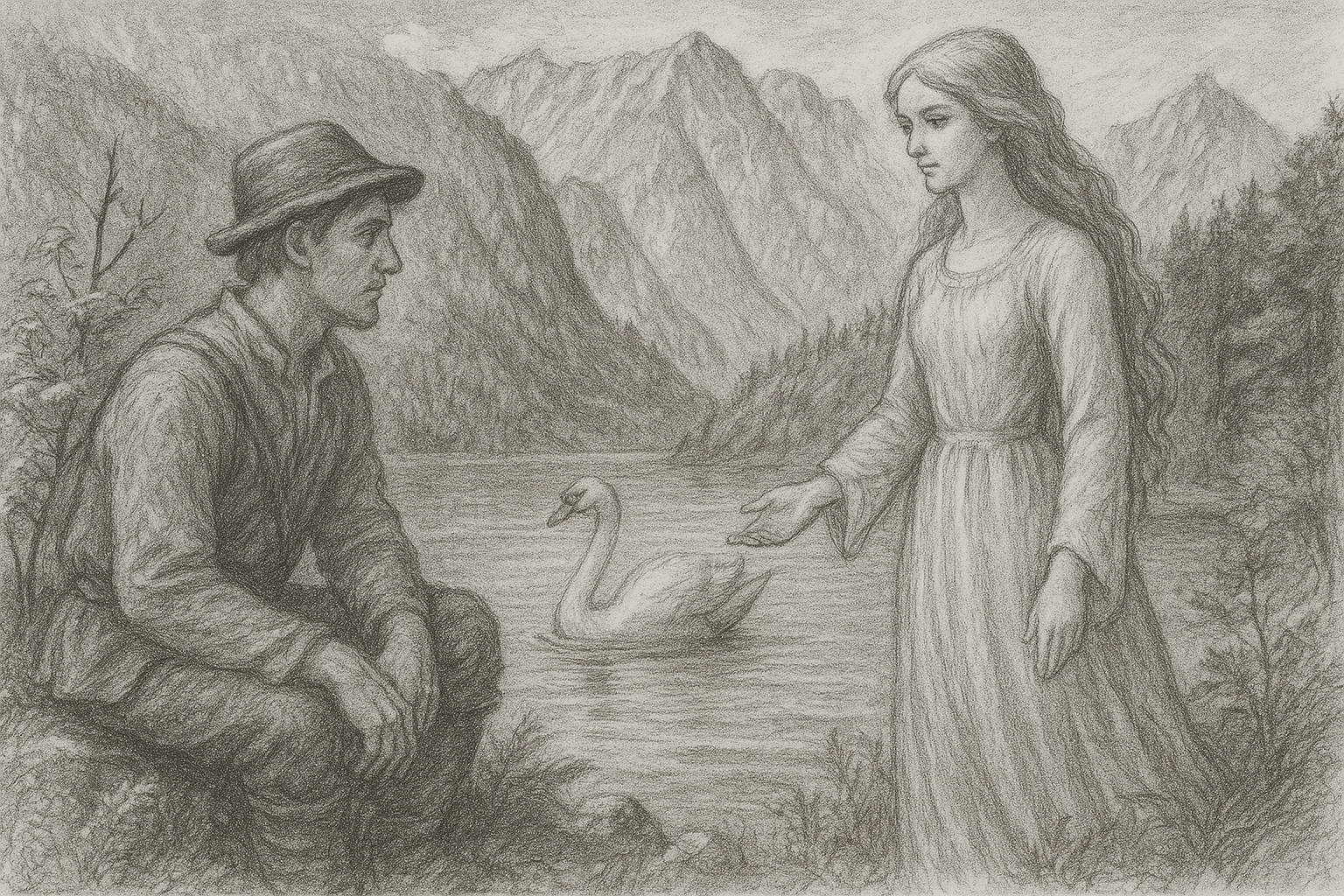 Während er so dasaß, kam auf einmal ein wunderschöner weißer Schwan auf ihn zu geschwommen, der kurz ins Wasser hinab tauchte und als liebreizende Jungfrau im nächsten Augenblick vor ihm stand.