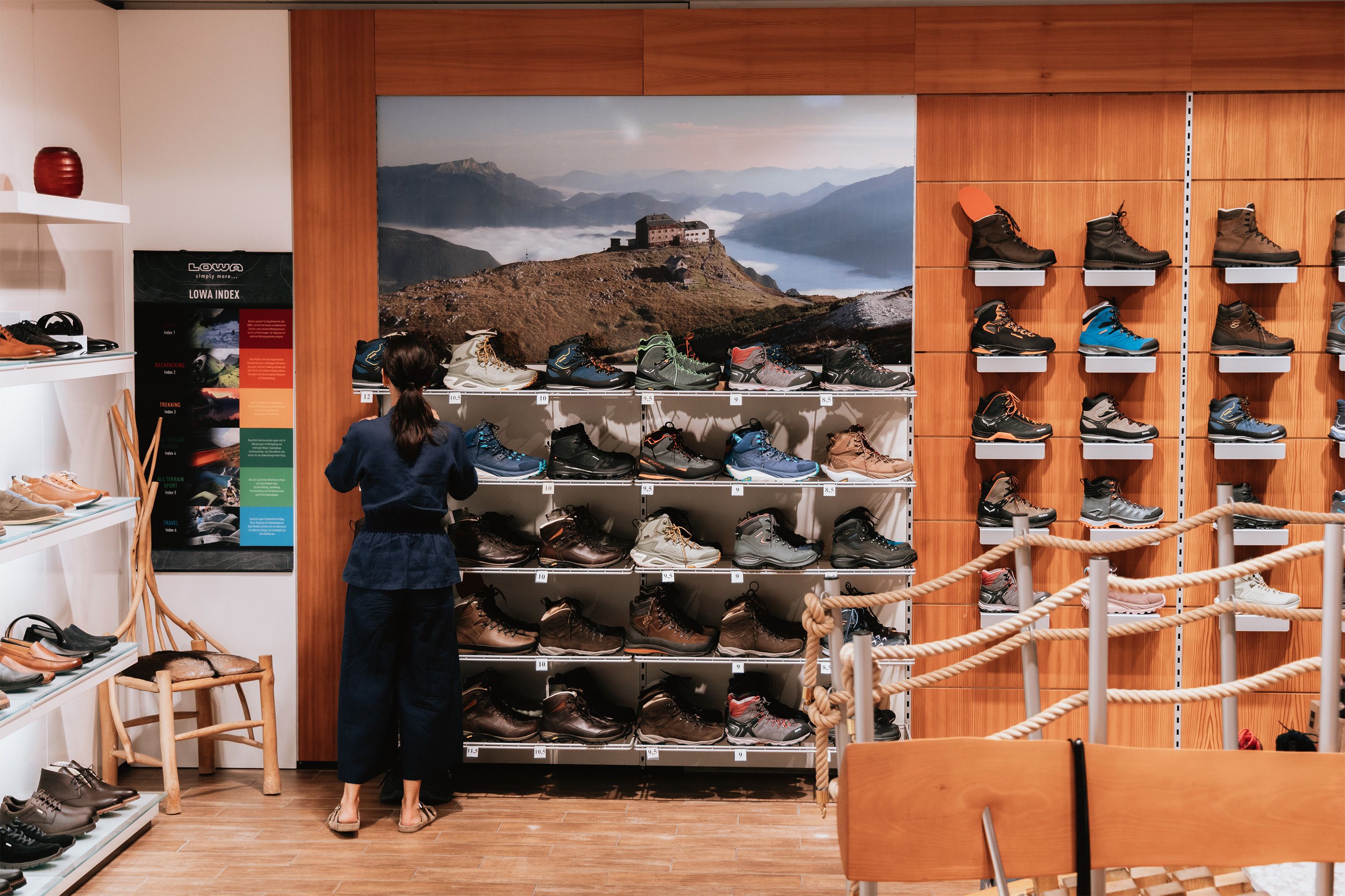 Im Untergeschoss findest du mit der richtigen Beratung durch die Mitarbeiterinnen deine neuen Outdoorschuhe, die du auf der Teststrecke gleich auf Festigkeit und Stabilität prüfen kannst. Komplettiert wird das Angebot durch Trekkingaccessoires wie Stöcke, Rucksäcke, unterstützende Einlegesohlen und Trinkflaschen.