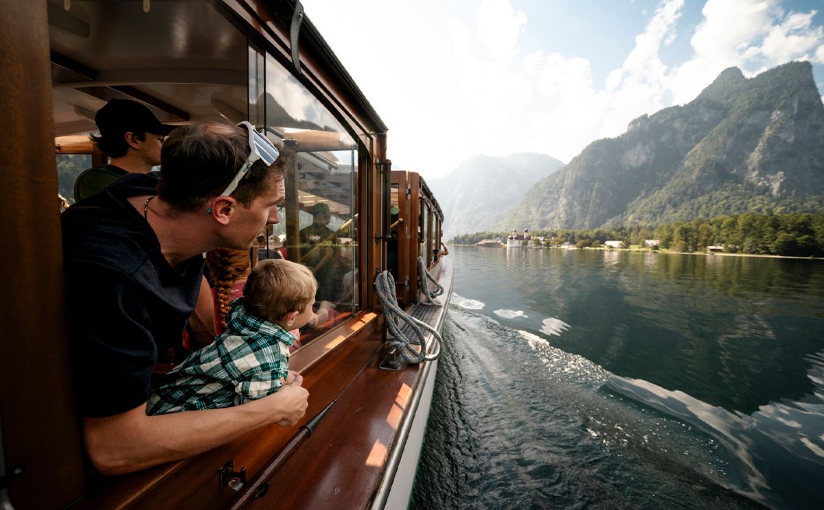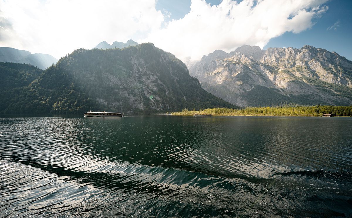 Geräuschlos gleitet das Elektroboot der Königssee Schifffahrt über den fjordartigen See - Smaragdgrünes Wasser glitzert in der Sonne, der Himmel leuchtet weiß-blau, während das Trompeten-Echo eindrucksvoll widerhallt. Umgeben von den Bergen des einzigen Alpen-Nationalparks und der mächtigen Kulisse der Watzmann-Ostwand ist die Schiffsfahrt über den Königssee im Sommer und im Winter ein unvergessliches Erlebnis.