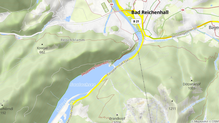 Der Saalachsee ist ein Stausee in Kibling bei Bad Reichenhall, der von der bis zu 13 Meter hohen und 130 Meter langen Saalach-Staumauer aufgestaut wird. Baden ist im Saalachsee nicht erlaubt, aber die Wege um den See sind ein beliebtes Ziel für Wanderer und Radfahrer aus der Alpenstadt.