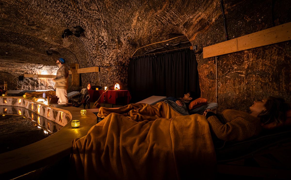 Doch auch bei Krankheiten "psychosomatischer Herkunft" können in dem ganzjährig zwölf Grad kühlen, ruhigen Stollen mit salzhaltiger Luft positive Effekte erzielt werden. Auf jeden Fall ist man im Untertage-Paradies garantiert sicher vor elektromagnetischer Strahlung, Pollen und Feinstaub. Genieße die meditative Stimmung, eingehüllt in eine wärmende Decke auf einer bequemen Liege bei sanfter Beleuchtung und leichtem Plätschern des Solebrunnens.