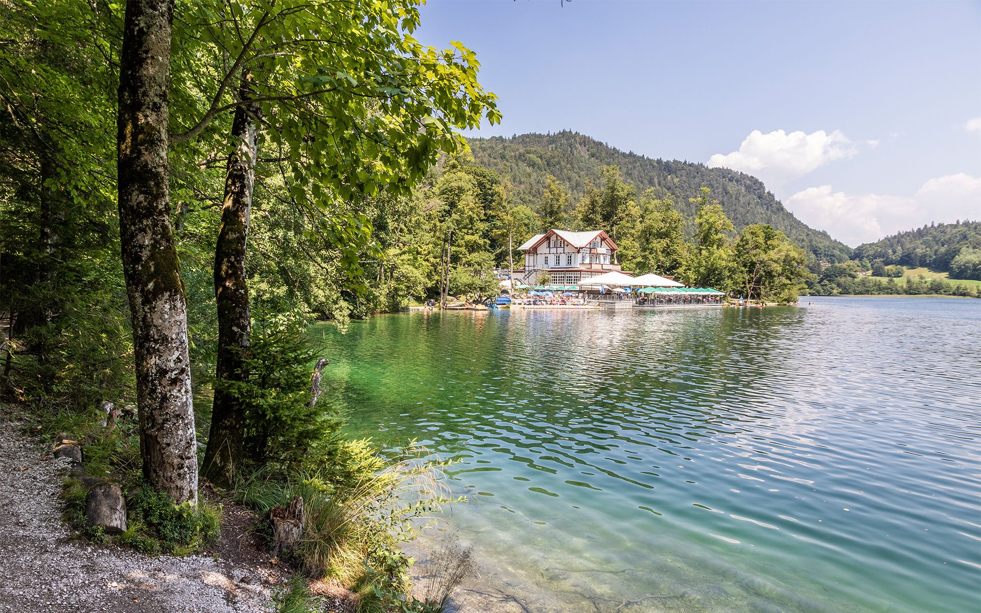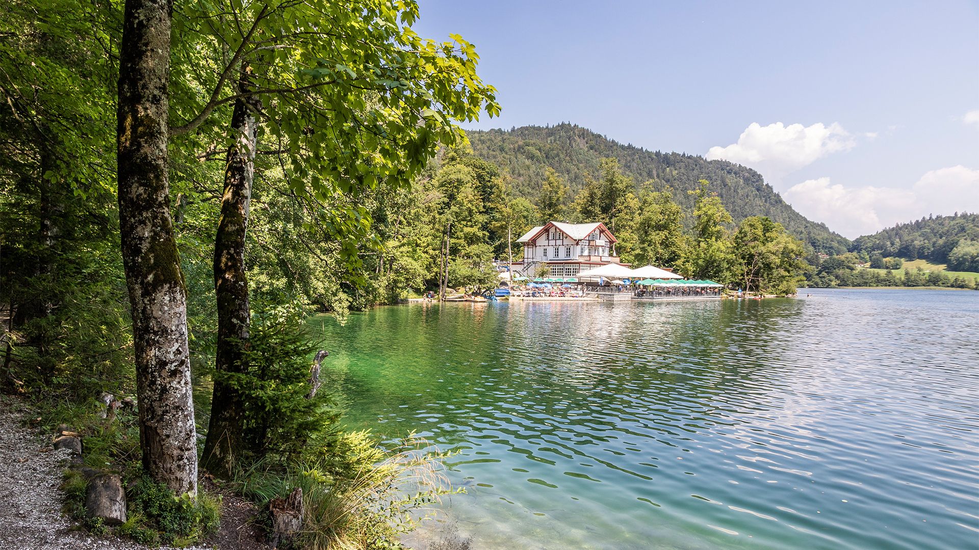 Direkt am Ufer des Thumsees liegt der Seewirt. Seine Terrasse reicht direkt an das Wasser.