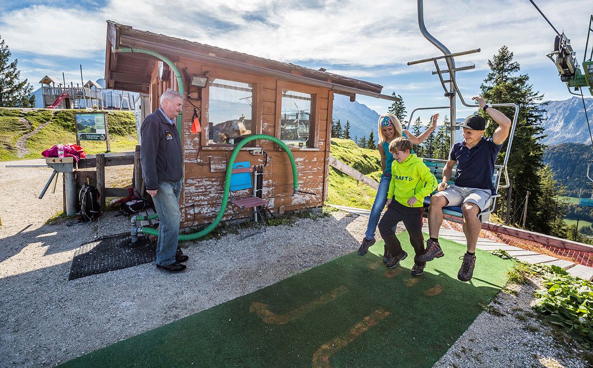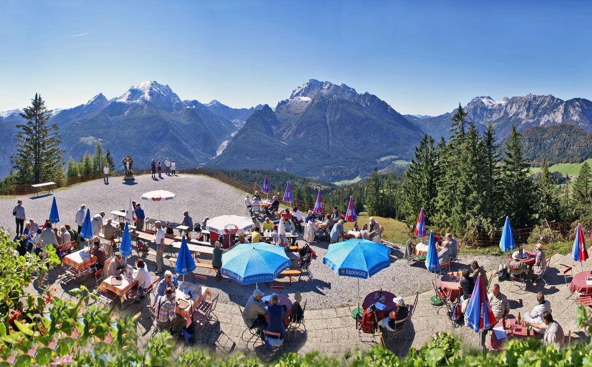 Das mit der Hirscheckbahn erschlossene Hochplateau oberhalb des Bergsteigerdorfes Ramsau lädt zum Sonnen auf der Terrasse der Berggaststätte Hirschkaser und zum Wandern vor großartiger Bergkulisse ein.