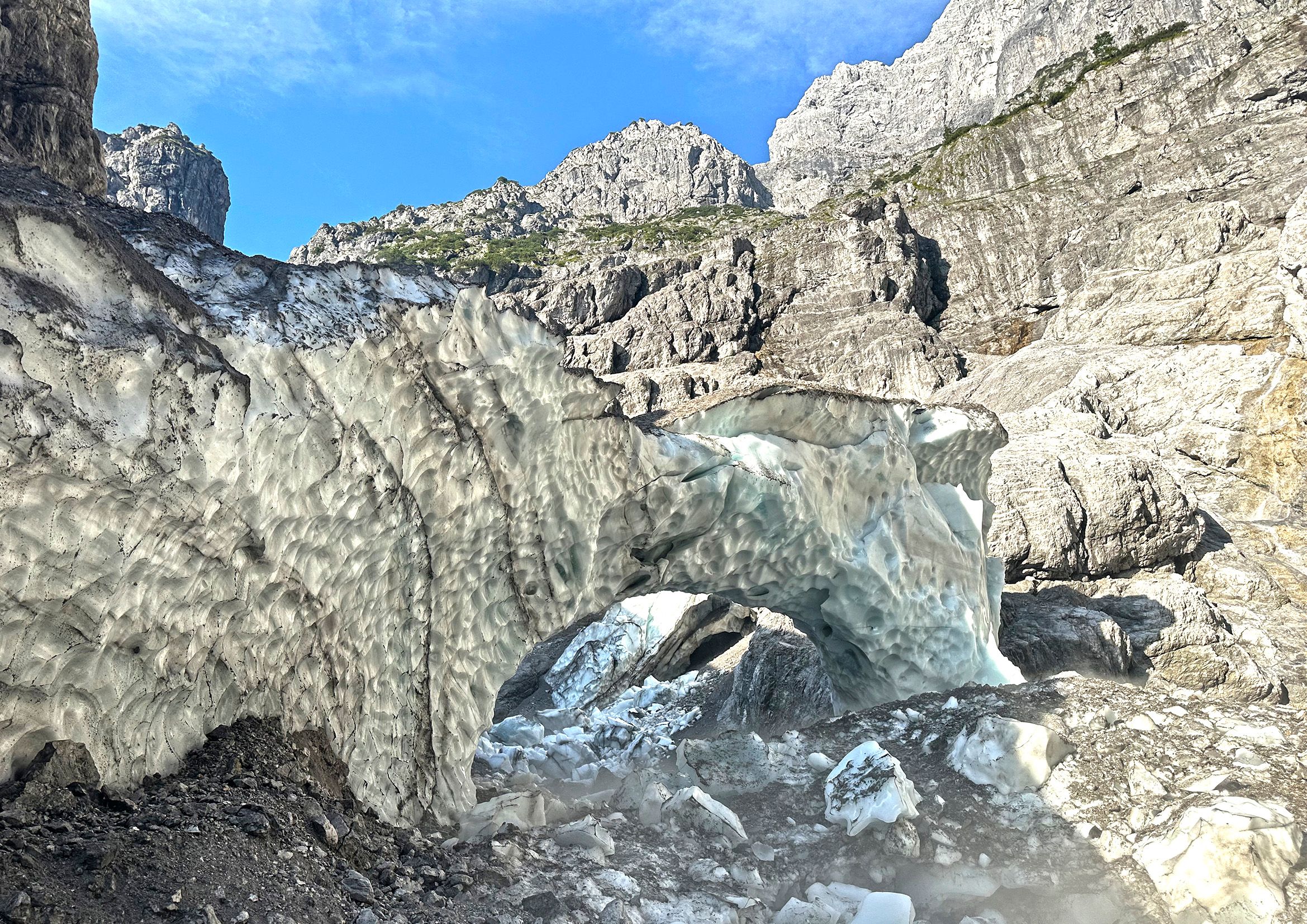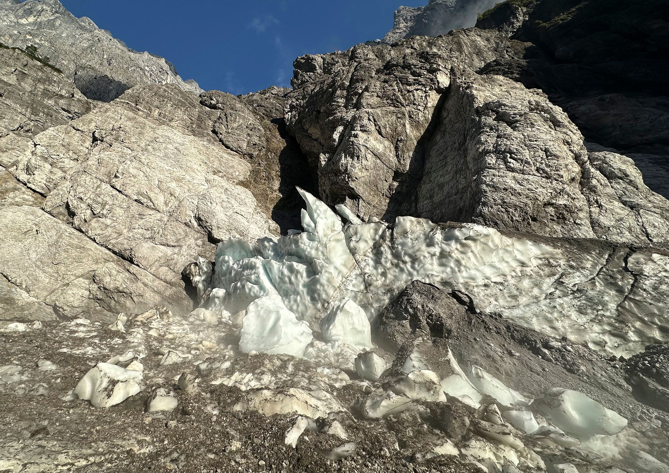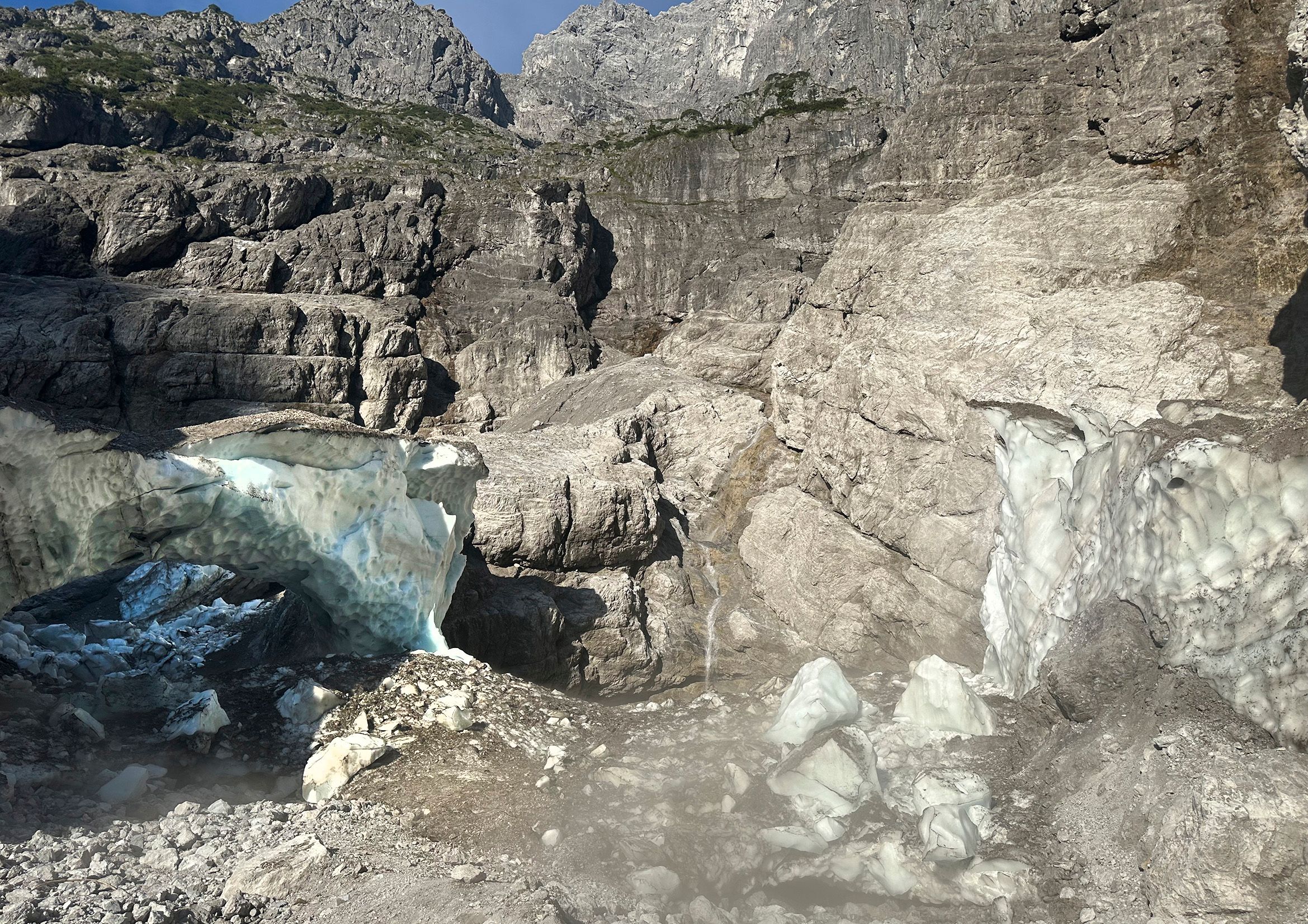 Durch den Zusammenbruch der Eiskapelle sind akute, alpine Gefahren entstanden, auf die Wissenschaftler und Nationalparkverwaltung gleichsam aufmerksam machen: „Wir warnen Wanderer eindringlich vor dem Betreten der Reste der Eiskapelle, es herrscht im gesamten Bereich der Eiskapelle akute Steinschlaggefahr. Auch der letzte, noch stehende Eisbogen und die Eiswände am Rand können jederzeit zusammenbrechen. Vor Ort kracht und rumpelt es im Minutentakt“, warnt Nationalparkleiter Dr. Roland Baier. Andreas Wolf ergänzt: „Durch den vollständigen Verlust des Widerlagers der Firneismassen verliert der südliche Moränenhang im Eisgraben weiter an Stabilität. Große Felsblöcke gleiten auf dem feinsplittrigen, aufgelockerten Material den Hang hinab und gefährden Personen im Bereich des Eisgrabens. Hier können lebensbedrohliche Situationen entstehen.“ Vom Einsturz der Eiskapelle sind auch die Zustiege in die Watzmann-Ostwand betroffen. Ostwand-Gehern wird dringend geraten, sich vorab über die aktuelle Situation vor Ort zu informieren.