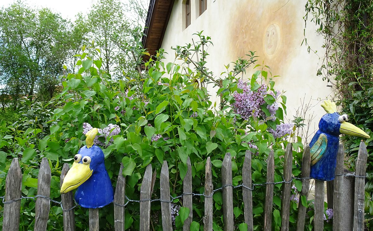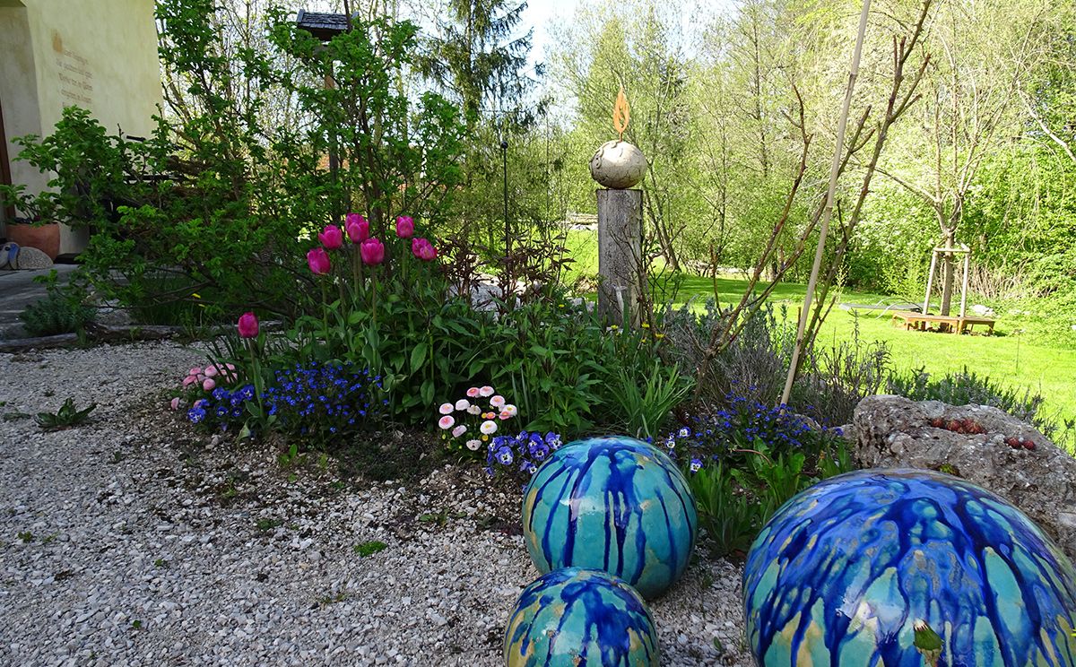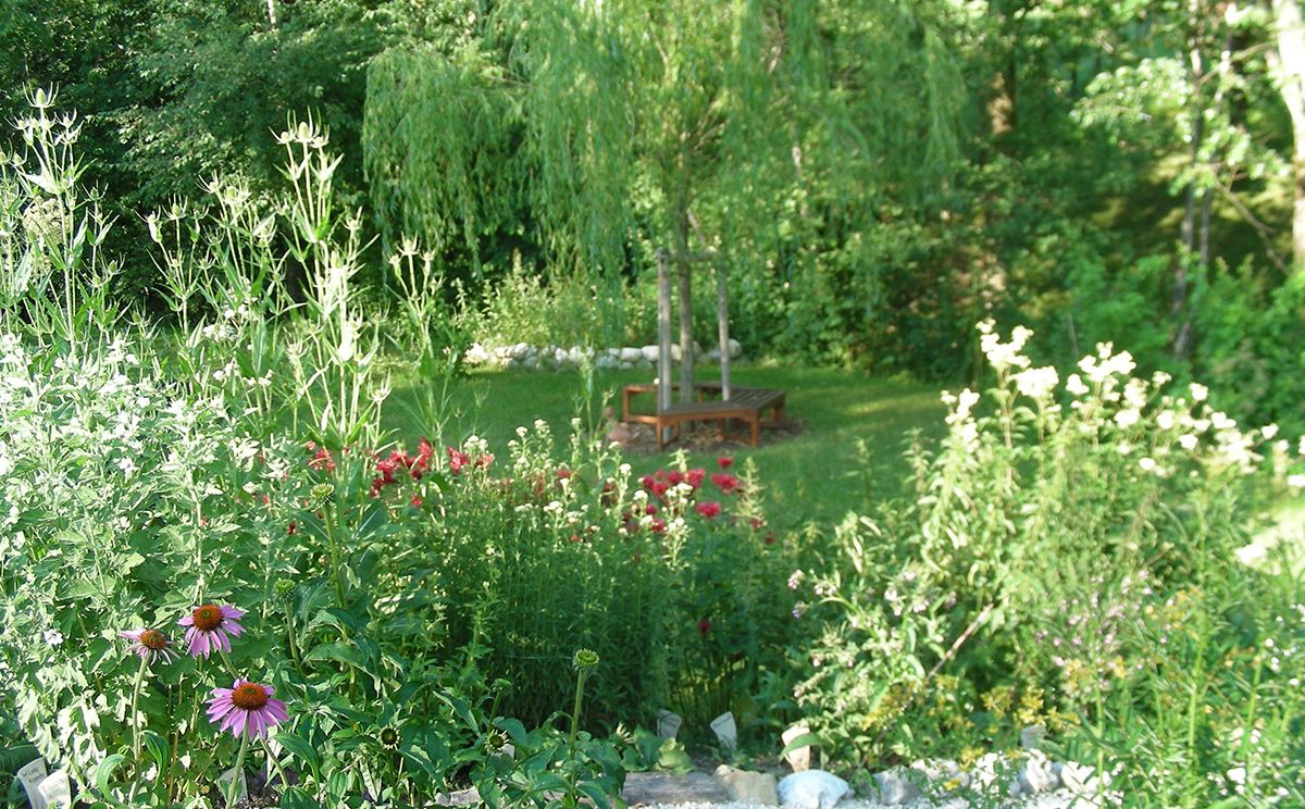 Weil viele Kräuter in Feld und Flur selten geworden oder in unserer Gegend nicht heimisch sind, hat Barbara Spindler um ihr neu erbautes einladendes Haus in Form eines kleinen „Vierkanthofs“ ihren eigenen Kräutergarten angelegt. Die Anordnung der Beete und die Bepflanzung bilden einen Brückenschlag zwischen der Traditionellen Europäischen Heilkunde (Kräuter, Wasser) und der Traditionellen Chinesischen Medizin (Fußmassage).