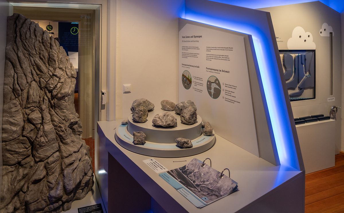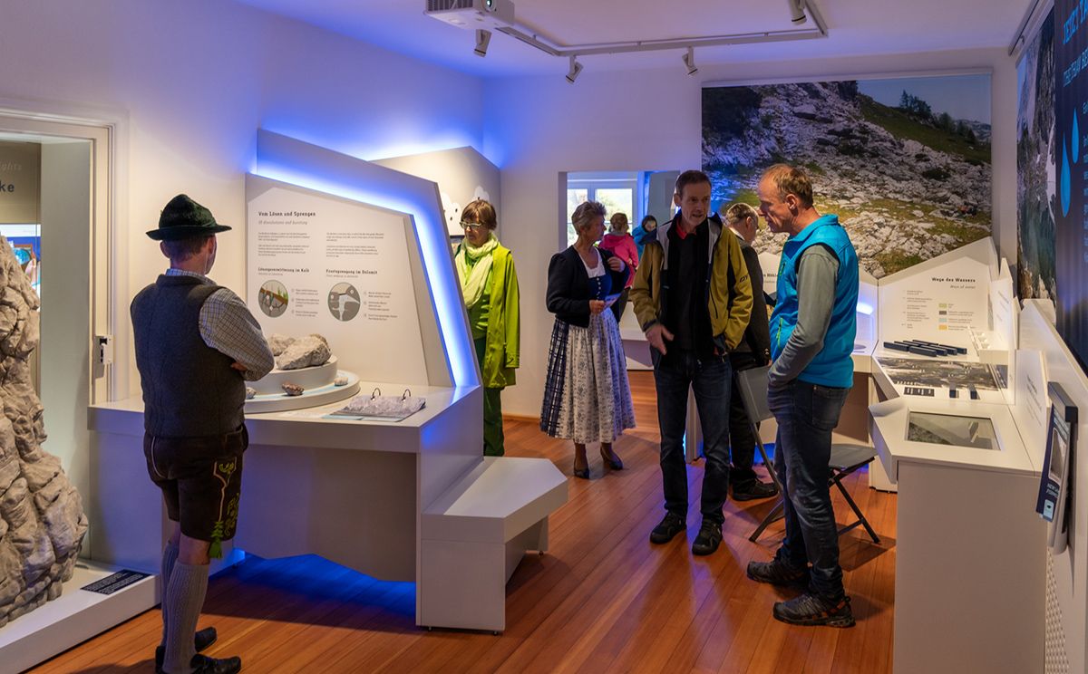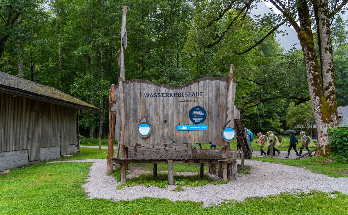 Die Dauerausstellung „Wasser versetzt Berge“ im Jägerhaus führt durch einen Rundgang mit fünf thematischen Räumen, die durch die Geschichte eines Wassertropfens verbunden sind, der durch den Nationalpark Berchtesgaden reist. Die Räume bieten interaktive und spielerische Elemente sowie einfache technische Geräte, um die folgenden Themen zu erforschen: