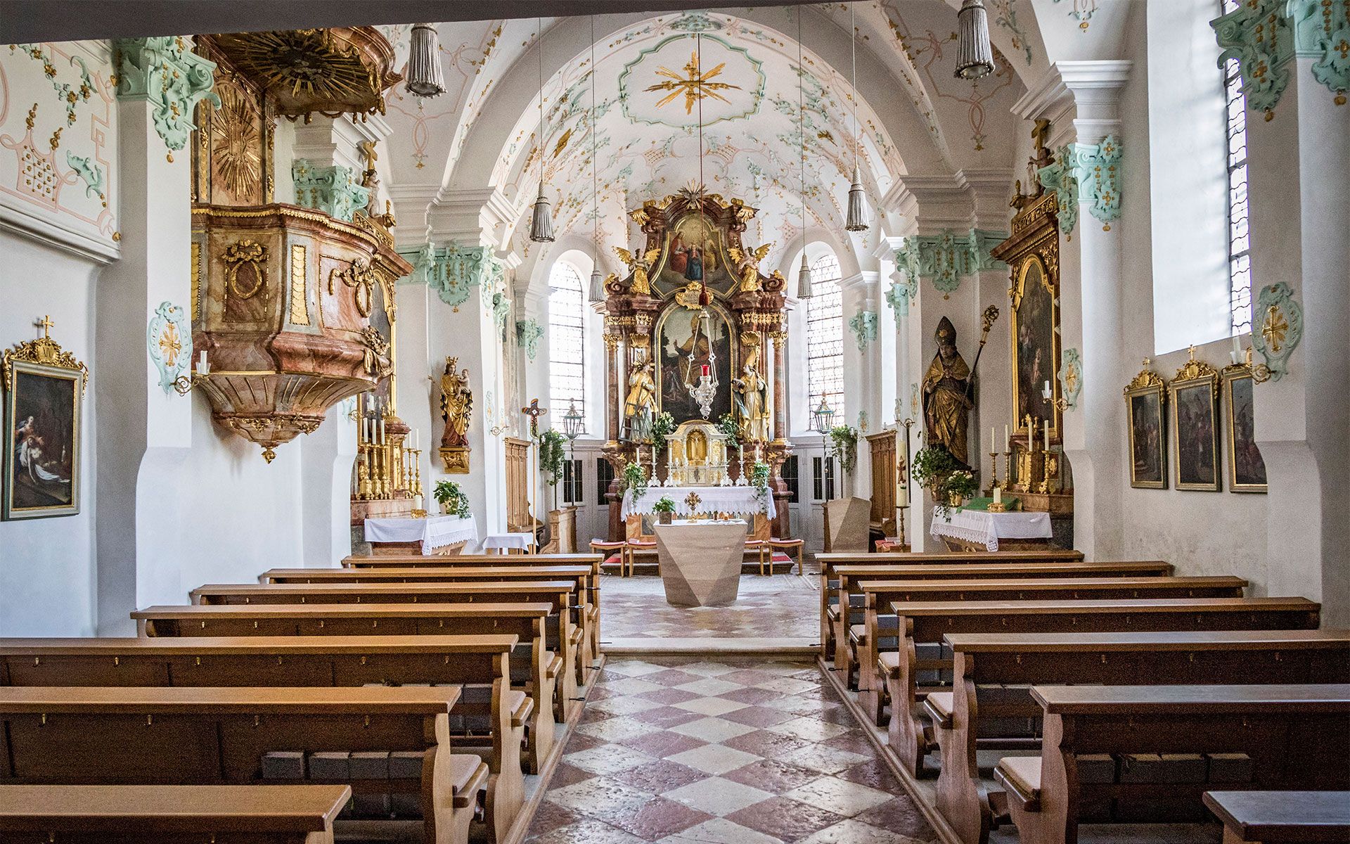 Betritt man den Friedhof, der die Kirche umgibt, fällt einem sofort der wehrhafte, unverputzte Westturm aus Nagelfluh-Quadern auf. Seine ursprüngliche gotische Spitzhaube wurde im Zuge der Barockisierung durch eine Doppelzwiebelhaube ersetzt. Der zweigeschossige Anbau im Norden stammt aus dem 17./18. Jahrhundert. Der gotische Chor im Osten entstand um 1430. Natürliches Licht fällt nur über die Fenster im Osten und Süden in den Kirchenraum. In das Gotteshaus gelangt man über den Haupteingang im Norden. Das spätgotische Kielbogenportal wird durch eine Vorhalle geschützt. Die Genealogie, der Stammbaum, der Herren von Marzoll erschließt sich anhand der Grabsteine, die im 19. Jahrhundert aus dem Kircheninneren, der ehemaligen Grablege, hierher versetzt wurden. Im Innenraum der Kirche hat Benedikt Zöpf aus Salzburg die Stuckierung durchgeführt und einen beeindruckenden Audienzsaal Gottes geschaffen. Wenn man auf einer der Kirchenbänke platzt nimmt und nach oben in das gotische Gewölbe blickt, erkennt man von Osten nach Westen das theologische Programm auf der Mittelachse am besten: Das Auge Gottes mit Strahlen und Wolken, gefolgt von JHS für Jesus mit einigen Arma Christi (Leidenswerkzeugen) und dem Marienmonogramm als Symbol für die Muttergottes, die den Gottessohn geboren hat. In den seitlichen Zwickeln befinden sich Stuckkartuschen (Zierrahmen) mit Buch, Kelch, Wein, Wasserkännchen und Weihrauchfass.