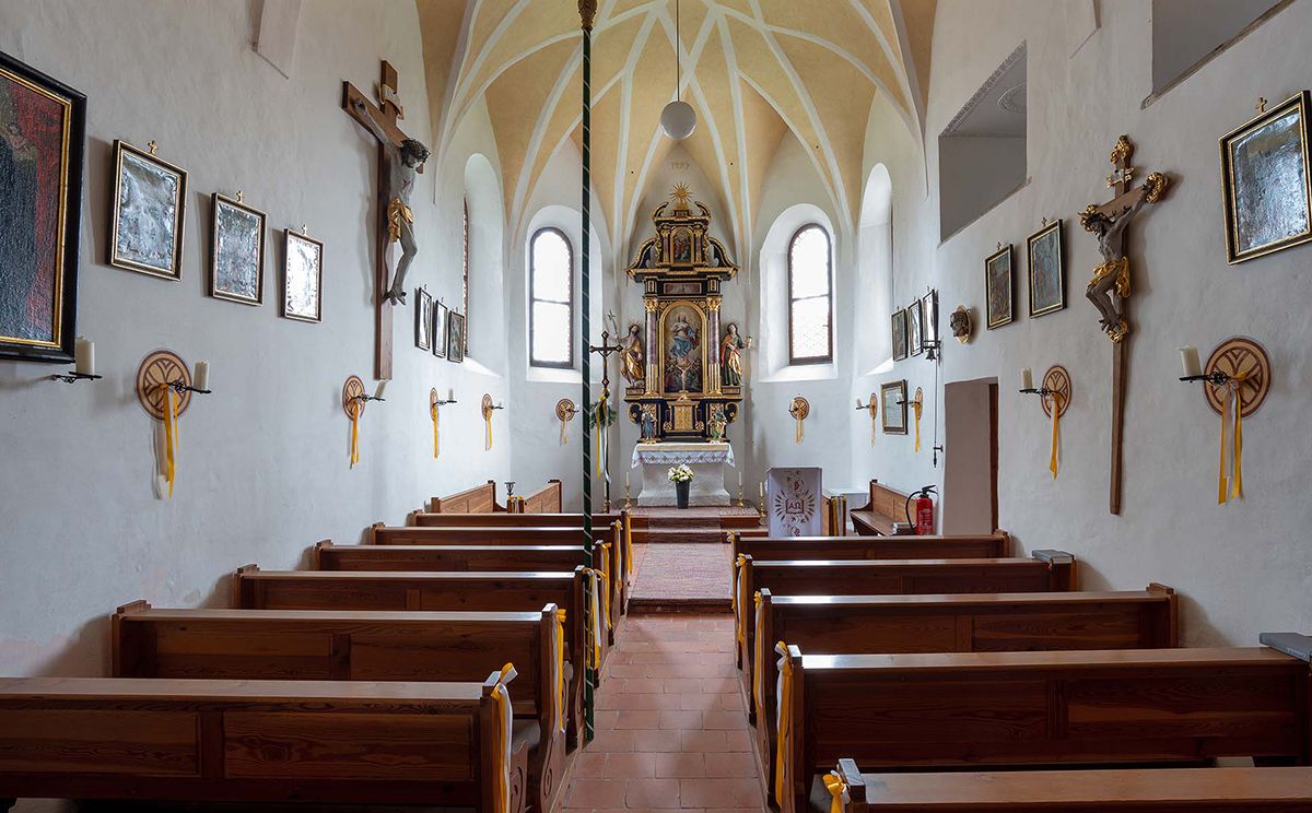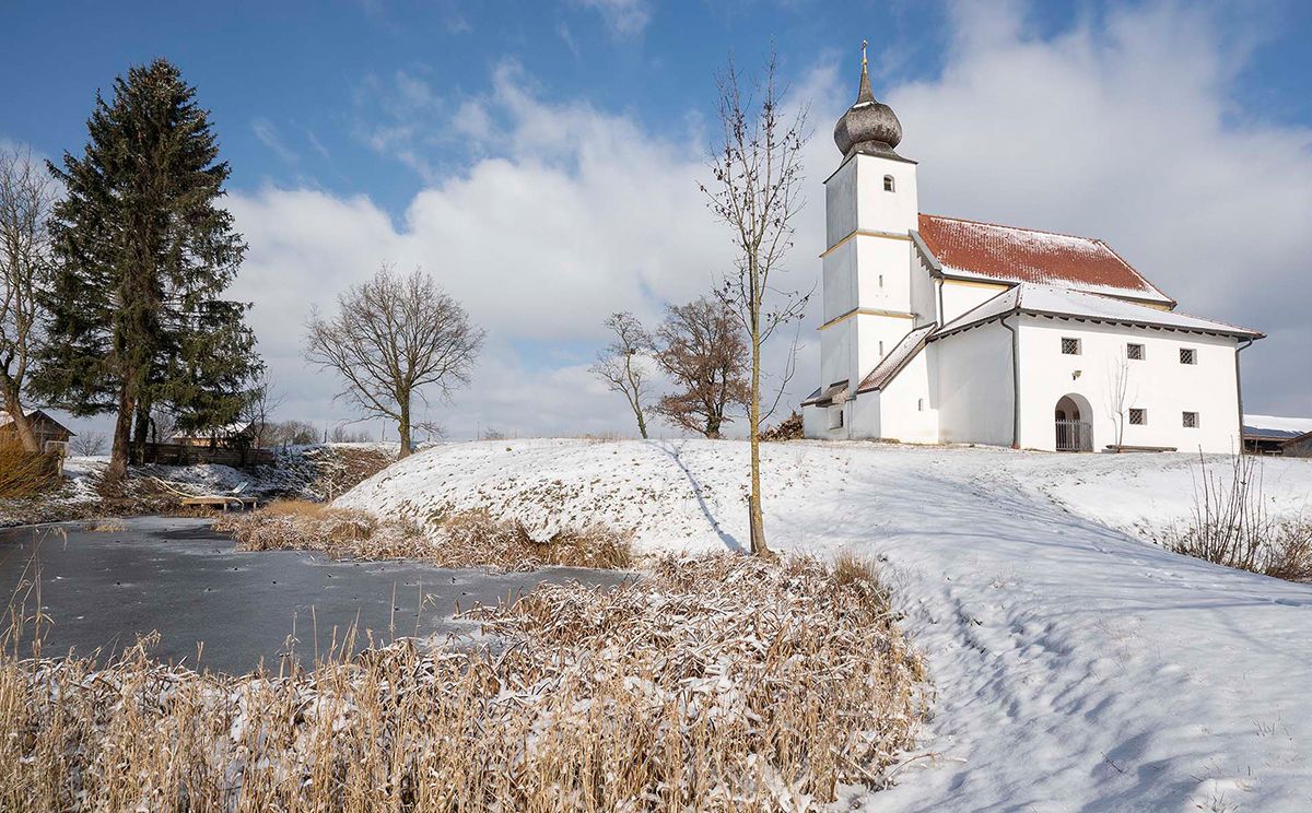 Rund um eine ehemalige Burganlage erstreckt sich das Ensemble Steinbrünning aus Kirche St. Johann Baptist, Wirtshaus und alten Bauernhöfen.