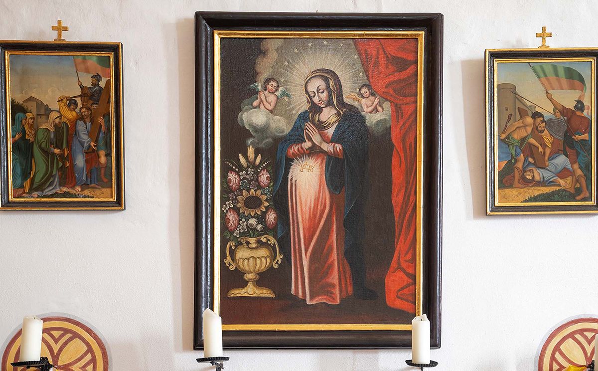 In Schönheit und Ausstrahlung Hilfe versprechend … - eine der sehr seltenen Darstellungen von Maria „in guter Hoffnung“ – zu finden in der Filialkirche St. Johannes der Täufer Steinbrünning an der Nordwand des Kirchenschiffes (heute Pfarrei Saaldorf) – ein Gemälde aus der Laufener Werkstatt von Margarethe Magdalena Rottmayr (geb. Zehentner); - oder vielleicht sogar von ihrem Sohn Johann Michael Rottmayr (1654 – 1730), der ihr von Jugend an half und ob seines großen Könnens und seiner malerischen Virtuosität es später als Barockmaler zu großer Berühmtheit brachte. Das Bildnis zeigt Maria in sich versunken mit gefalteten Händen über ihren Leib mit dem Christusmonogramm. Der neben ihr stehende Mai-Krug mit Blumenstrauß symbolisiert das aufblühende Leben, Reinheit und Tugend.