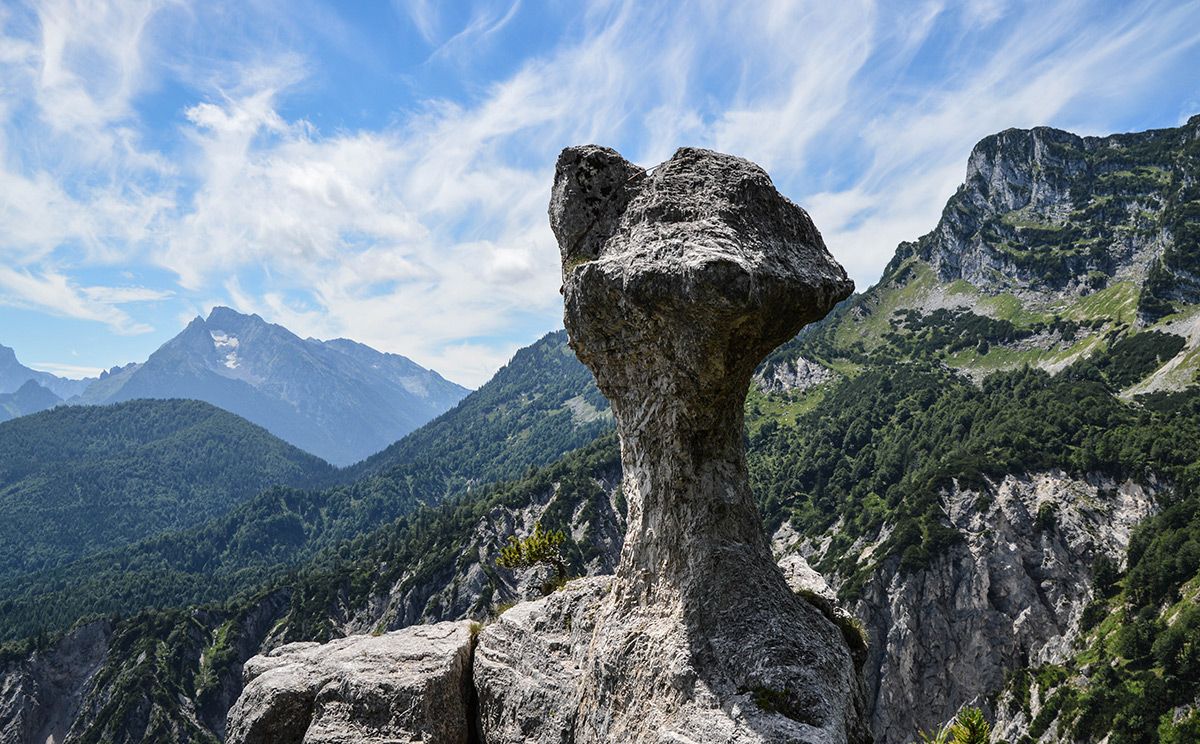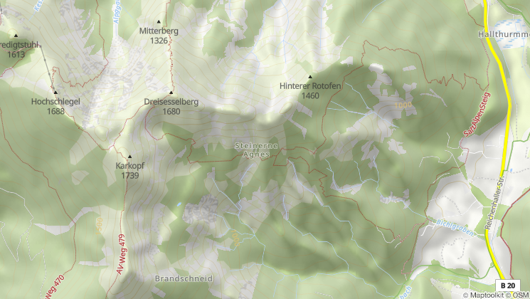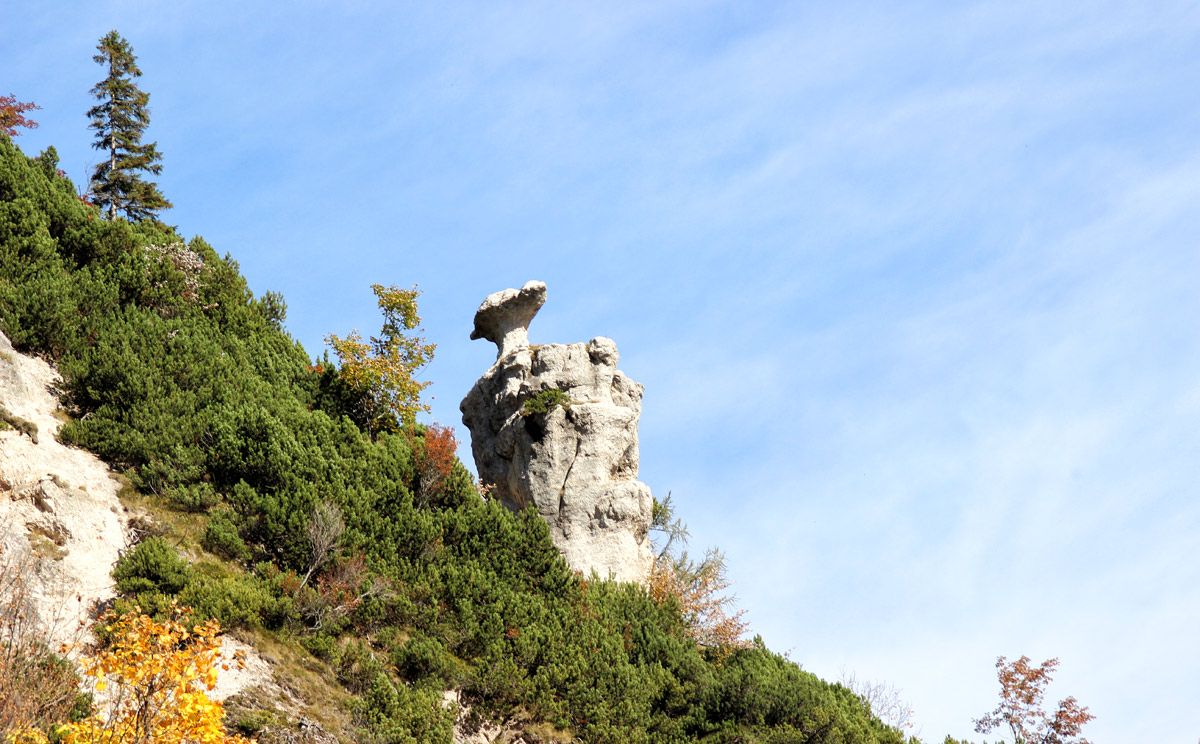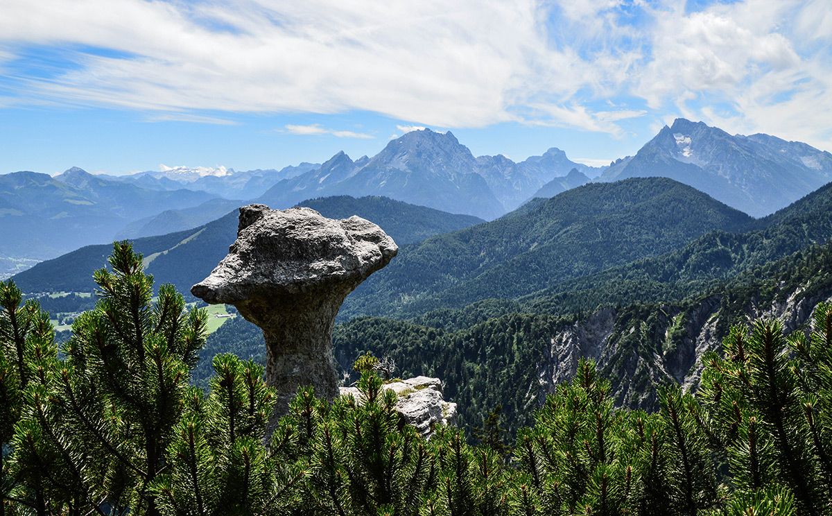 Die Wanderung zur Steinernen Agnes ist ein echter Geheimtipp: Vom Parkplatz am Hallthurm in Bischofswiesen wandern wir auf einem schönen Forstweg bis zur Hochspannungstrasse, wo uns ein Steig nach rechts über einen schattigen Bergwald auf den Rotofensattel anzweigt. Von hier geht es leicht auf und ab bis zur Steinernen Agnes, die 50 m oberhalb des Steiges steht. Wir versuchen erst gar nicht, sie zu besteigen. Wer möchte kann weitere knapp 400 Höhenmeter zum Dreisesselberg aufsteigen. Zum Abstieg wandern wir von der Steinernen Agnes etwa 60 bis 80 Meter zurück und steigen dann rechts über den Bichlberg nach Winkl ab, beim Bichllehen treffen wir auf den Bischofswieser Panoramaweg und gehen zum Ausgangspunkt.