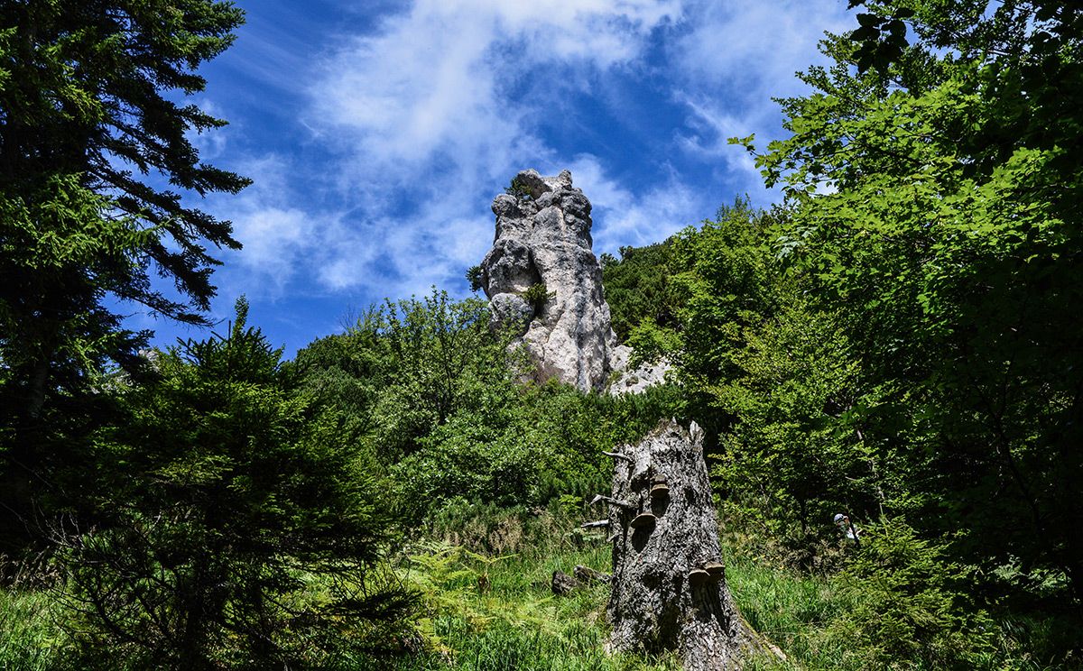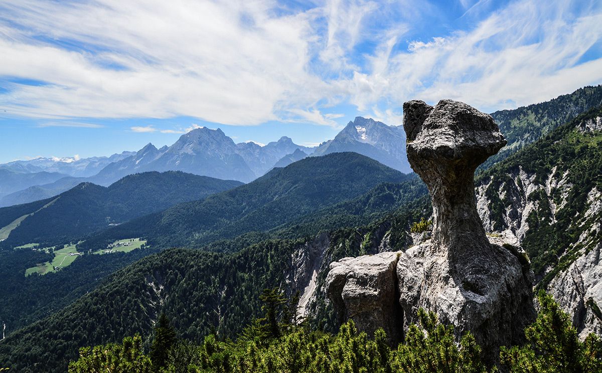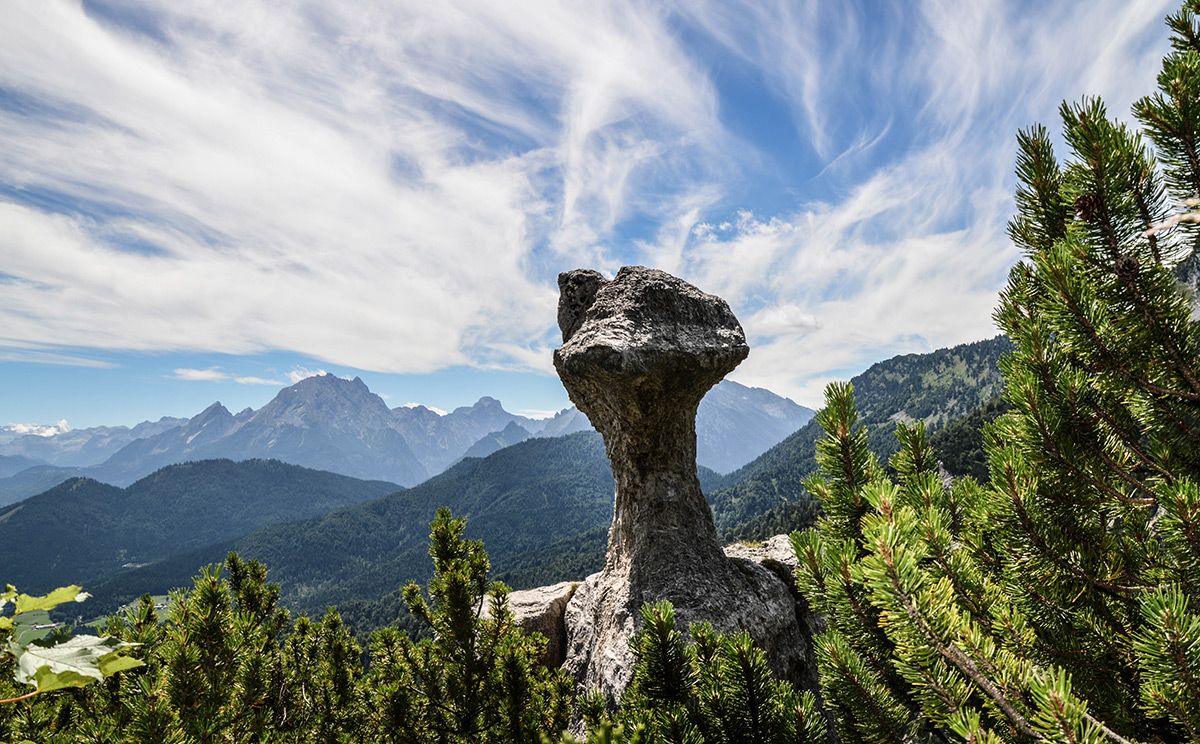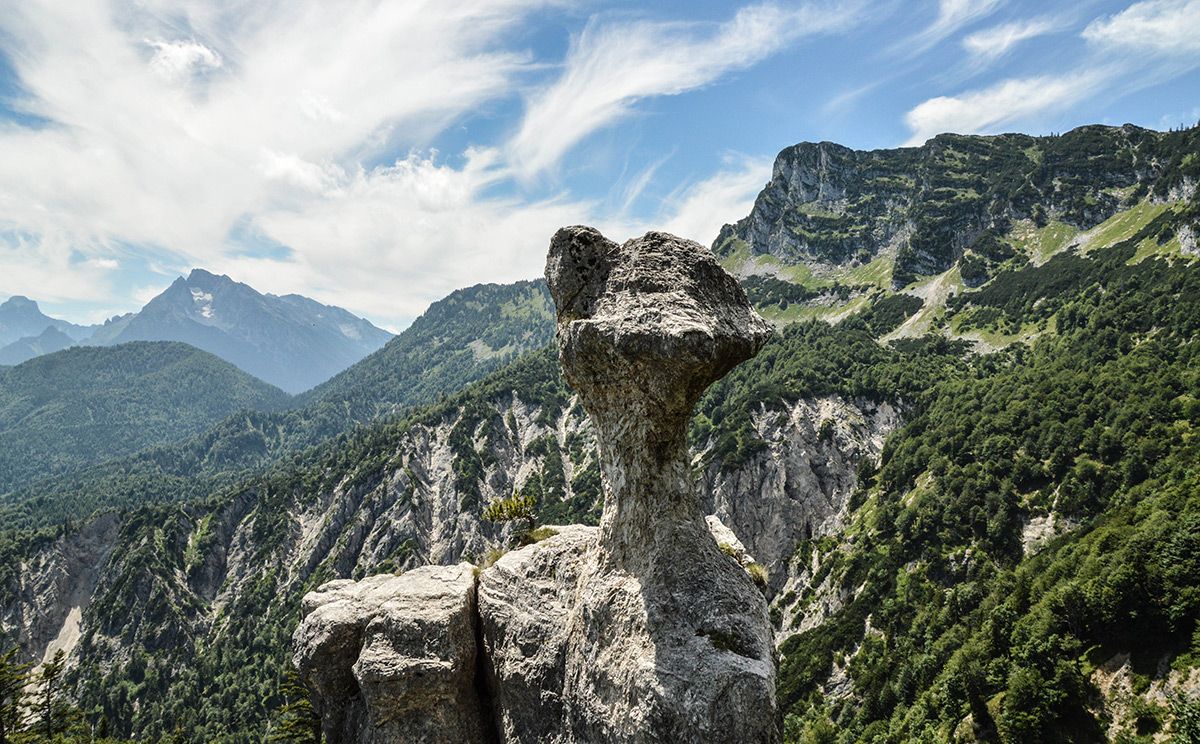 Die Wanderung zur Steinernen Agnes ist ein echter Geheimtipp: Vom Parkplatz am Hallthurm in Bischofswiesen wandern wir auf einem schönen Forstweg bis zur Hochspannungstrasse, wo uns ein Steig nach rechts über einen schattigen Bergwald auf den Rotofensattel anzweigt. Von hier geht es leicht auf und ab bis zur Steinernen Agnes, die 50 m oberhalb des Steiges steht. Wir versuchen erst gar nicht, sie zu besteigen. Wer möchte kann weitere knapp 400 Höhenmeter zum Dreisesselberg aufsteigen. Zum Abstieg wandern wir von der Steinernen Agnes etwa 60 bis 80 Meter zurück und steigen dann rechts über den Bichlberg nach Winkl ab, beim Bichllehen treffen wir auf den Bischofswieser Panoramaweg und gehen zum Ausgangspunkt.