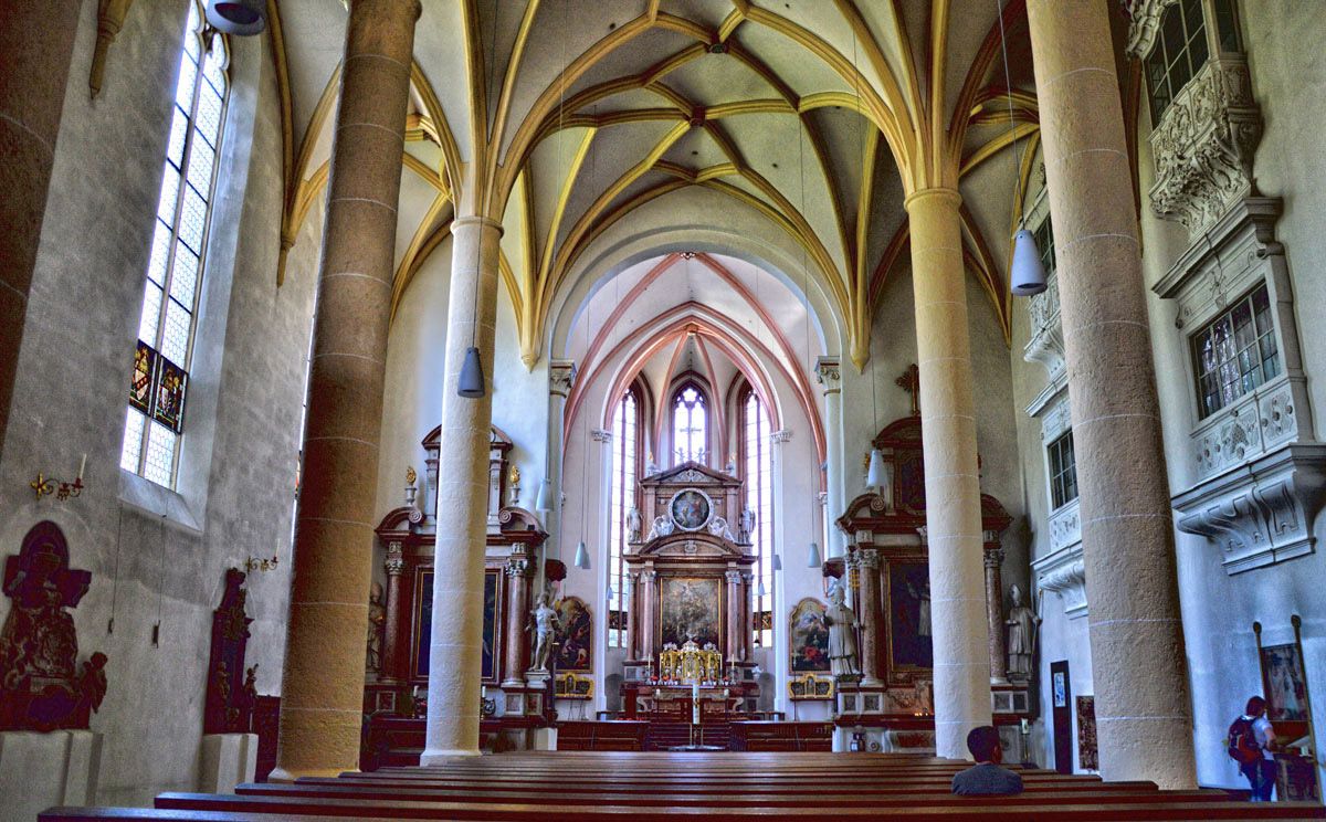 Man betritt nun das dunklere Langhaus das im reizvollen Gegensatz zum höheren, lichterfüllten Hochchor steht. Dass verzerrte Netzrippengewölbe, das aus bauchronologischen oder bautechnischen Gründen entstand, bildet den Deckenabschluss des Langhauses. Es lässt eine besondere Raumwirkung entstehen. Der Chor der Stiftskirche wurde nicht aufgrund einer darunterliegenden Krypta erhöht. Vielmehr wollten die Chorherren, ähnlich einer Bühne, die besondere Bedeutung dieses Bauteils hervorheben.