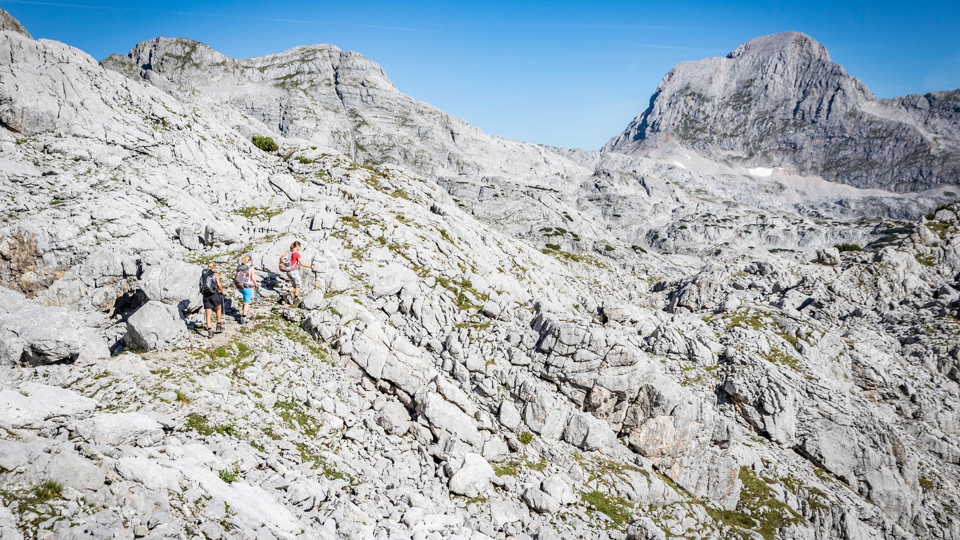 Das Steinerne MeerDachsteinkalk und Karst sind die prägenden Elemente der Landschaft im Steinernen Meer. Bis oberhalb von 2000 Metern Höhe erstreckt sich die Hochfläche, 50 Gipfel im und um das Steinerne Meer sind über 2000 Meter hoch. Sowohl der bayerische Teil als auch der österreichische Teil des Steinernen Meeres sind streng geschützt: Auf Deutscher Seite sorgt der Nationalpark Berchtesgaden für die Bewahrung dieser einzigartigen Natur, auf österreischischer Seite das Naturschutzgebiet Kalkhochalpen.