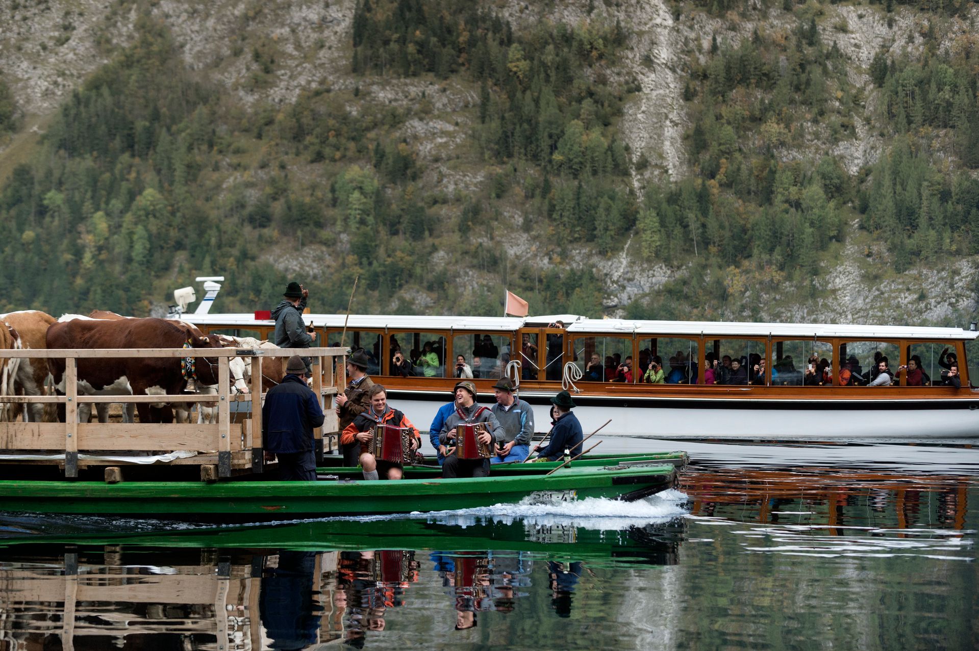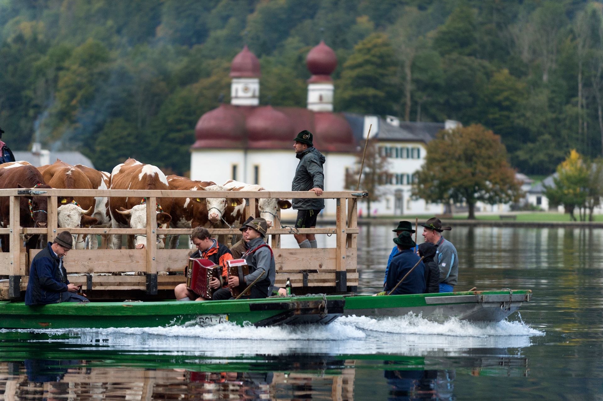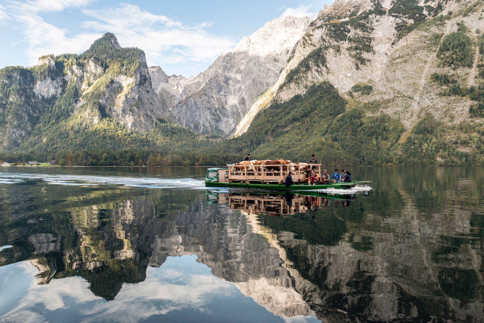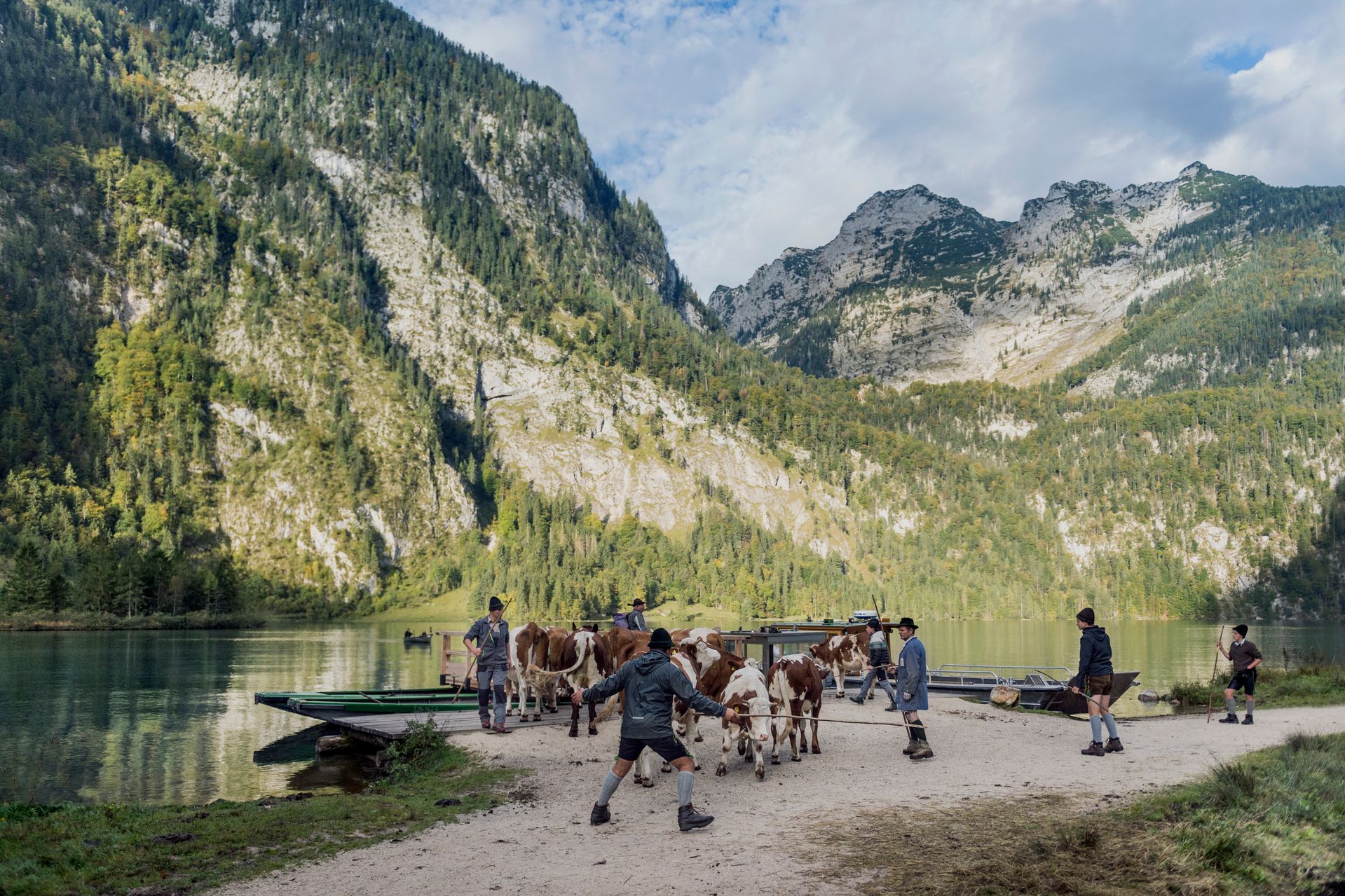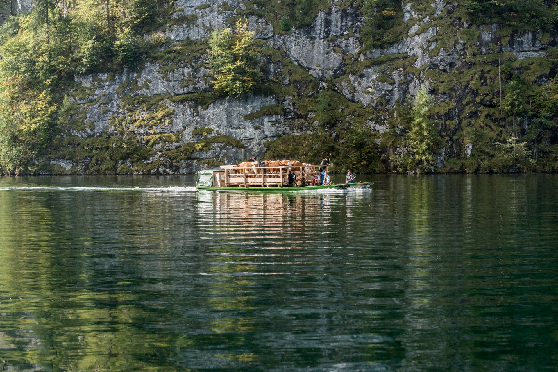 Früher wurden die Kühe über den Königssee gerudert. Doch schon seit 100 Jahren bringt sie der sanfte Schub von Motoren nach Hause. Die etwa 30 Kühe, die von den Almen am Südufer des Königssees und des Obersees zurückkehren, sind im gesamten Alpenraum die einzigen mit einstündigem Bootstransfer auf dem Weg zum heimischen Stall.
