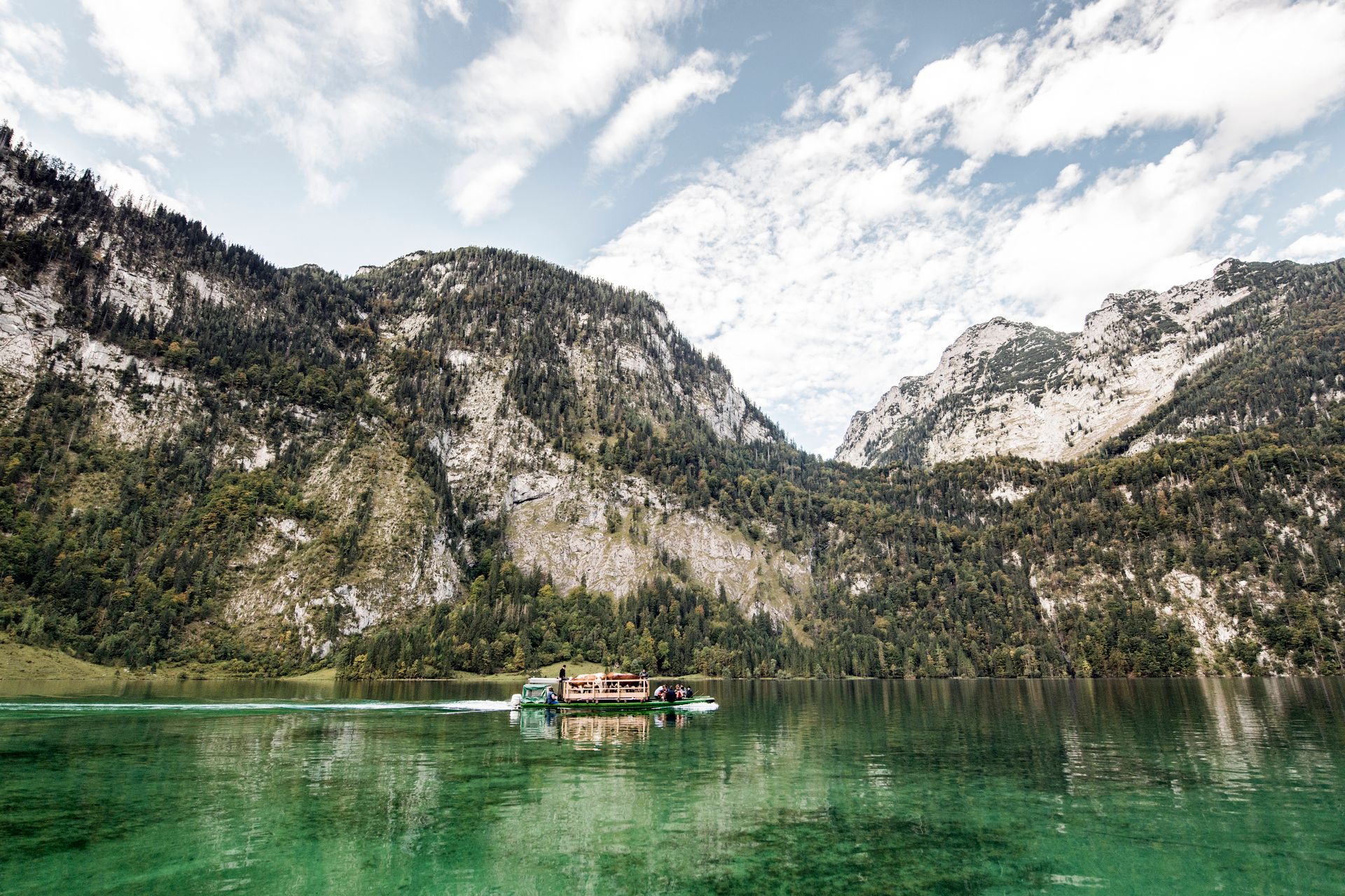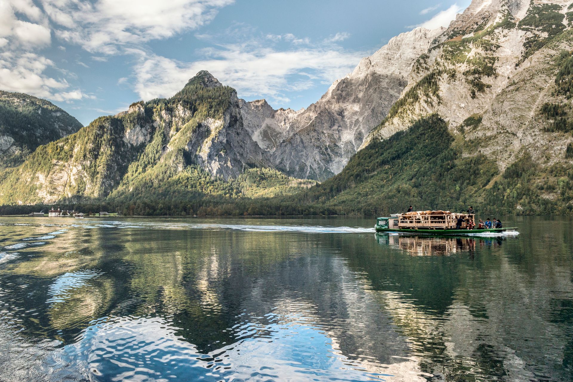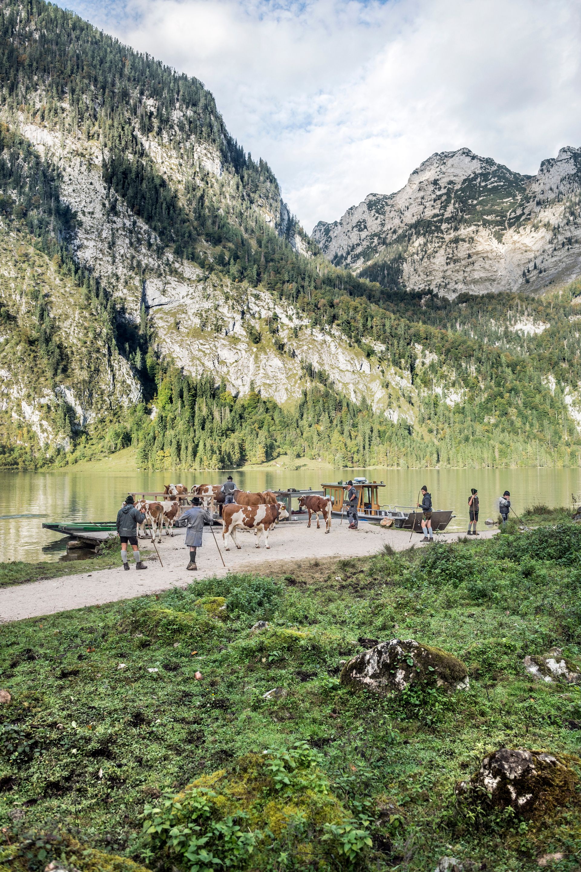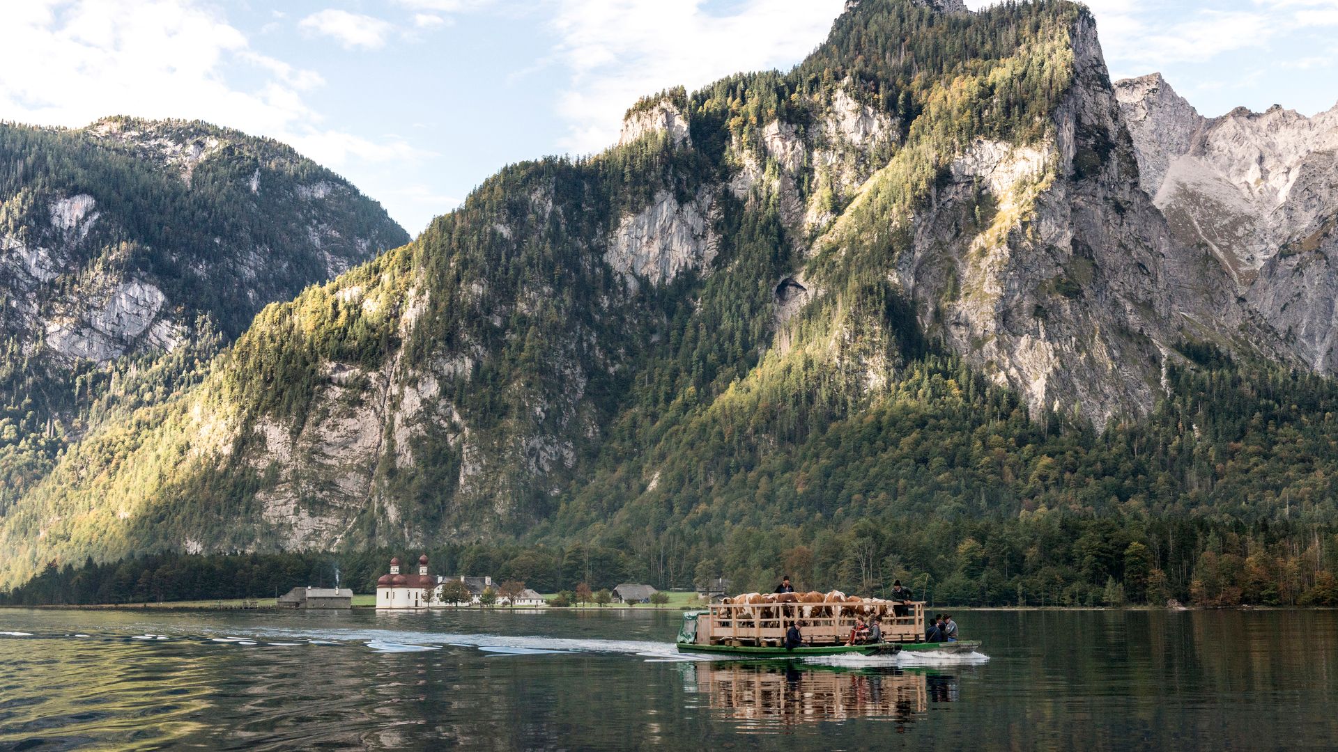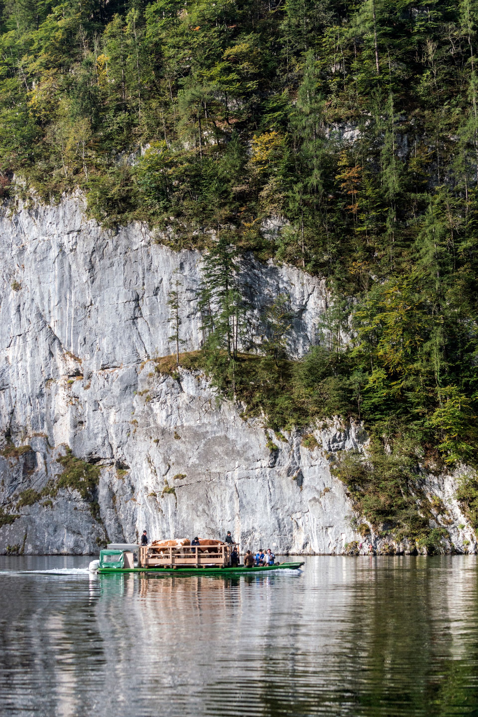 Früher wurden die Kühe über den Königssee gerudert. Doch schon seit 100 Jahren bringt sie der sanfte Schub von Motoren nach Hause. Die etwa 30 Kühe, die von den Almen am Südufer des Königssees und des Obersees zurückkehren, sind im gesamten Alpenraum die einzigen mit einstündigem Bootstransfer auf dem Weg zum heimischen Stall.