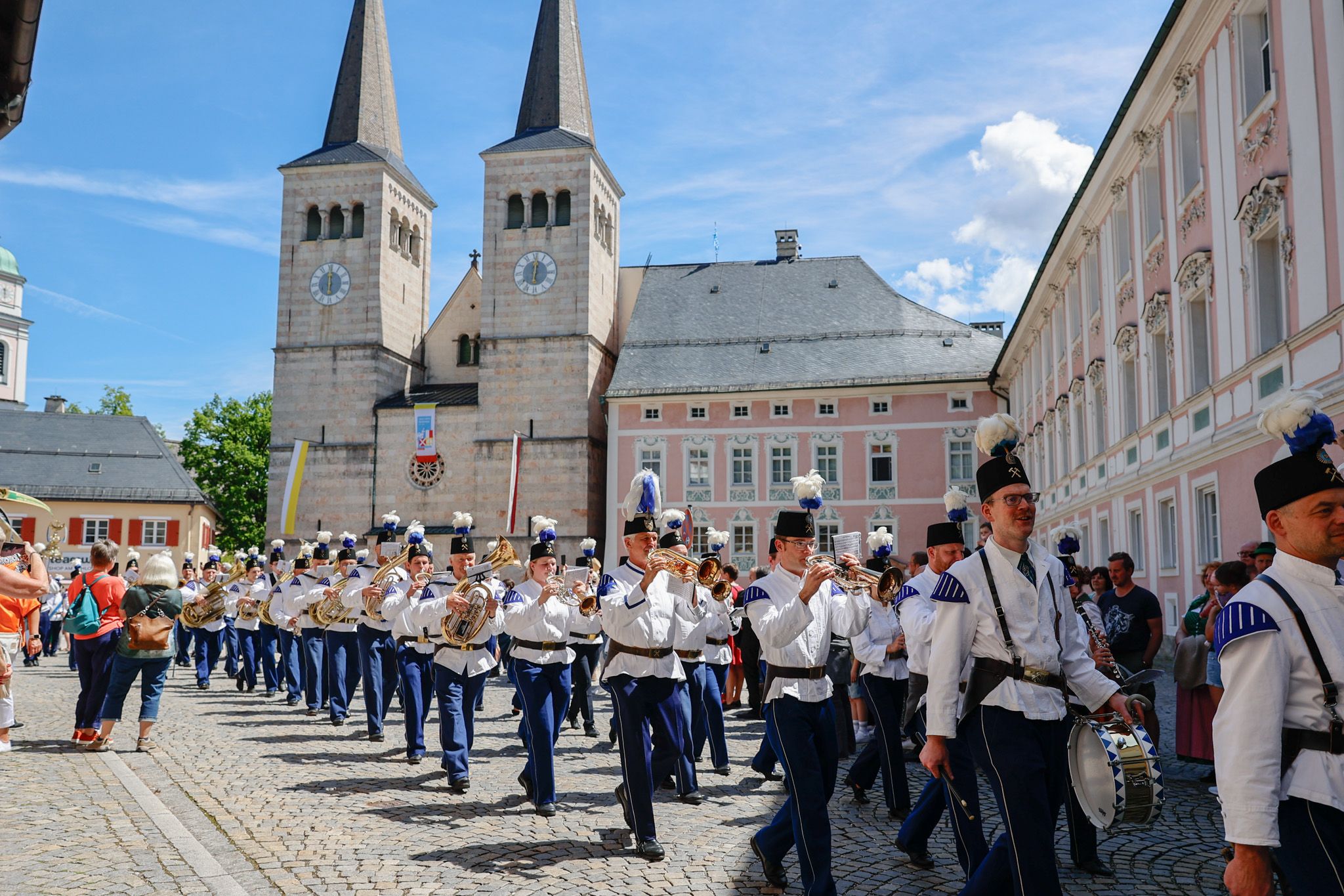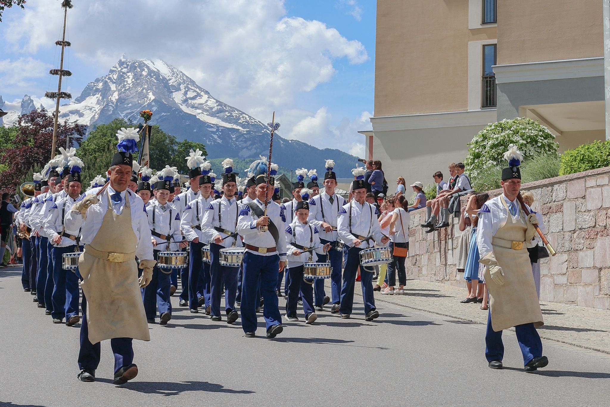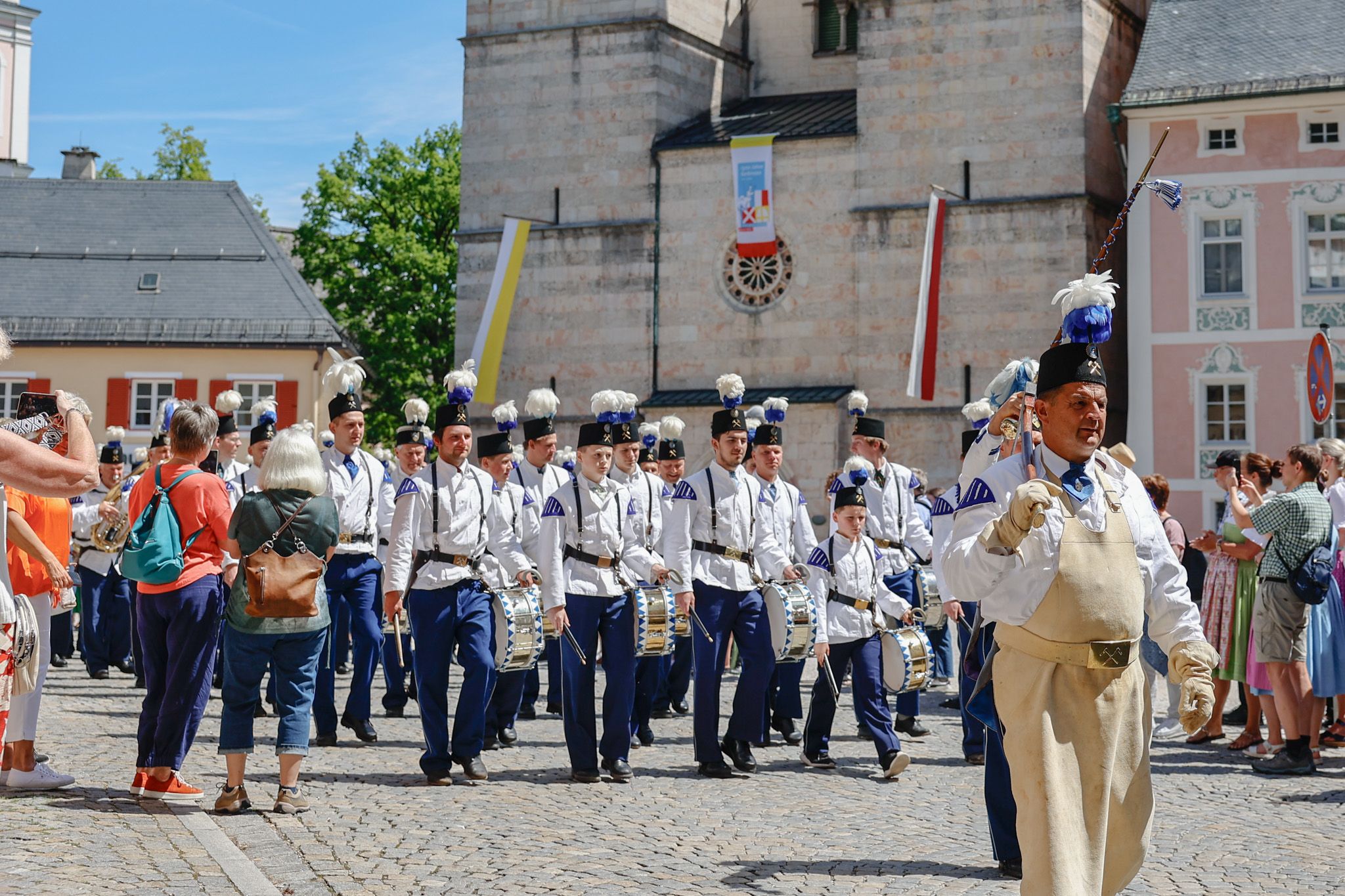 Das Bergfest an PfingstenMit einem Konzert der Knappschaftskapelle am Schlossplatz und einem Festzug durch den Markt Berchtesgaden wird am Pfingstsonntag das Fest eingeläutet. Am Pfingstmontag, dem eigentlichen Festtag, geht es früh morgens wieder musikalisch los mit einem Weckruf der Kapelle der Bergknappen und Festzug im Markt Berchtesgaden. Die anschließende Einfahrt in das Salzbergwerk mit Festakt bleibt den Bergmännern vorbehalten. Ein großer Festzug macht sich danach auf zum Marsch zur Stiftskirche. Nach dem Lob- und Dankgottesdienst, ziehen die Knappen und Musiker weiter durch den Markt Berchtesgaden. Schön anzusehen sind die Bergmänner in ihrer Tracht. Sie tragen ihre Werkzeuge wie Bergeisen, Schlägel, Horn, Häckel und Bergbarte. Der dienstälteste Bergmann schultert das Zunftzeichen der Bergleute, das "Bergmanndl".