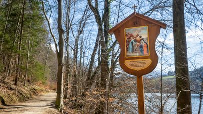 in der Klosterkirche von HöglwörthHöglwörth – bis zur Auflösung des Klosters 1817 ein Augustiner-Chorherrenstift – liegt in der Pfarrei Anger im Rupertiwinkel des Berchtesgadener Landes und ist bis heute eine eindrucksvolle Klosterkirche. Dort stellen in der Karwoche im Turnus von drei Jahren die Bewohner des Ortsteils Höglwörth „ihr“ Heiliges Grab auf – zu sehen jeweils am Karfreitag und Karsamstag.