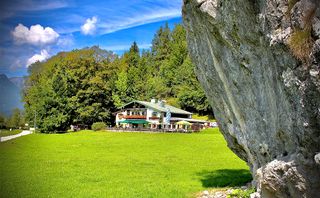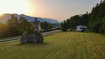 Der Name des Gasthauses Schusterstein kommt von einem faszinierenden Wahrzeichen der Natur: Ein gewaltiger Felsbrocken aus Dachsteinkalk, majestätische 15 Meter breit und 6 Meter hoch, ruht inmitten der Wiese vor dem Gasthaus, als hätte ihn ein Riese beim Spielen fallen gelassen. Von zarten Bäumen bewachsen, fängt er unweigerlich den Blick eines jeden Reisenden auf dem Weg zum Königssee. Das Naturdenkmal wurde vor mehreren Jahrtausenden vom Königsseegletscher auf seiner formenden Reise durch das Tal mitgetragen und beim Schmelzen des Eises für die Ewigkeit an diesem Platz zurückgelassen. Die Einheimischen tauften ihn nach dem nahegelegenen Schusterlehen, einem stattlichen Bauernhof in Sichtweite. An warmen Sommertagen wird der Stein oft zur lebendigen Kulisse für Kletterer, die hier ihre Boulderkunst perfektionieren.