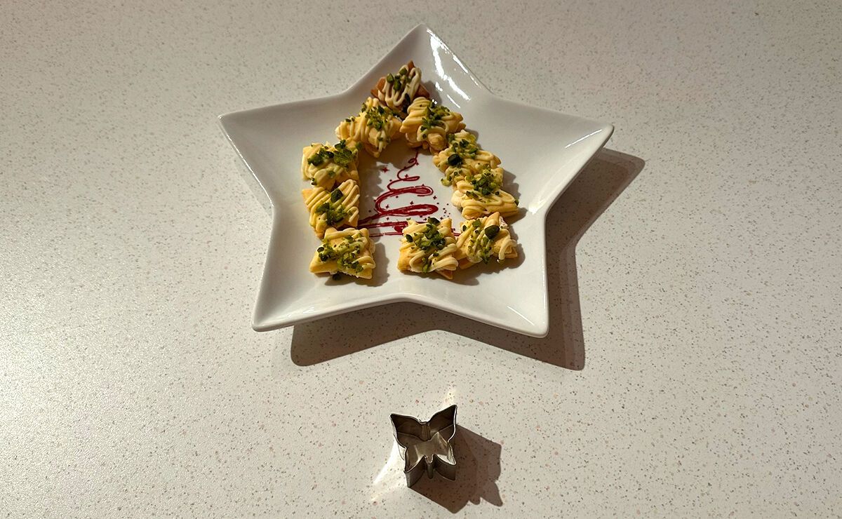 Schokolade zum Schmelzen bringen und mit einer feinen Spritztülle die Plätzchen verzieren und mit gehackten Pistazien bestreuen.
