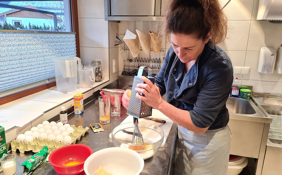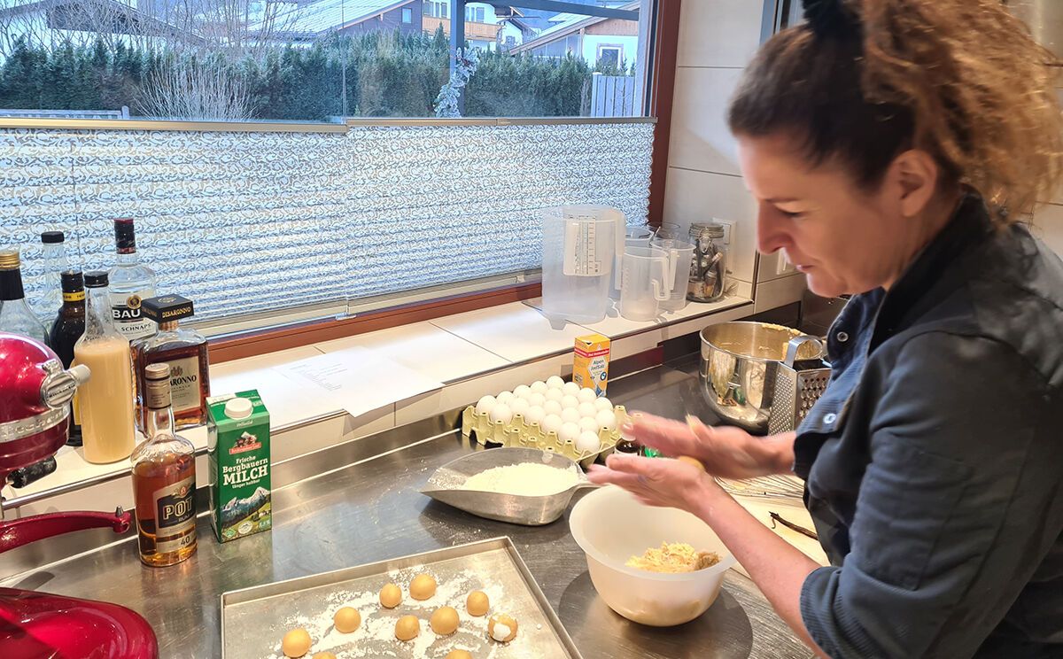 “Riechts Du, wie das Rosenwasser duftet?” fragt Martina Brandner schwärmerisch und gibt gleich noch ein paar Tropfen der hochwertigen Flüssigkeit in die Rührschüssel. Ihr Café in Schönau a. Königssee bleibt heute, an einem Dienstag, geschlossen. Dienstags ist Produktionstag. Von früh bis spät steht Martina dann in ihrer kleinen, aber professionell eingerichteten, Backstube, bereitet Teige vor und backt im Voraus. Und da die Faschingswoche vor der Tür steht, gibt es heute frische Mutzen, ein typisch rheinisches Faschingsgebäck mit Rosenwasser und Marzipan, das wie Krapfen in reinem Butterschmalz herausgebacken wird. Obwohl das Rezept aus den Faschingshochburgen im Rheinland stammt, erfreuen sich die Mutzen auch in Berchtesgaden großer Beliebtheit.