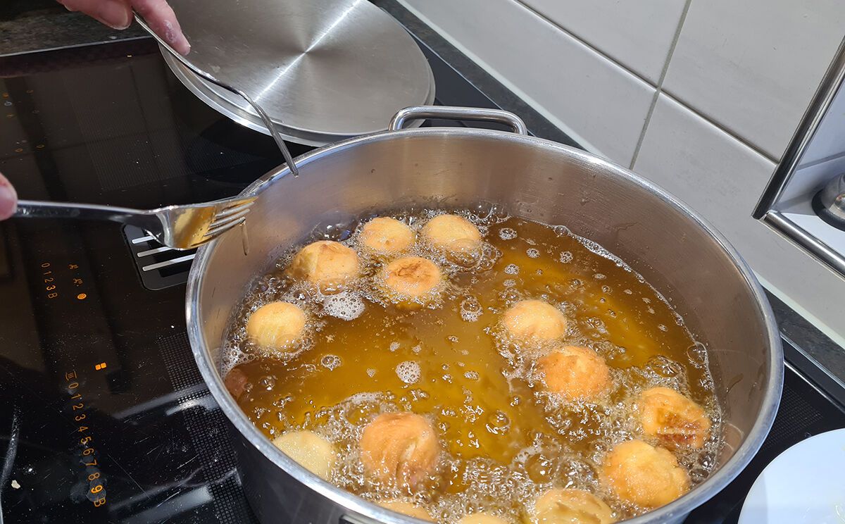 Der Teig muss mindestens zwei Stunden lang gut gekühlt ziehen. Danach Bällchen formen und bei ungefähr 170 °C in heißem Butterschmalz abbacken.