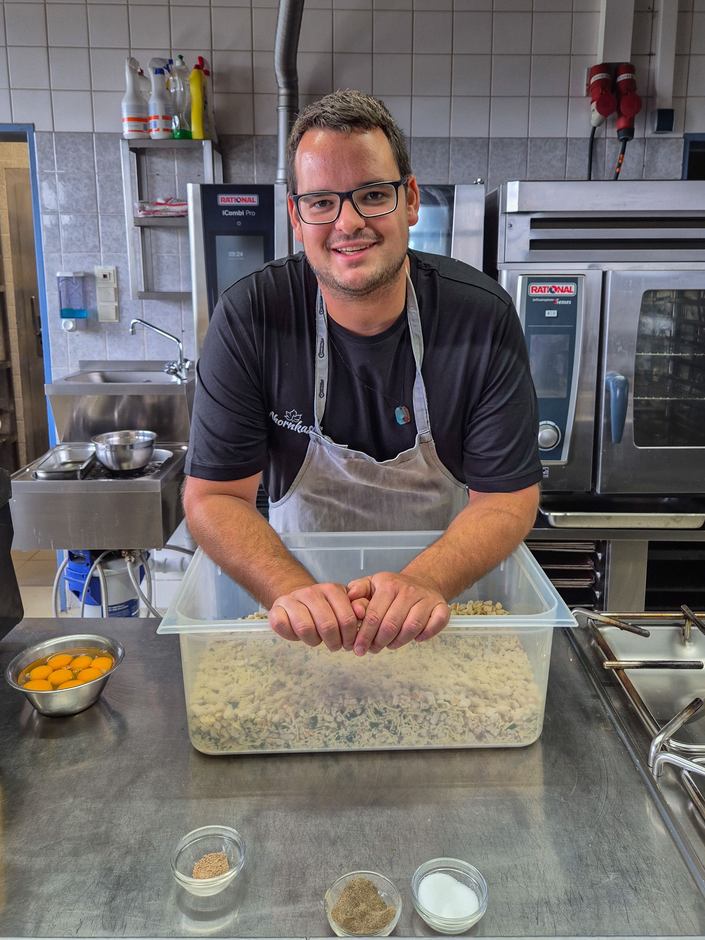 In der geräumigen Küche, vor deren Fenster regelmäßig Almkühe vorbeimarschieren, zaubert Patrick regionale Spezialitäten. Normalerweise produziert er Kaspressknödel für eine ganze Woche – im traditionellen roten Badwandl. "Ich liebe es, wenn sie gescheid grea san", schwärmt der junge Wirt und gibt gleich noch eine Handvoll Petersilie in die Knödelmasse.