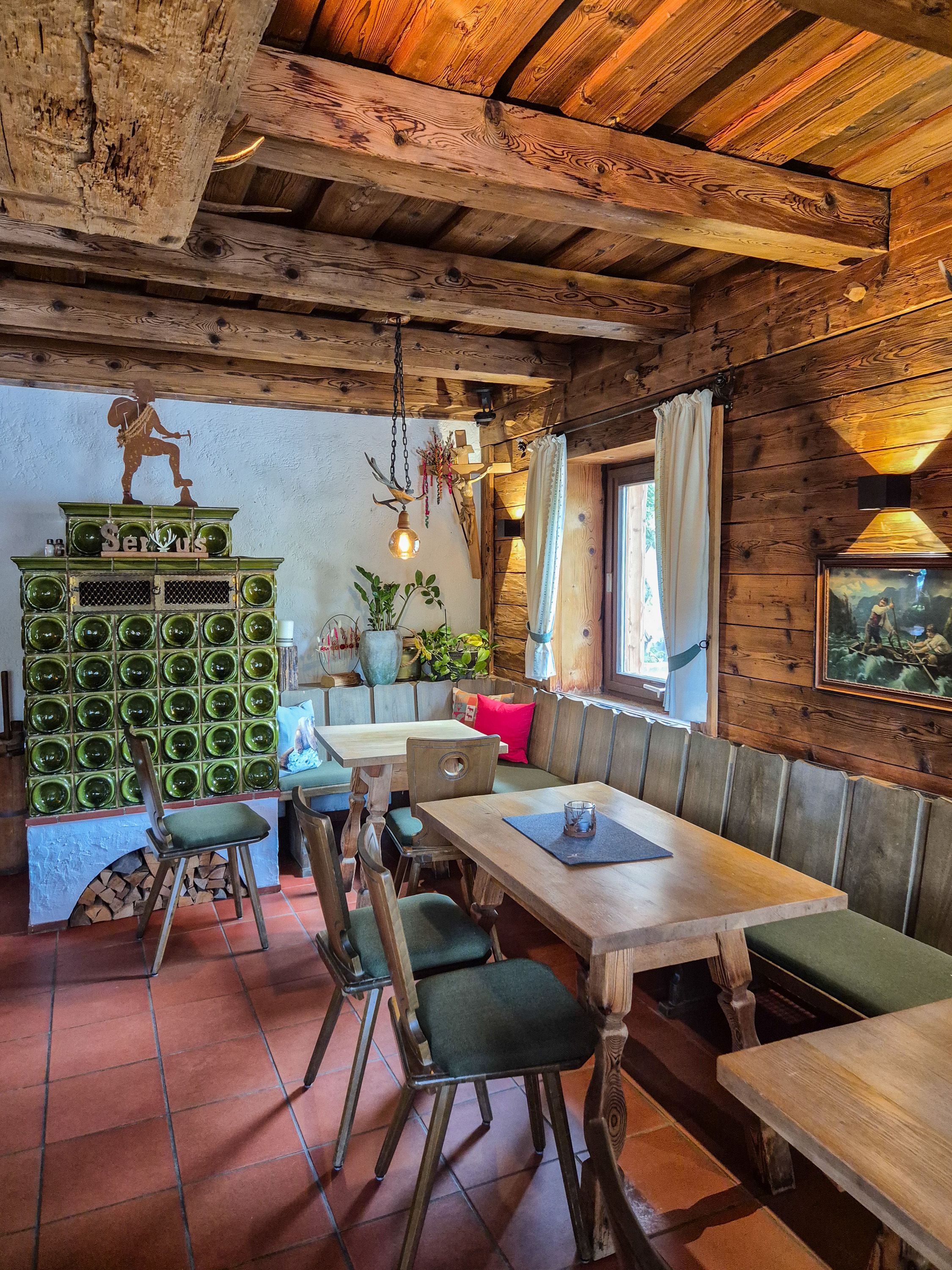 Das eindrucksvolle Gebäude beherbergt mehrere gemütliche Gaststuben mit Kachelöfen, Steinwänden und Holzverkleidung. Hirschgeweihe, Lodenkissen und Ölgemälde mit Jagdszenen bringen urig-bayerische Stimmung in die Räume. Die Terrassen vermitteln Gästen das Gefühl, auf einem luftigen Freisitz zu sitzen – mit Panoramablick auf eine der schönsten Berglandschaften der Alpen.