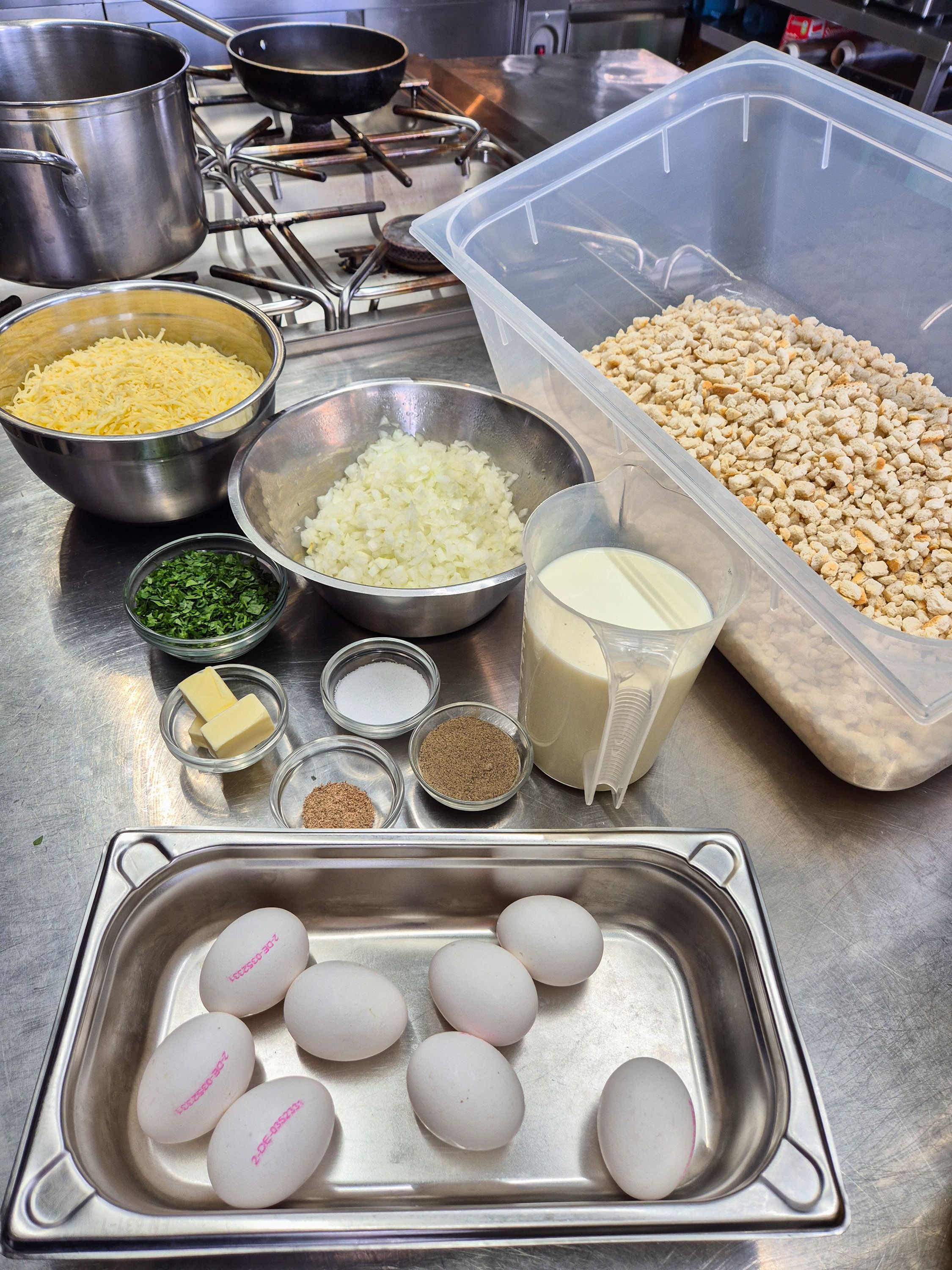 Zwiebeln in einem Topf mit der Butter anbraten. Mit der Milch aufgießen. Gewürze und die Petersilie in den Topf dazu geben. Die Gewürzmilch erhitzen. Das Knödelbrot in einer großen Schüssel mit dem Käse vermengen. Abgekühlte lauwarme Gewürz-Zwiebelmilch (nicht zu heiß, sonst schmilzt der Käse!) über das Knödelbrot gießen, vermengen und ziehen lassen, bis es etwas abgekühlt ist. Eier dazu geben und gut unterheben. Knödel formen und plattdrücken. Im Fett ausbacken.