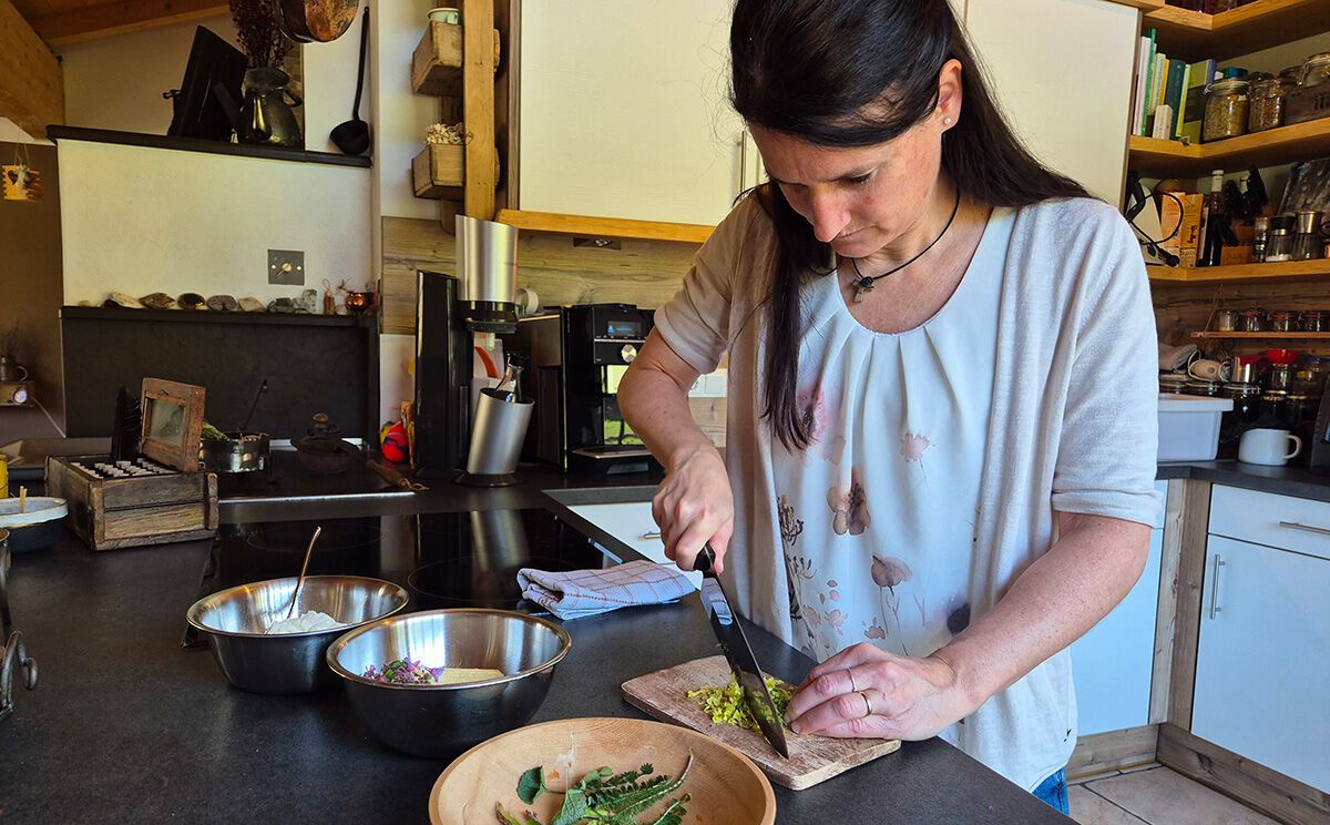 Monika bereitet gerade alles für das Seminar am Nachmittag vor. Unter dem Namen Kräuterzauber leitet sie Workshops, gibt Seminare und hält Vorträge. „Mein Fokus liegt auf der Naturheilkunde. Die Natur hält alles für uns bereit, was wir brauchen, um gut zu leben,“ erklärt die Kräuterpädagogin. Und da die Gesundheit ganz maßgeblich mit Ernährung zu tun hat, vermittelt Monika nicht nur ihr Wissen, Salben und Tinkturen herzustellen, sondern verrät in ihren Kursen auch Geheimnisse aus der Kräuterküche und gibt Einblicke ins Brotbacken.