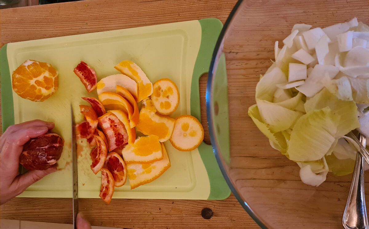 Den Chicorée in Scheiben schneiden. Die Orangen filetieren. Mit den anderen Zutaten in einer großen Schüssel vermengen und frisch servieren.