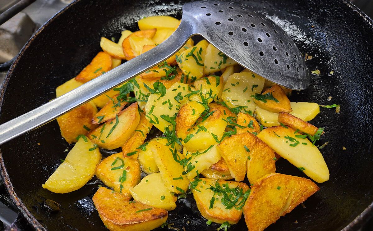 Die Kartoffeln in Salzwasser und Schale als Pellkartoffeln kochen. Schälen und in Würfel schneiden. In einer Bratpfanne in Fett anbraten. Mit Salz und Pfeffer würzen und zum Schluss mit einem Klecks Butter nochmal kross anrösten. Mit Petersilie bestreuen.