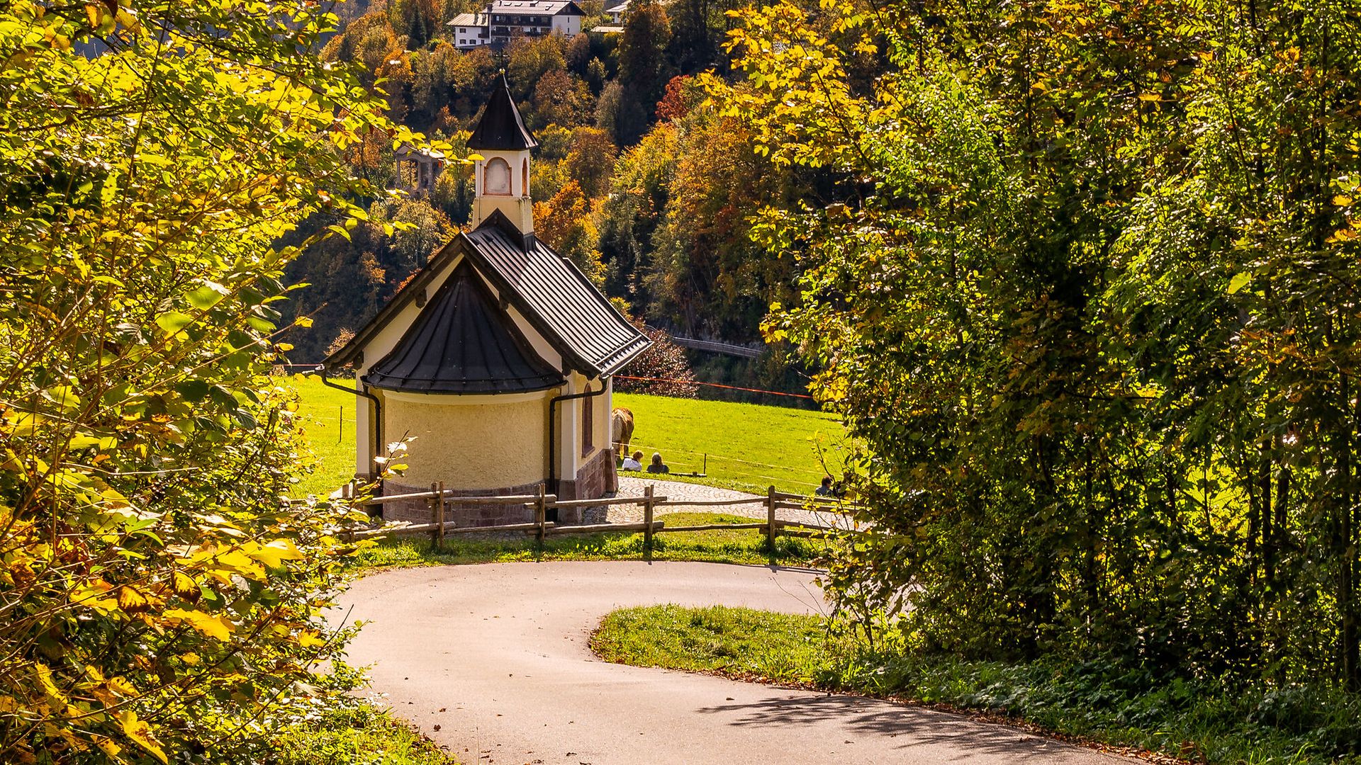 Von der Herz-Jesu-Kirche in Bischhofswiesen, Kastensteinerwand, den Maximilianreitweg, vorbei am Aschauerweiher nach Berchtesgaden. Der Weg führt durch die Stadt vorbei am AlpenCongress zum Hotel Kronzprinz, dem Soleleitungssteg, Doktorberg zum Weinfeldweg.