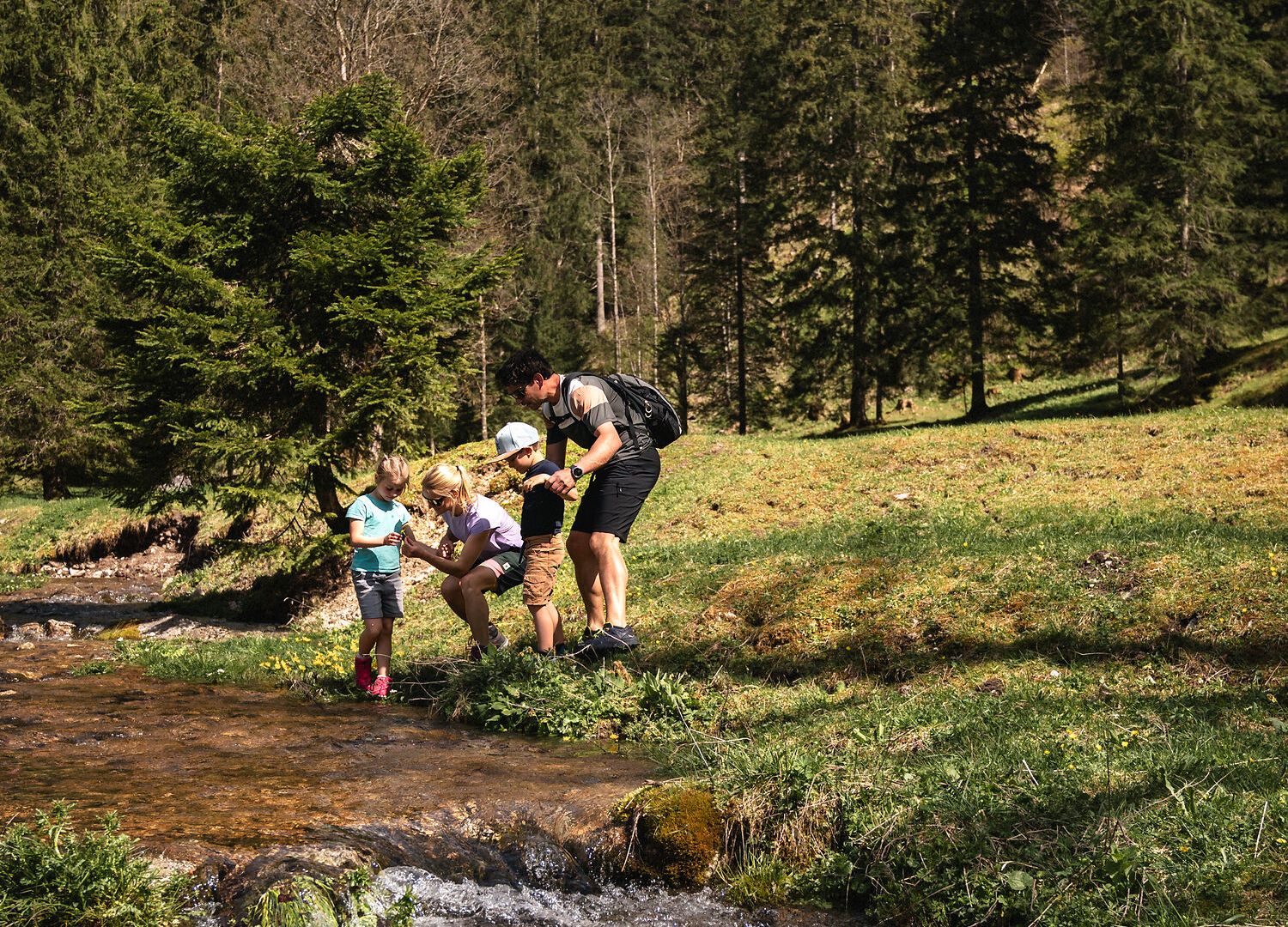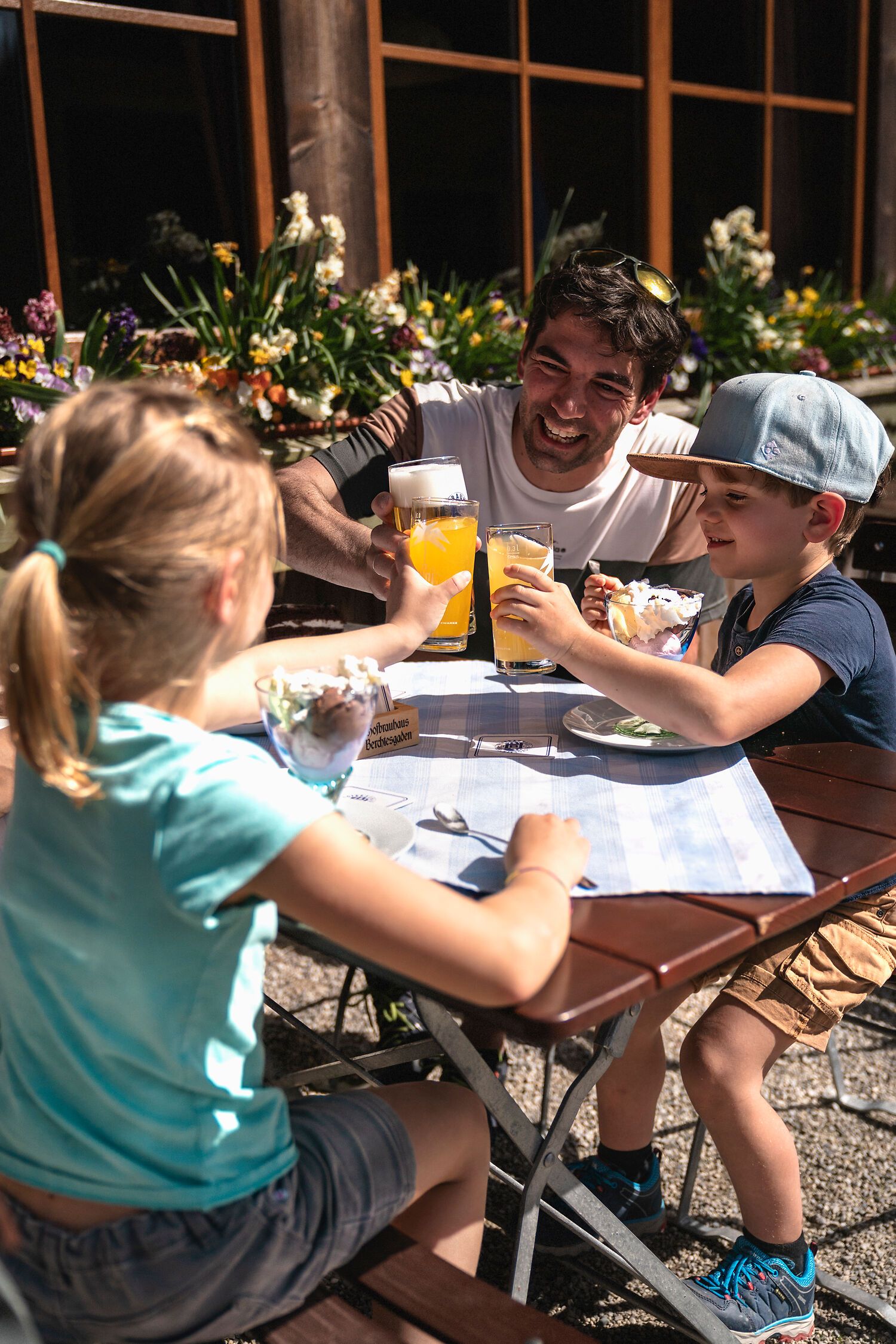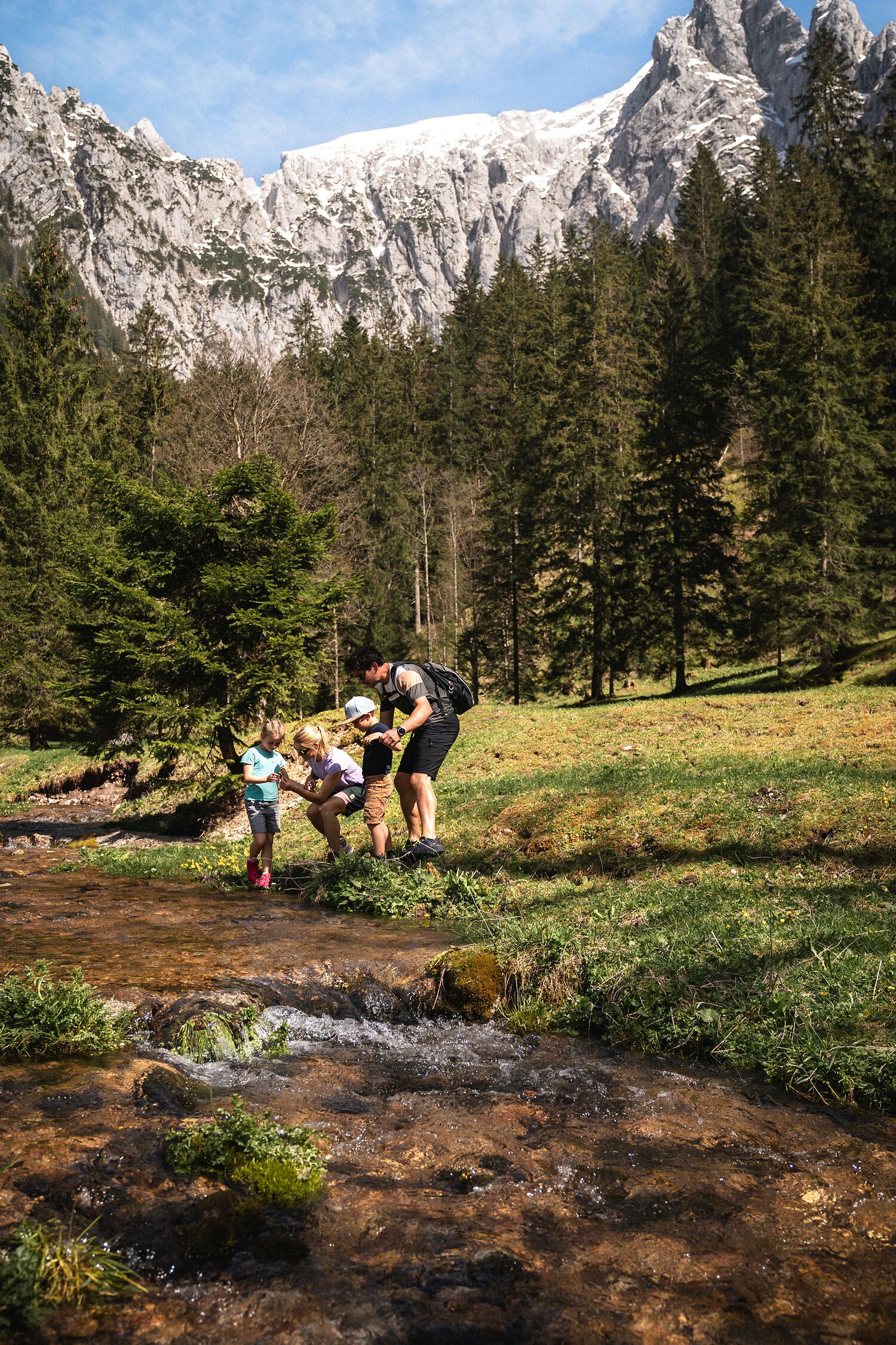Weiter wandern wir auf dem Linde-Weg zum Gasthaus Graflhöhe, besser bekannt als Windbeutelbaron. Zur Scharitzkehlalm folgen wir dem Wanderweg weiter durch den Wald, bis eine Forststraße den Wanderweg quert. Auf der Forststraße wandern wir durch einen Tunnel zum Parkplatz Klausbichel auf etwa 1.000 Meter Höhe. Von hier führt eine Wanderweg über einen Waldrücken zur Scharitzkehlalm. Am hinteren Ende der Freifläche steht die Scharitzkehlalm unter der imposanten Göll-Westwand.