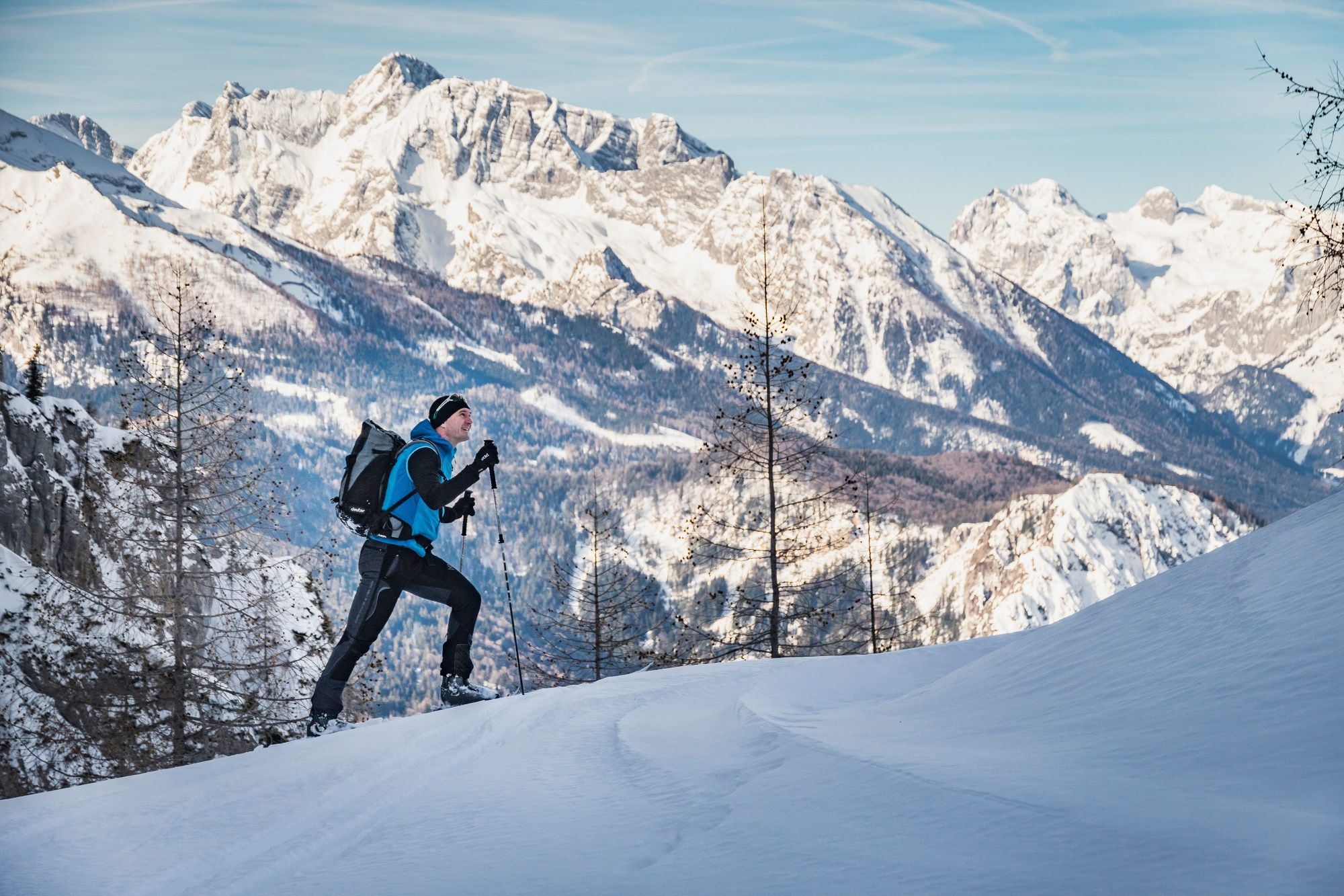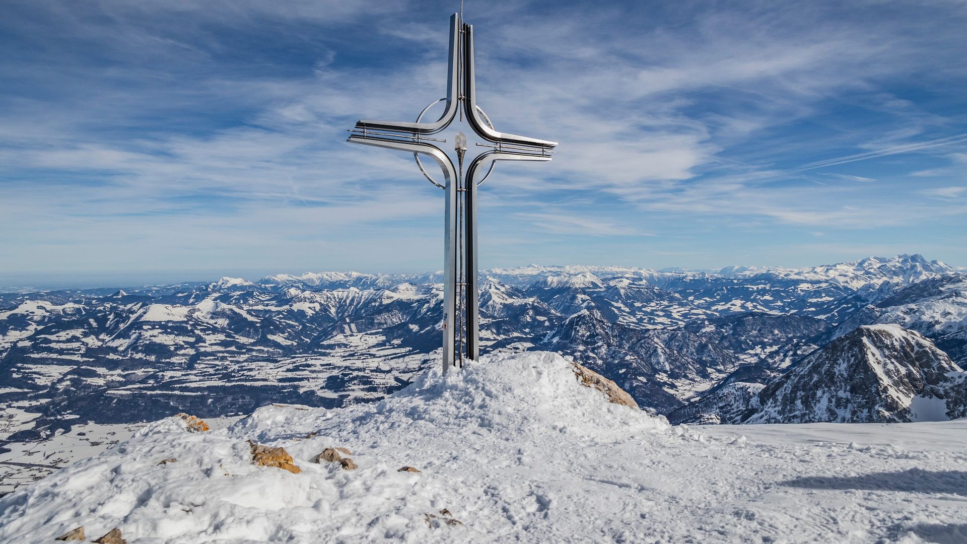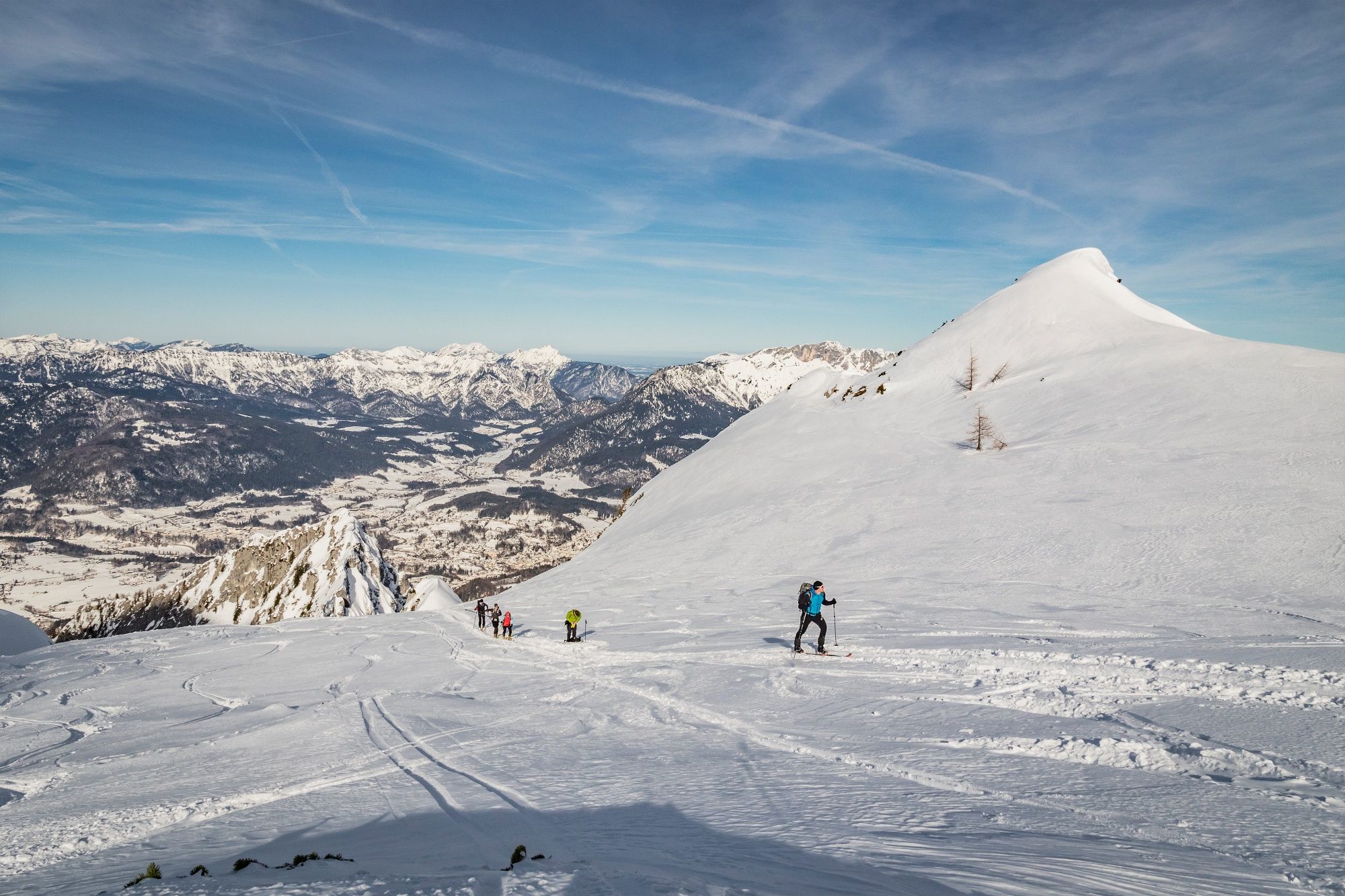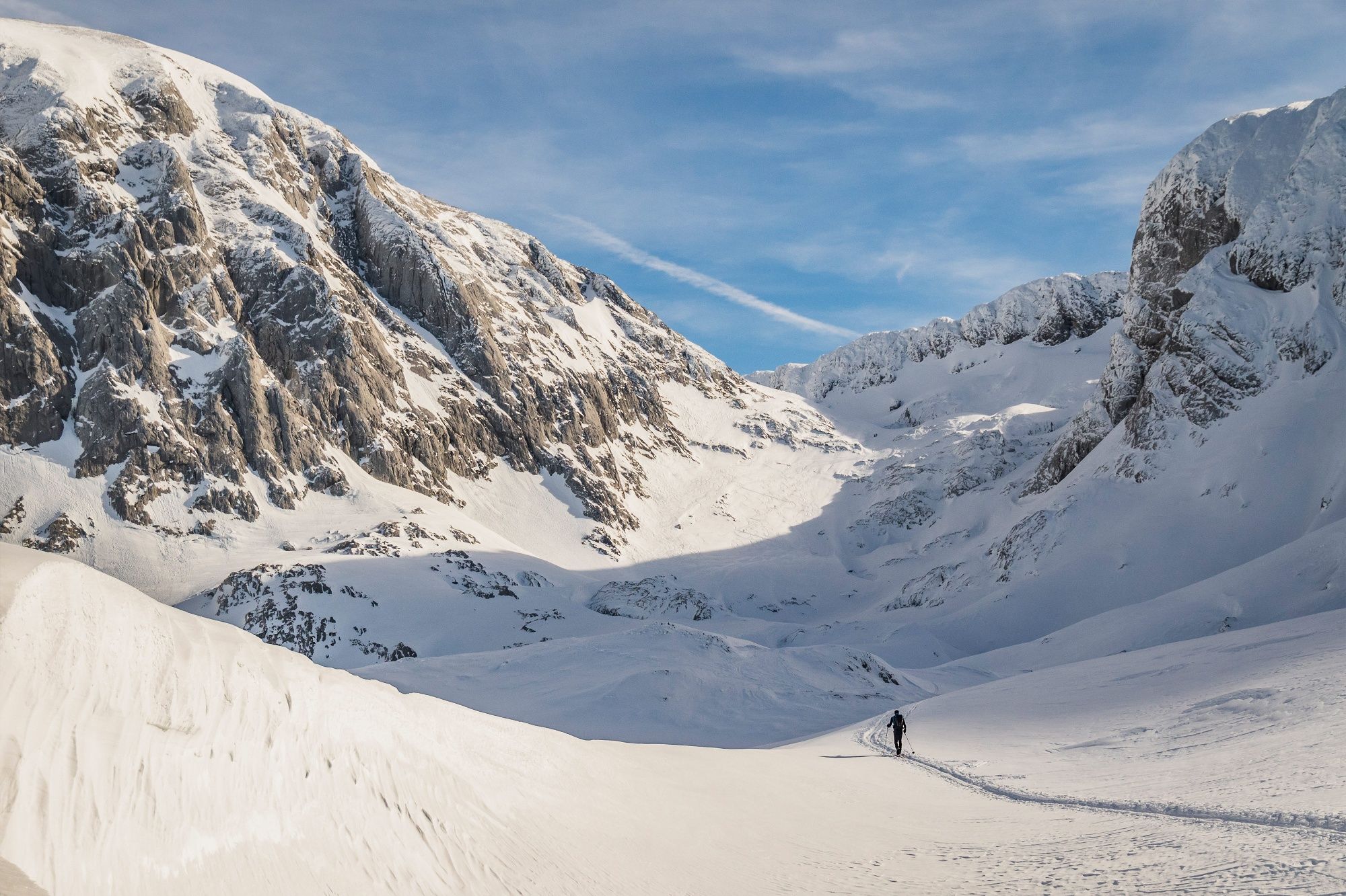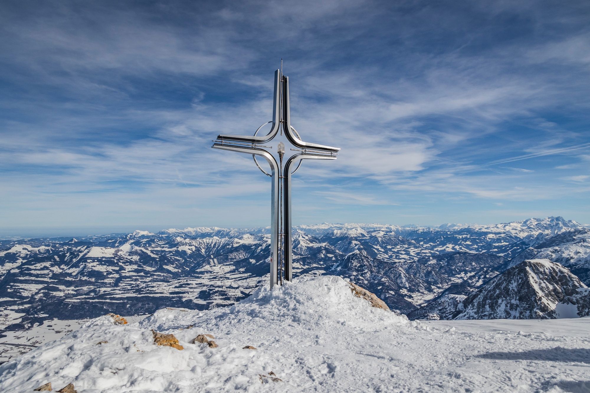 Die Skitour auf den Hohen Göll führt entlang des Sommerweges durch eine rinnenartige Schneise hinauf. Schon nach einer Viertelstunde sieht man links die Felswand, die es auf einem schmalen, etwas ausgesetzten, drahtseilgesicherten Band von rechts nach links zu queren gilt. Nun wiederum durch eine rinnenartige Schneise empor bis zu einer ca. 10m hohen Felsstufe. Hier je nach Verhältnissen entweder zu Fuß über die Felsen (dann eher links) oder mit Ski (dann meist rechts) hinauf. Über einen Steilhang lenkt einen das enge Alpeltal in einen kleinen, flacheren Kessel. Leicht linkshaltend in den Kessel und über die anschließende sehr steile Stufe hinauf. Man überwindet sie am besten von links unten nach ganz rechts oben hinausquerend. Dann noch auf einen Absatz (ca. 1850m) hinauf, der den Beginn des riesigen Kares markiert. Flach entlang eines Rückens, dann rechtshaltend durch das Muldengelände. Am Ende wechselt man von der rechten Talseite auf die linke und steigt über eine weitere Stufe in südöstlicher Grundrichtung zur Göllscharte hinauf. Jetzt links, Richtung Norden, auf dem steilen, breiten Rücken empor zu einem Vorgipfel mit Kreuz). Weiter entlang des Kammes, die riesigen Wächten beachtend!, zum Gipfel und hier noch einmal ein Stück steil empor zum höchsten Punkt.