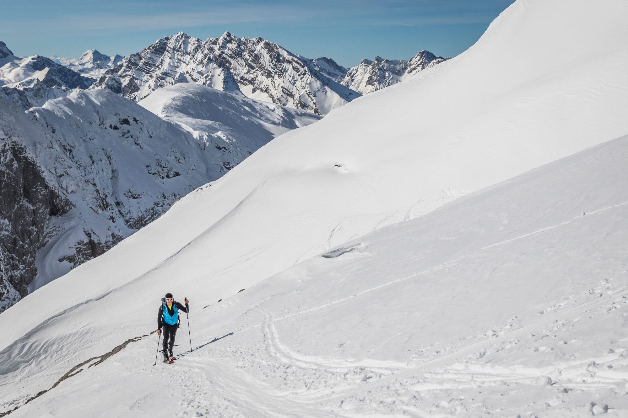 Die Abfahrt erfolgt entlang des Aufstiegsweges wobei man bei sicheren Verhältnissen auch durch die steile Rinne (parallel zum Rücken, welcher sich von der Göllscharte heraufzieht) einfahren kann.
